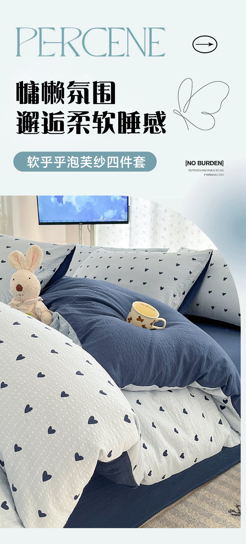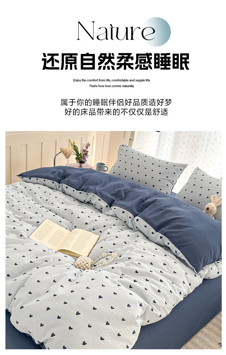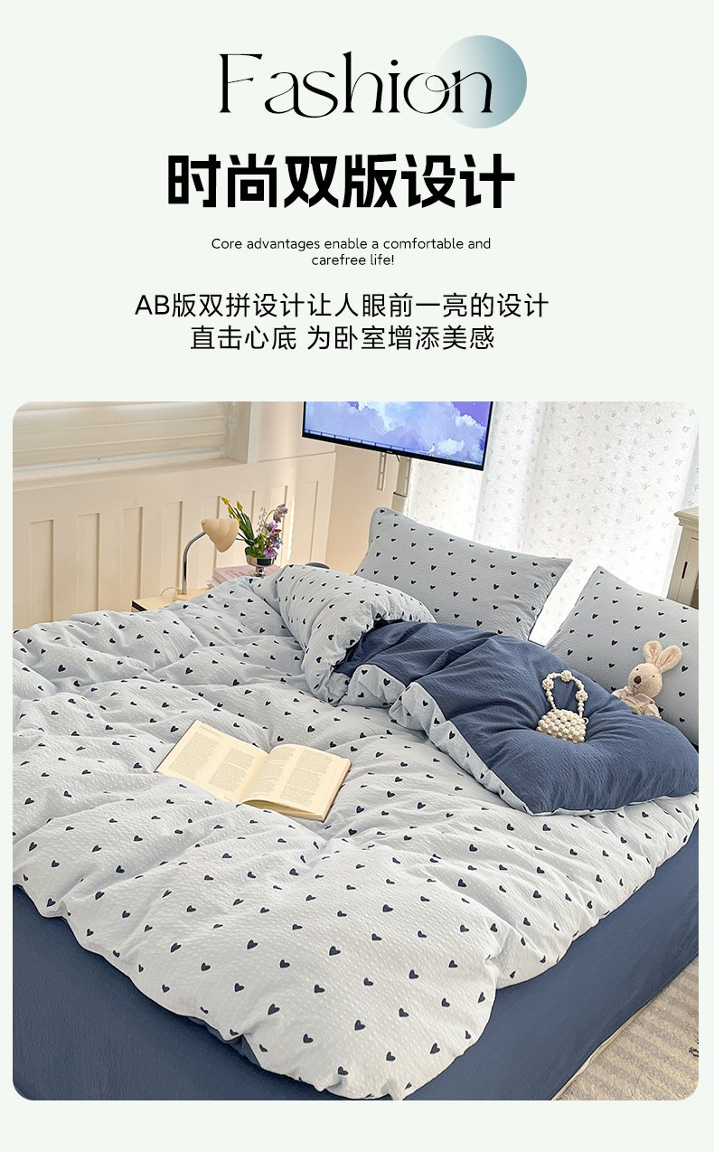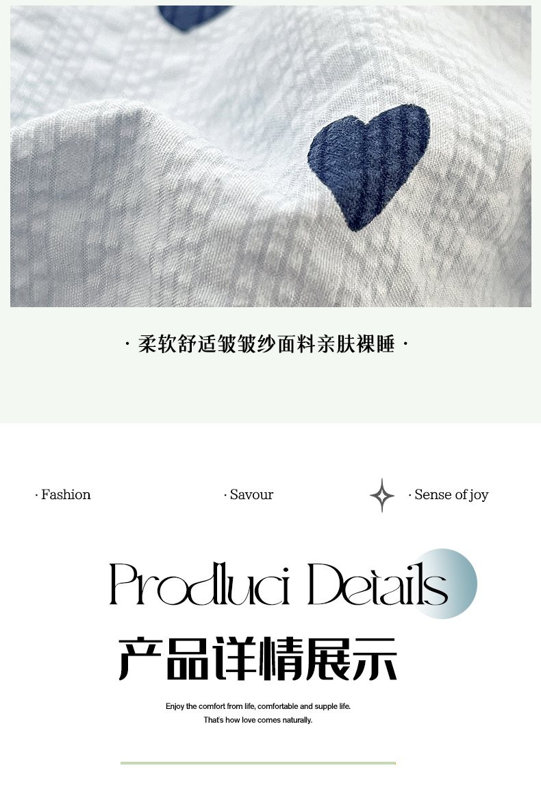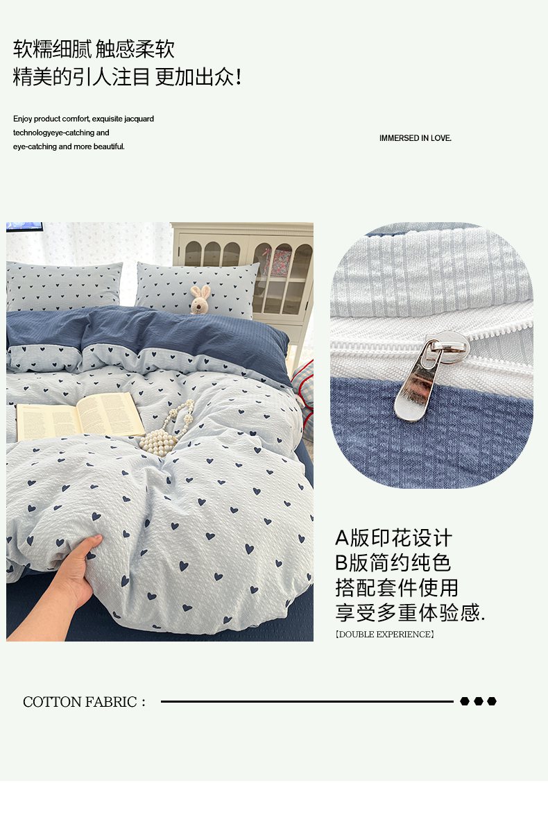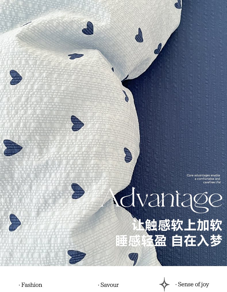 当前位置: 91家纺网 > 商品网购 > 床品套件 > 四件套 > 其它四件套 > 玉海棠家纺 2026新款直播爆款高品质高克重泡泡纱泡芙纱四件套 蓝调心心