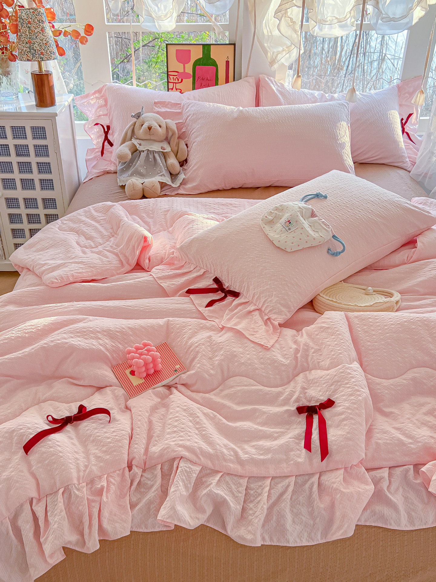(总)爱彼家纺 2026春夏新款提花泡芙棉拼角蝴蝶结软乎乎的撸猫感单夏被夏被四件套-甜莓气泡,泡芙夏被-海盐蓝波点,泡芙夏被-奶粉波点,泡芙夏被--奶红波点,泡芙夏被--奶灰波点,组合图仅供参考不可下单