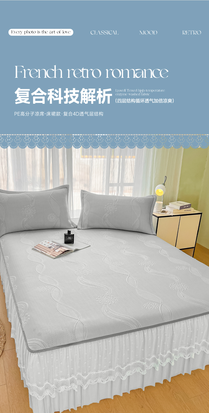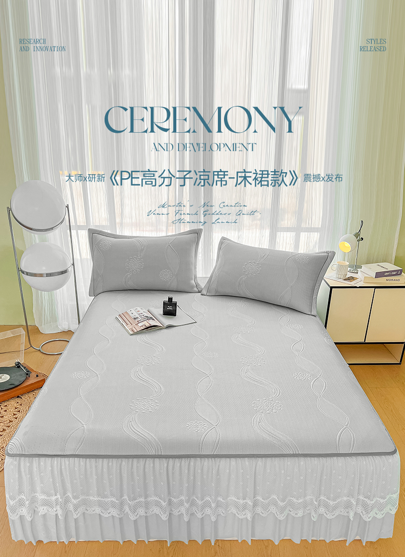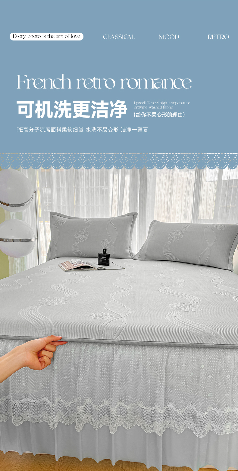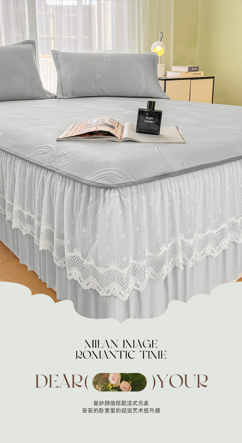 库里梦家纺 2026新款高克重复合蕾丝花边PE高分子凉席-床裙款 芳菲-灰色