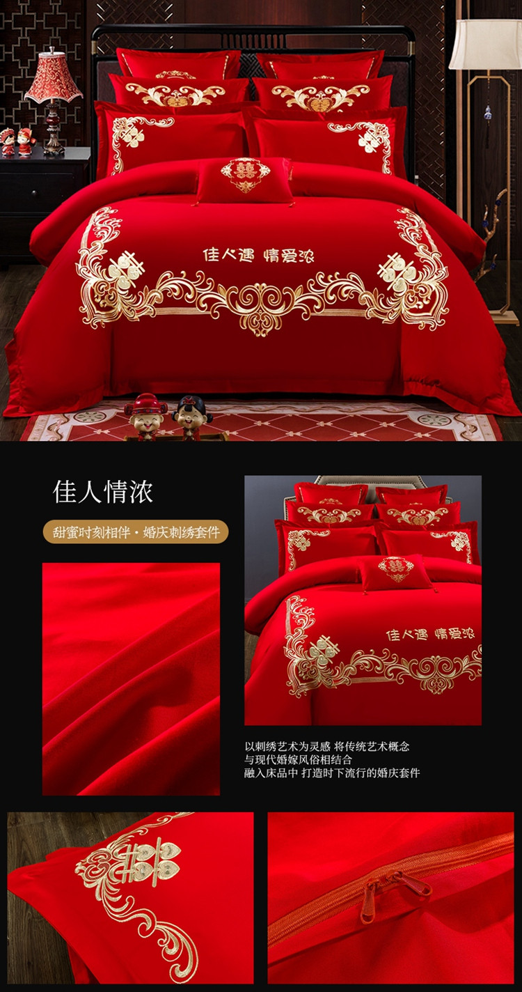 慕她婚庆四件套大红色大花结婚全棉纯棉刺绣花多件套直播 佳人情浓