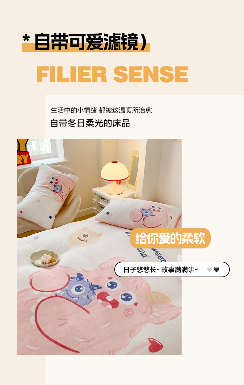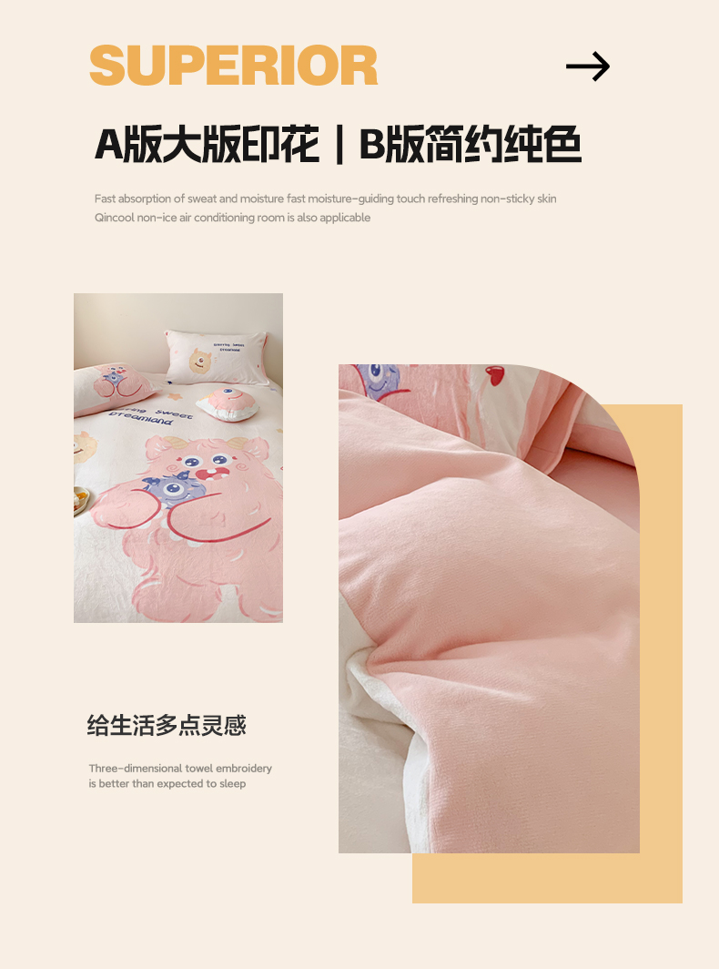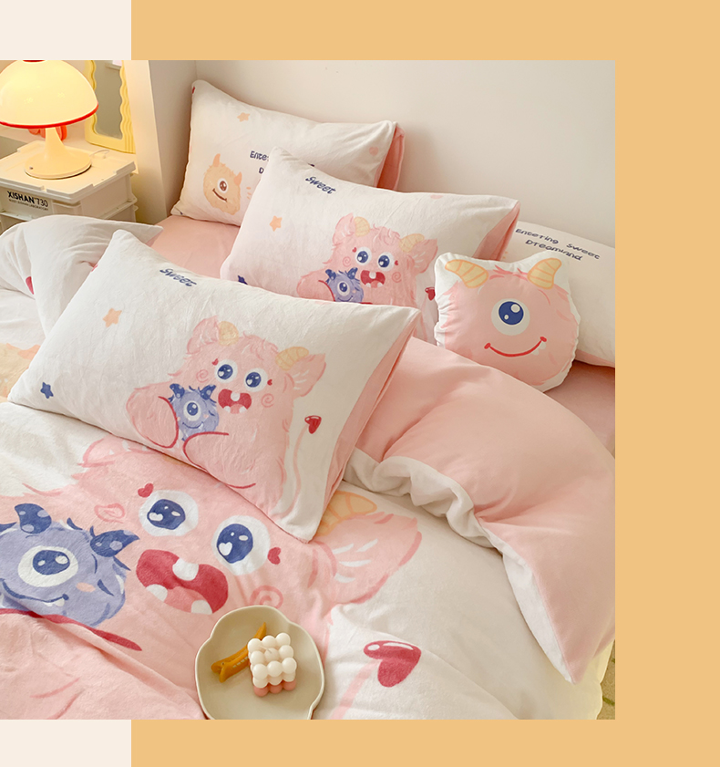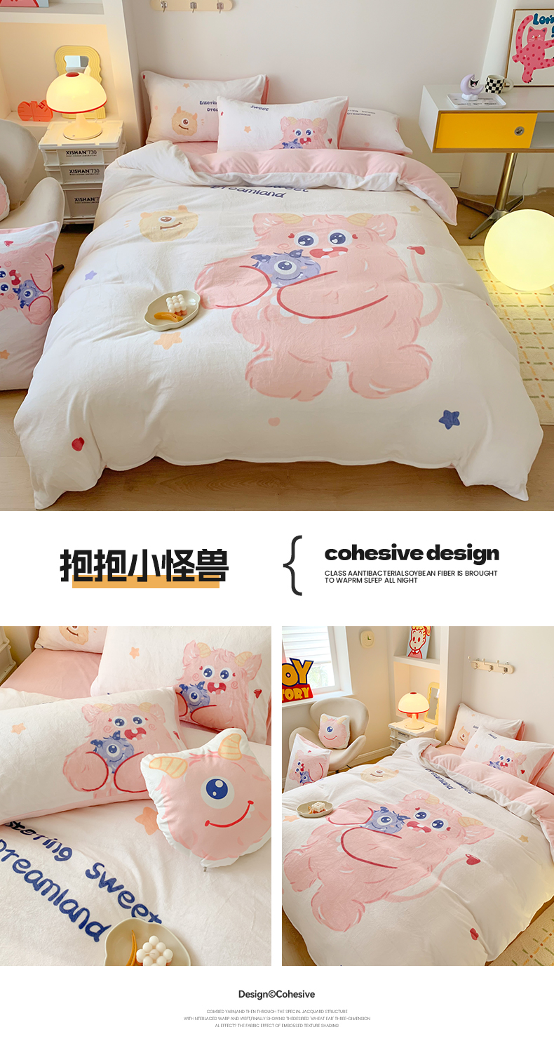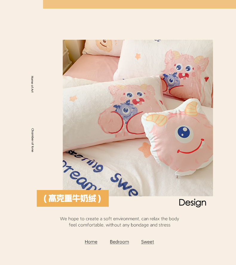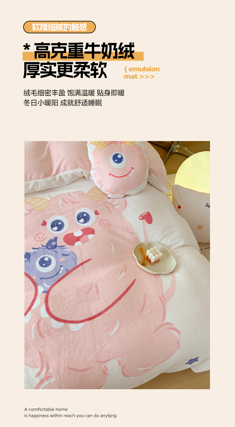 商品名称:澳萝拉2023新款大版数码牛奶绒五件套配送同款小抱枕 抱抱小怪兽