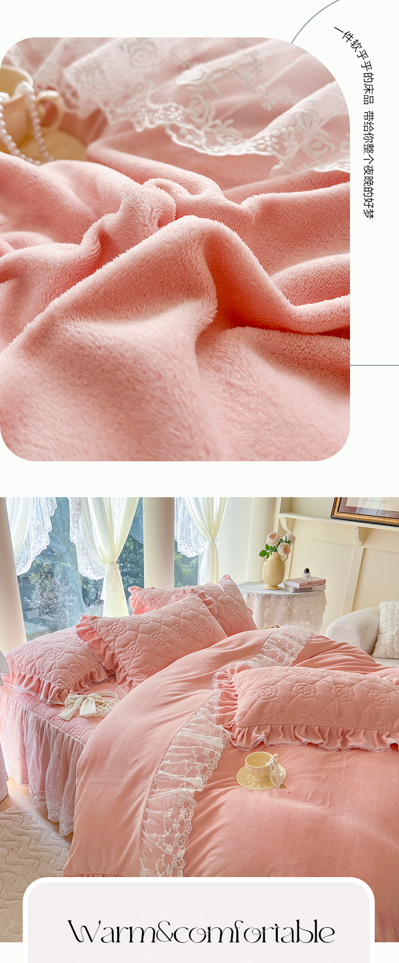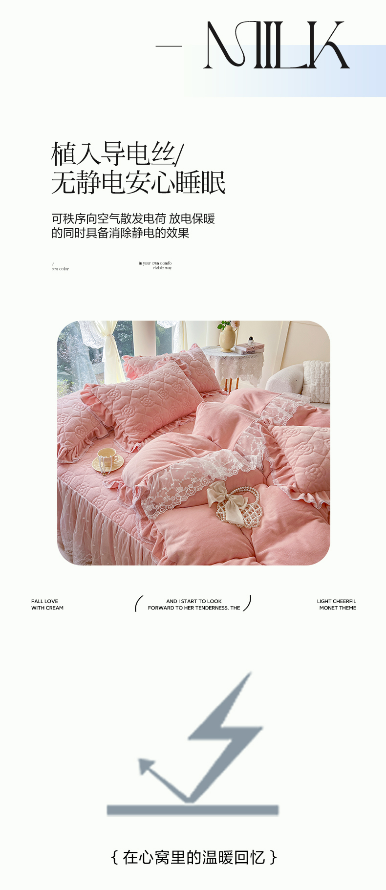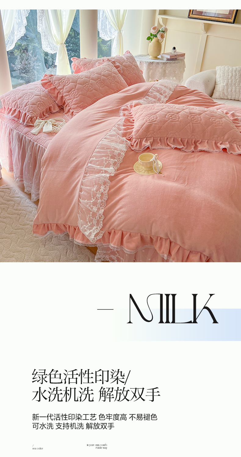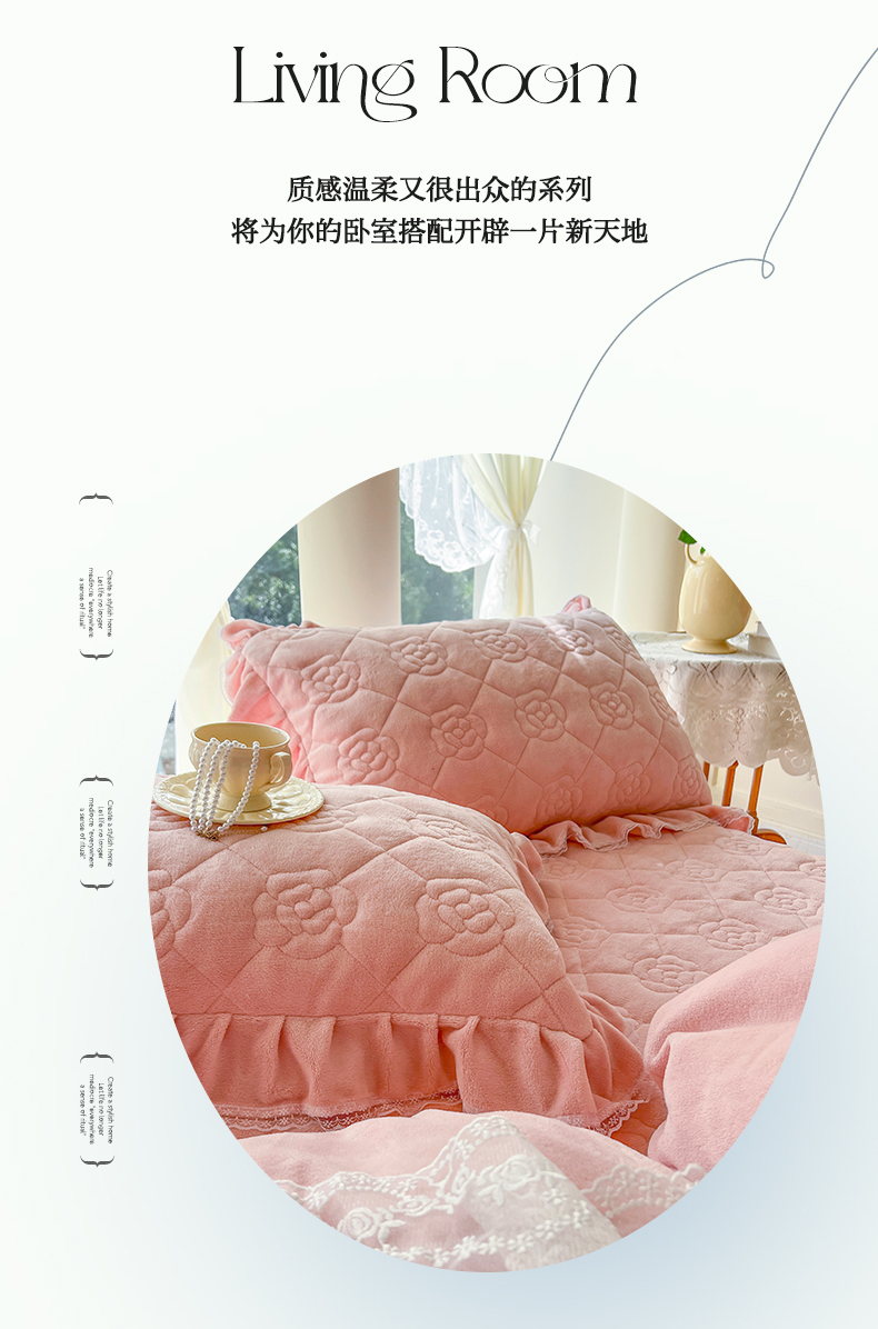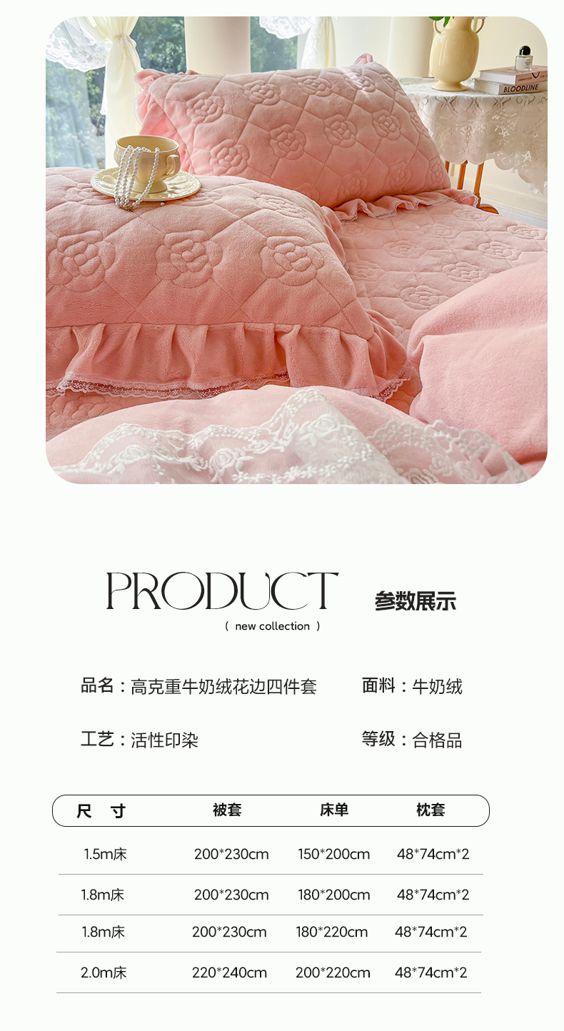 当前位置: 91家纺网 > 商品网购 > 床品套件 > 四件套 > 牛奶绒四件套 > 麒豆豆 2023新款高克重牛奶绒花边床裙四件套-山茶系列 山茶-粉