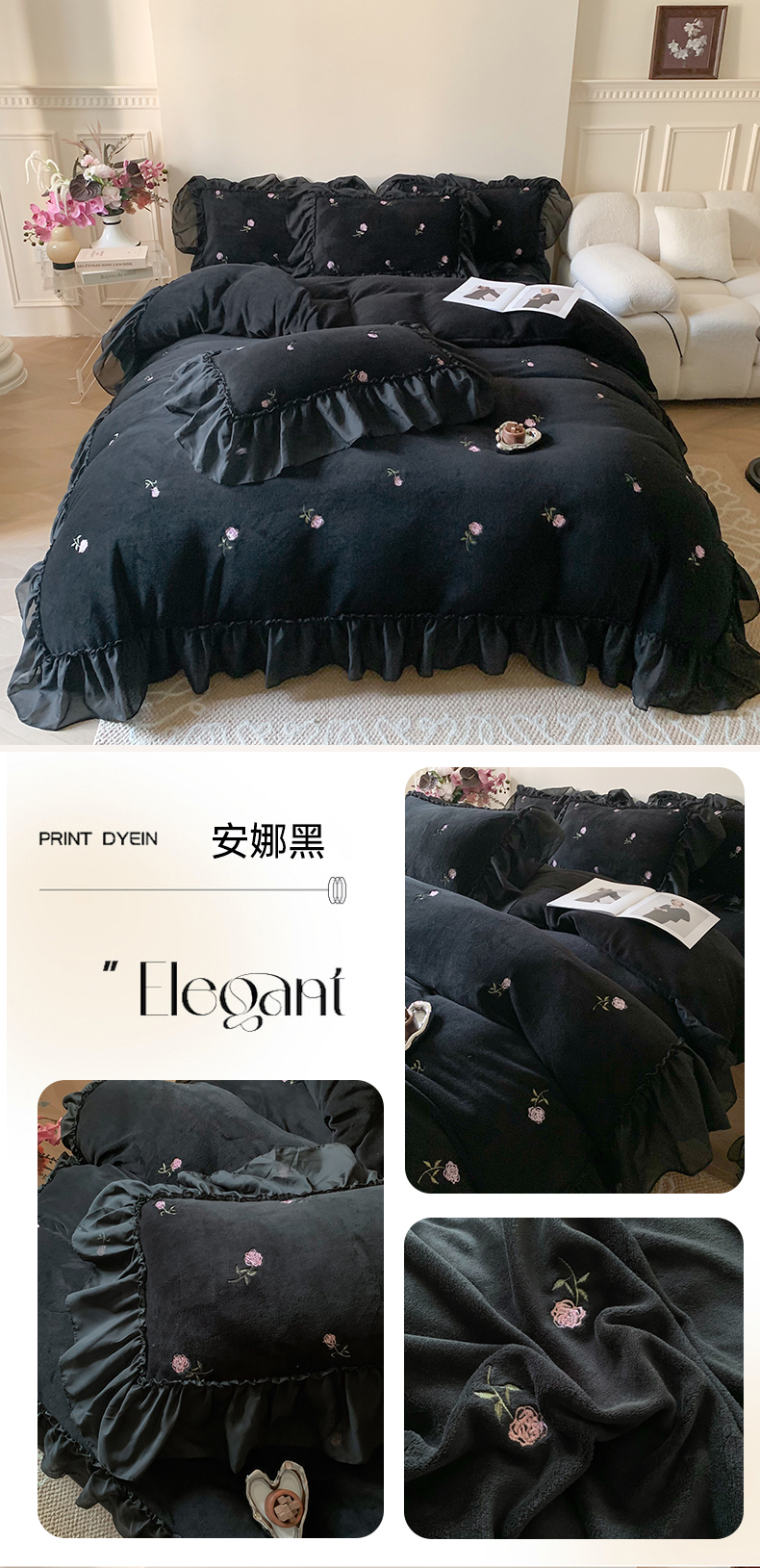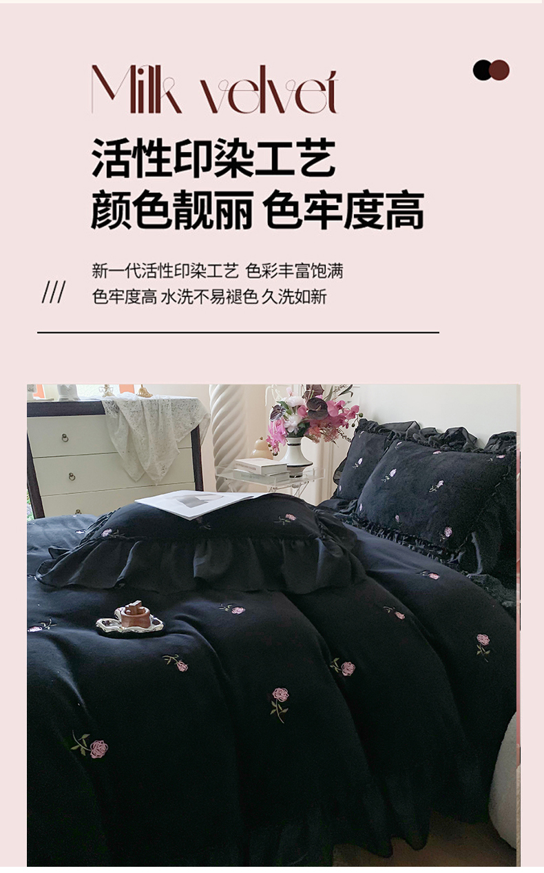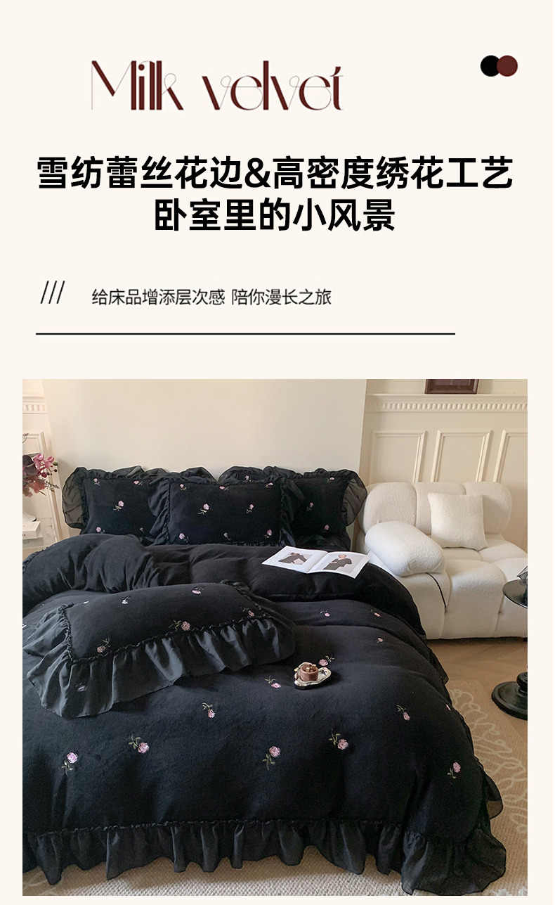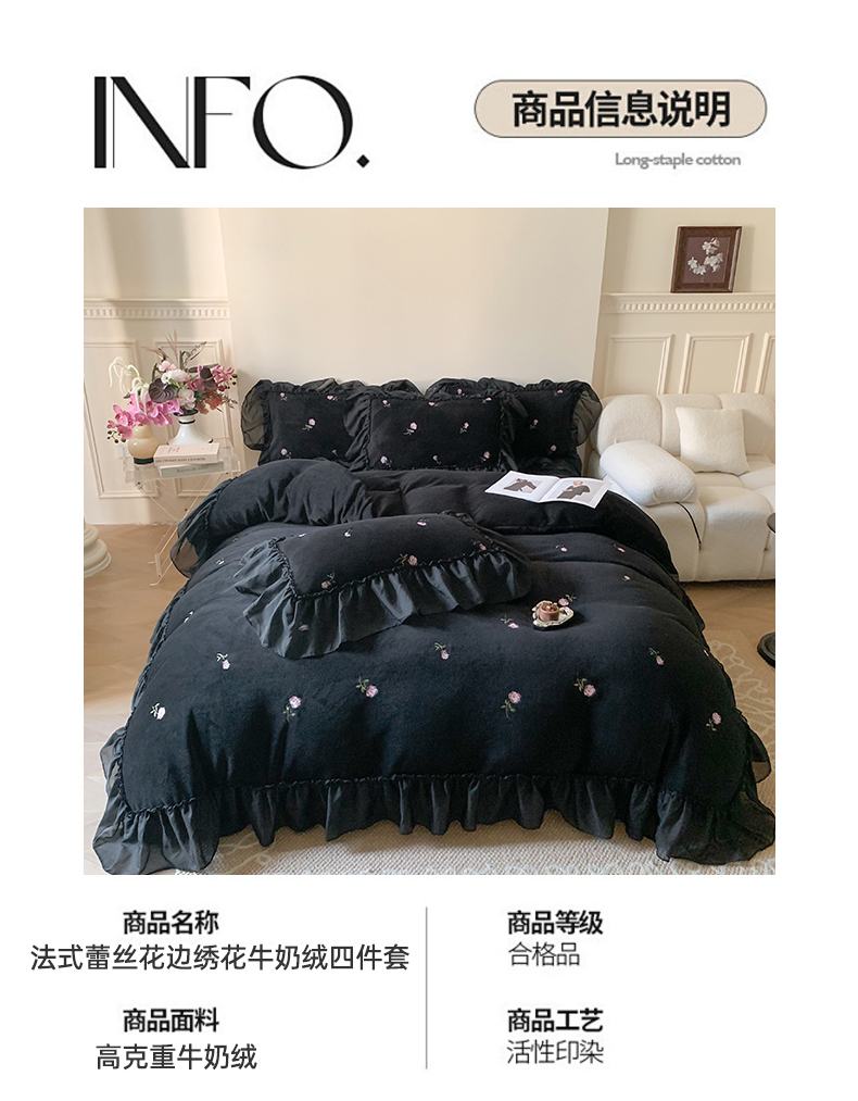当前位置: 91家纺网 > 商品网购 > 床品套件 > 四件套 > 牛奶绒四件套 > 你好美丽 2025新款A类200克牛奶绒安娜满版刺绣花边四件套 安娜黑