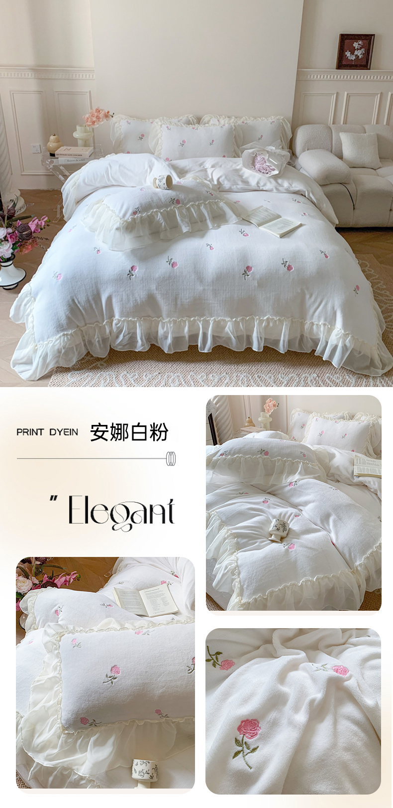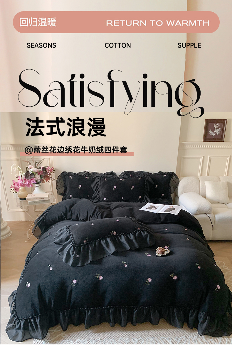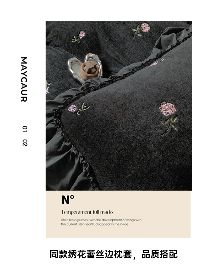 当前位置: 91家纺网 > 商品网购 > 床品套件 > 四件套 > 牛奶绒四件套 > 你好美丽 2025新款A类200克牛奶绒安娜满版刺绣花边四件套 安娜黑