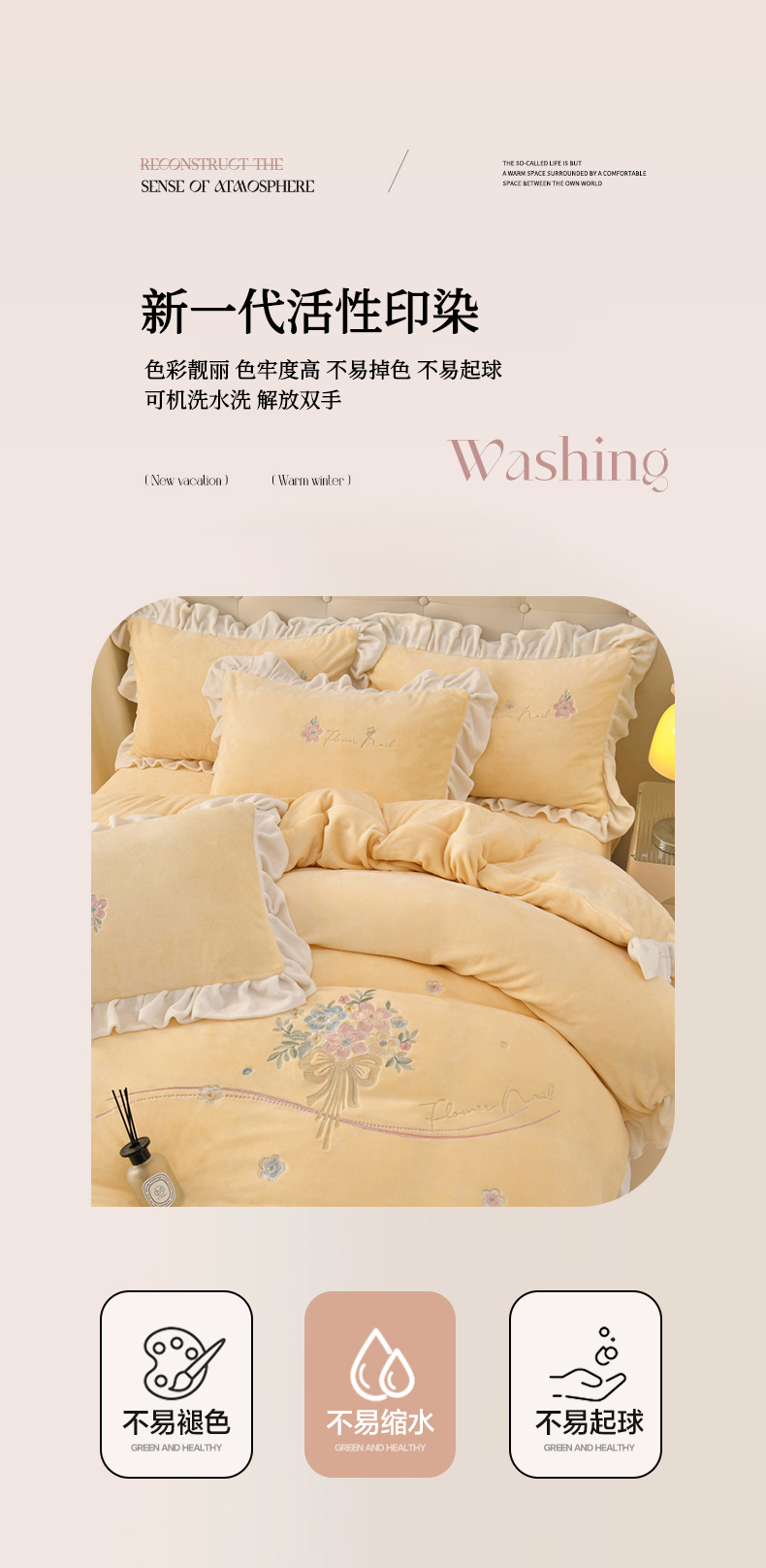 商品名称:梦之星 2025新款刺绣韩式花边牛奶绒四件套 花束-淡黄