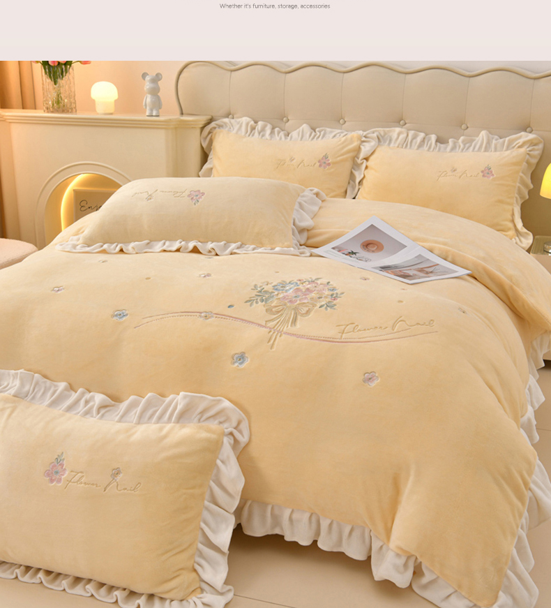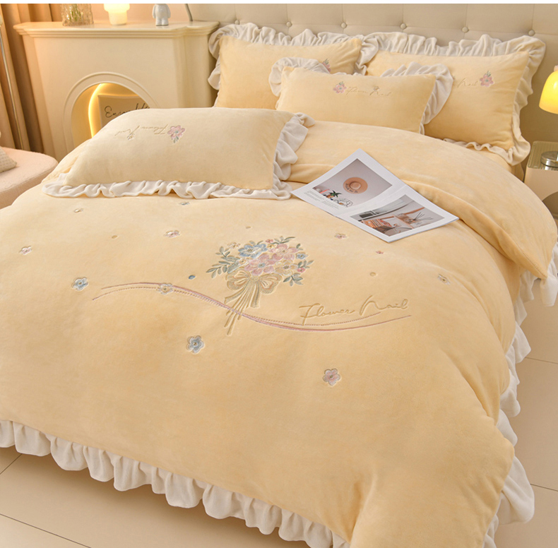 梦之星 2025新款刺绣韩式花边牛奶绒四件套 花束-淡黄