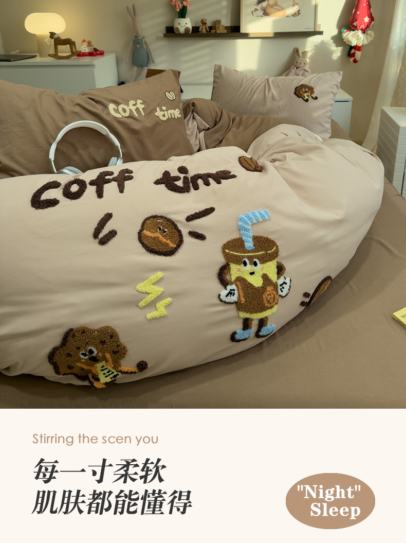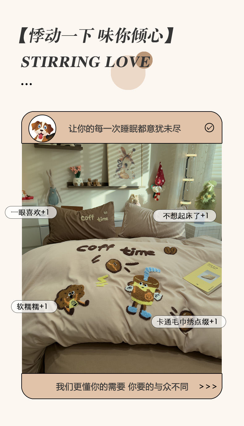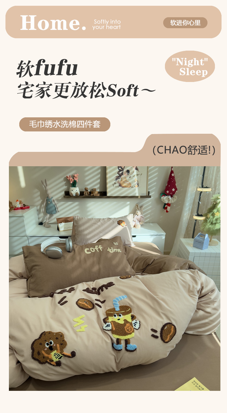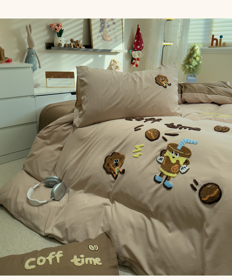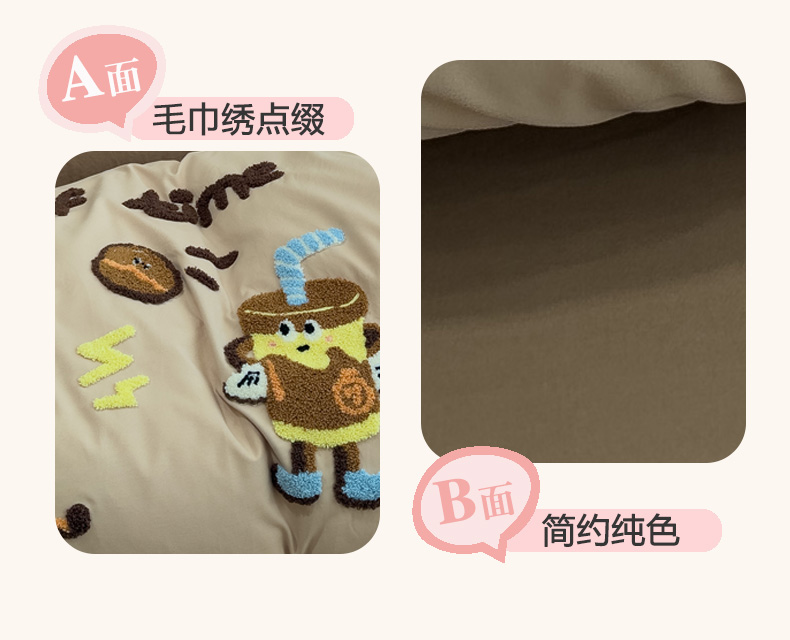 当前位置: 91家纺网 > 商品网购 > 床品套件 > 四件套 > 毛巾绣四件套 > 曼谷家纺 2026新款卡通水洗棉毛巾绣四件套被套 咖啡时光-奶咖