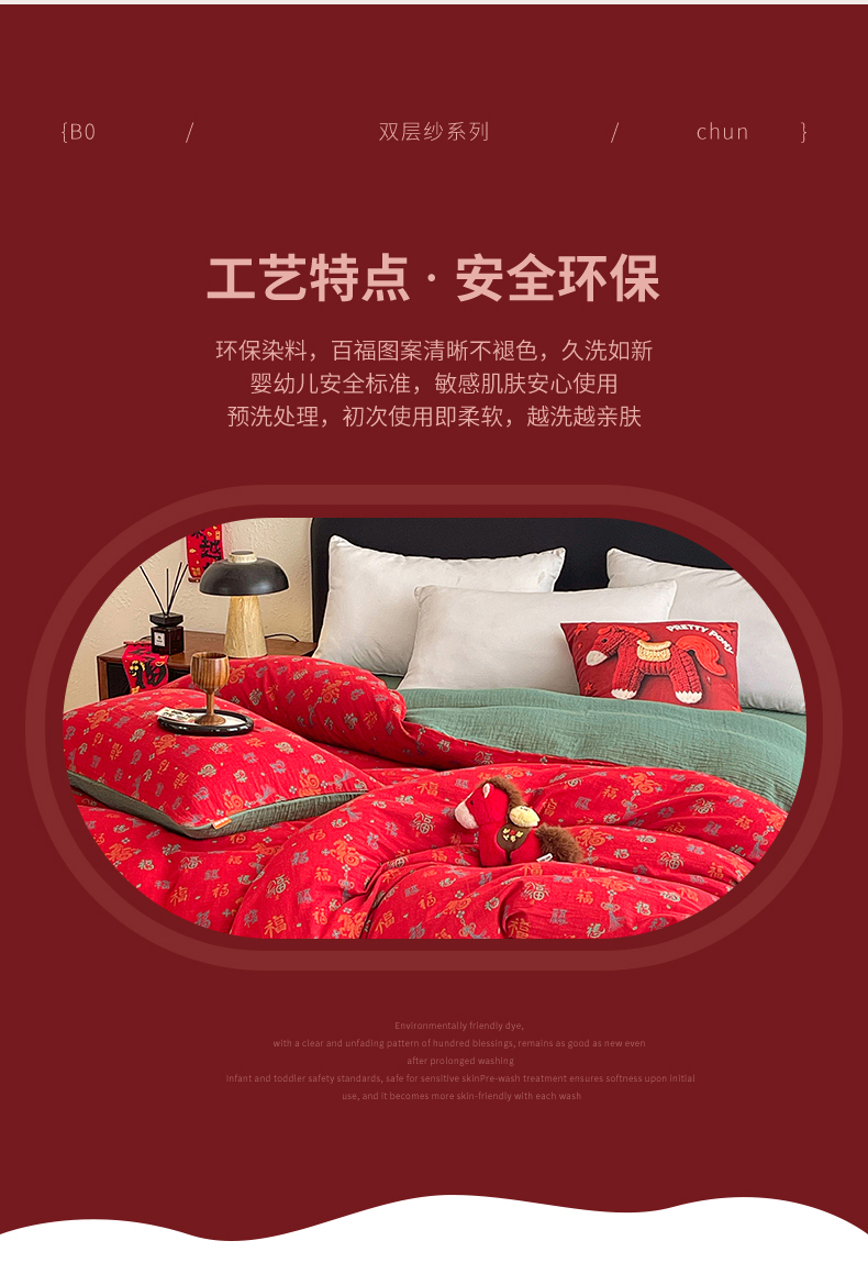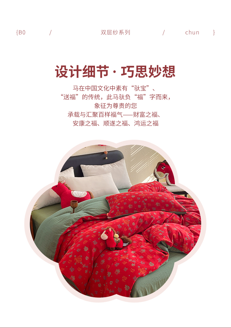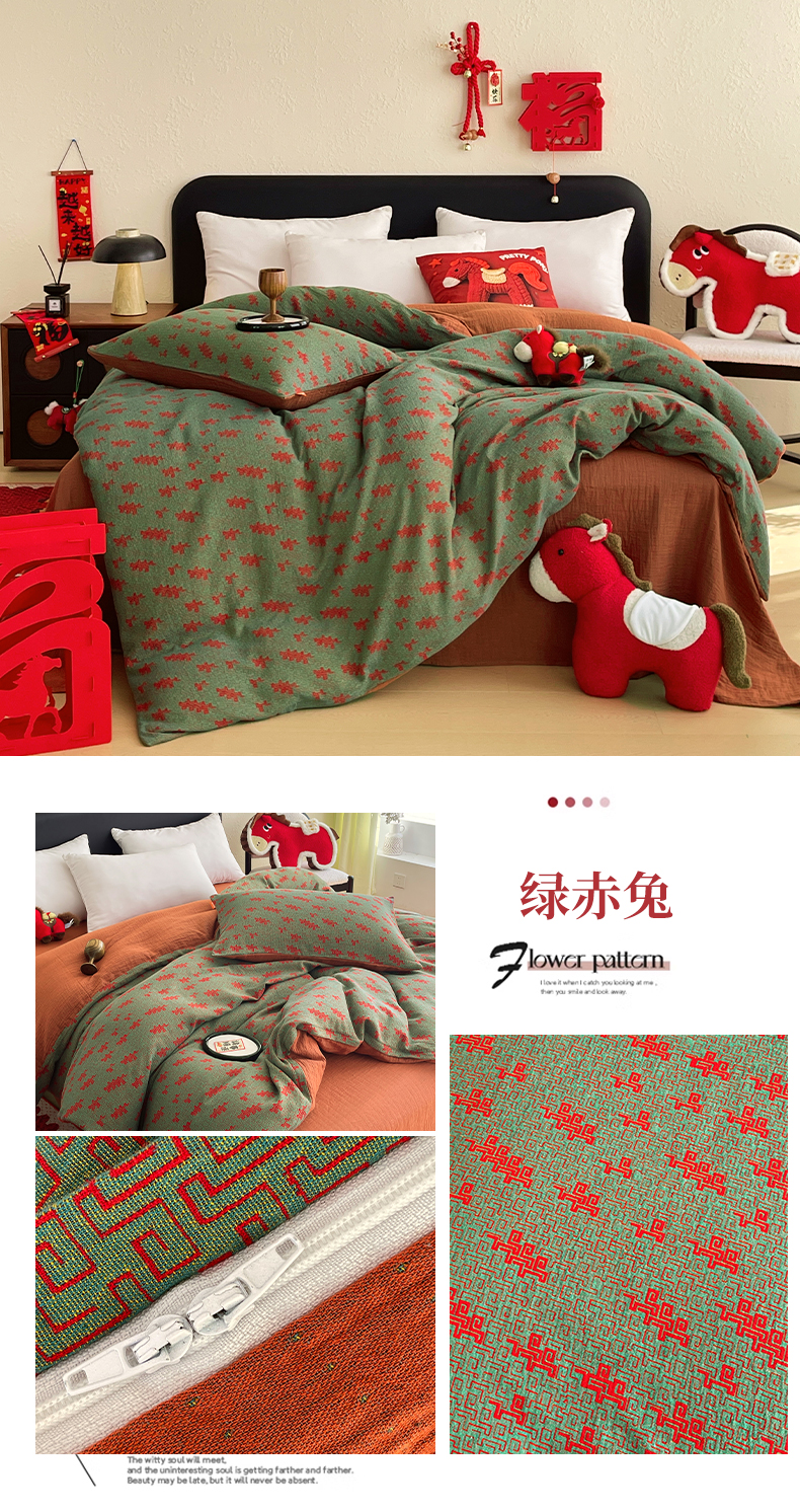 (总)春皖家纺 2026新款全棉色织双层纱提花百福系列拉链款-四件套,红百福,红赤兔,红福马,绿赤兔,绿福马,红绝影,绿绝影