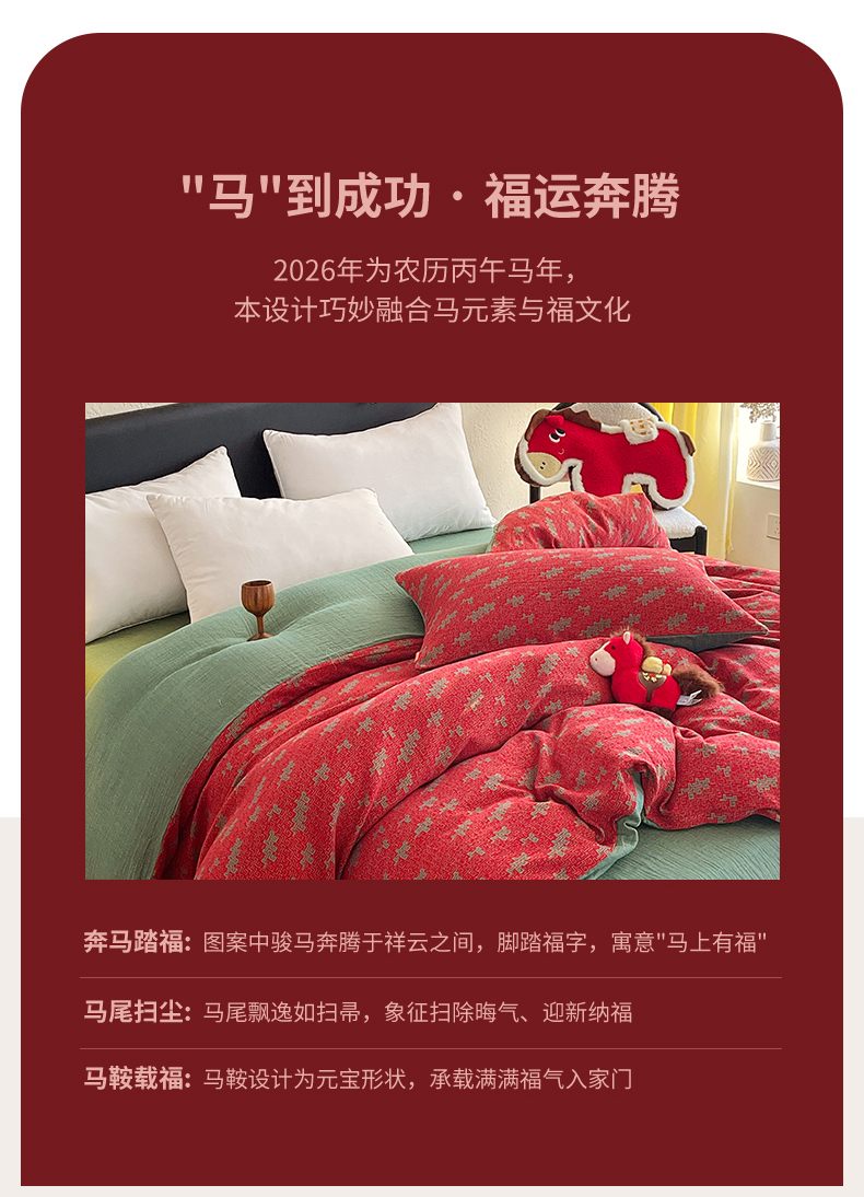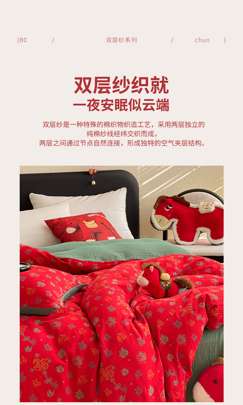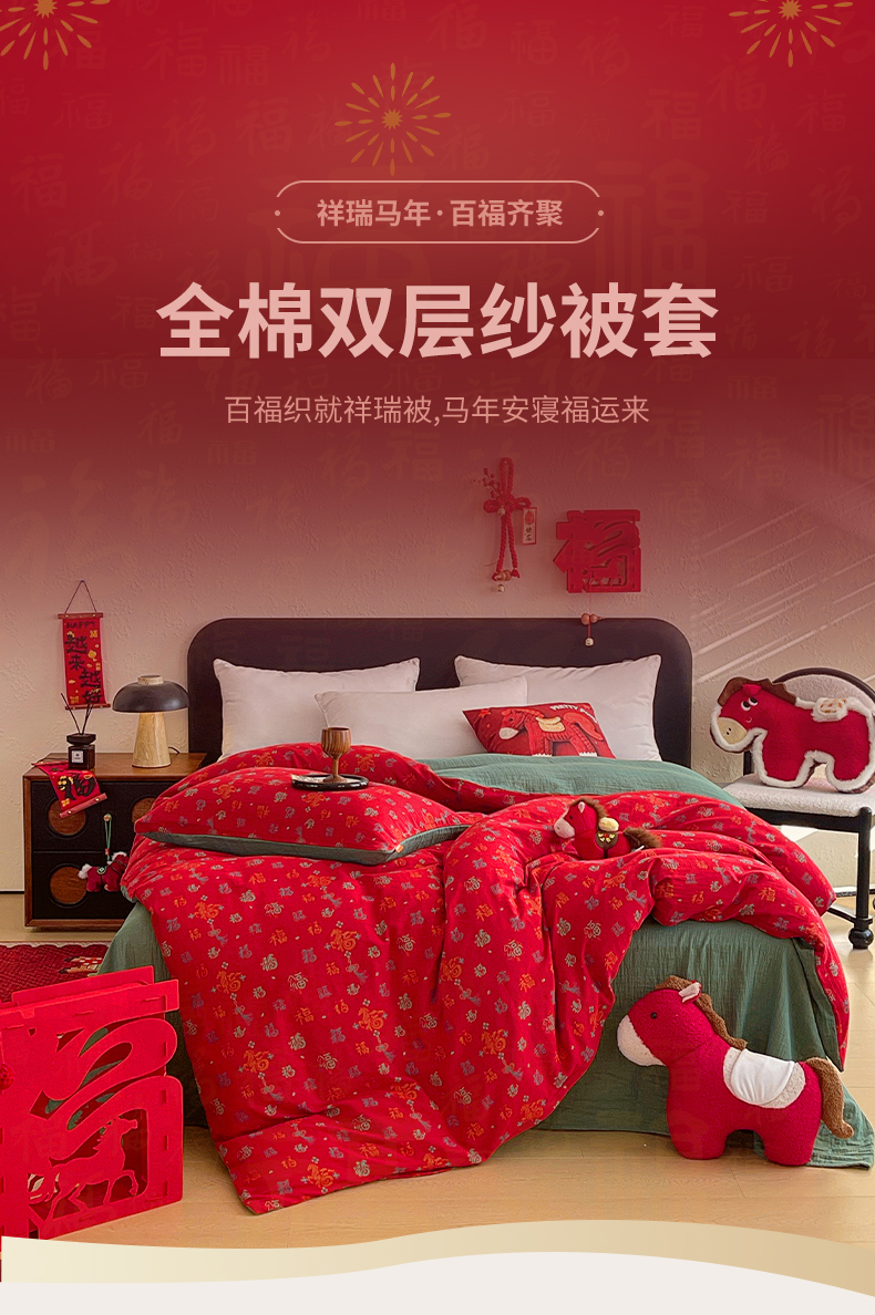 春皖家纺 2026新款全棉色织双层纱提花百福系列拉链款-单被套 红福马