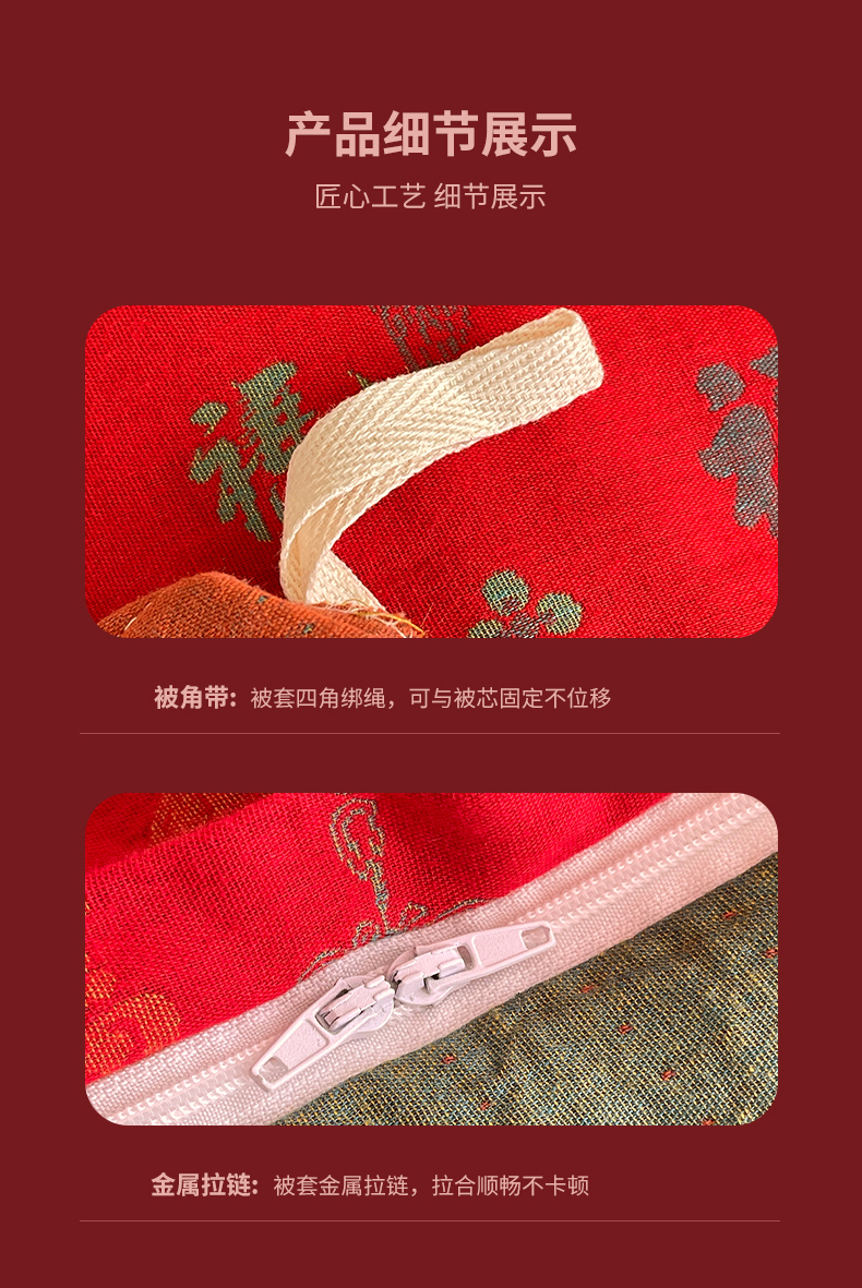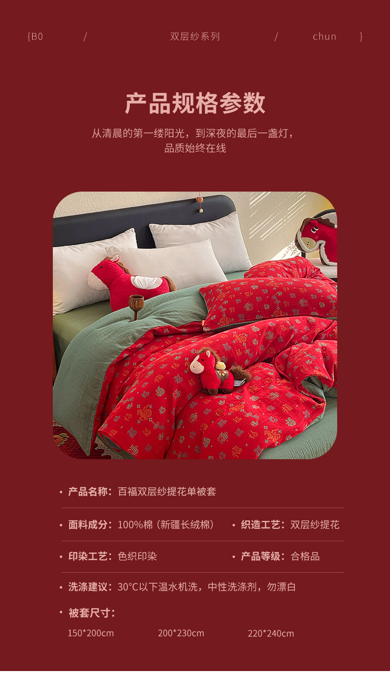 商品名称:春皖家纺 2026新款全棉色织双层纱提花百福系列拉链款-单被套 红福马