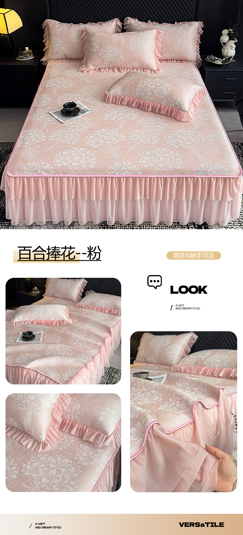• 91家纺网 家纺一手货源 找家纺 (总)家之硕家纺 2026新款精仿棉夹棉床裙三件套,彩韵,春芽,多丽粉,花恋,漫漫花开,倾城繁花,甜蜜花园,遇见浪漫