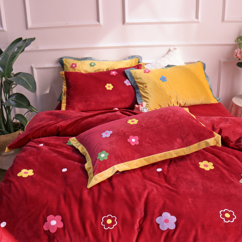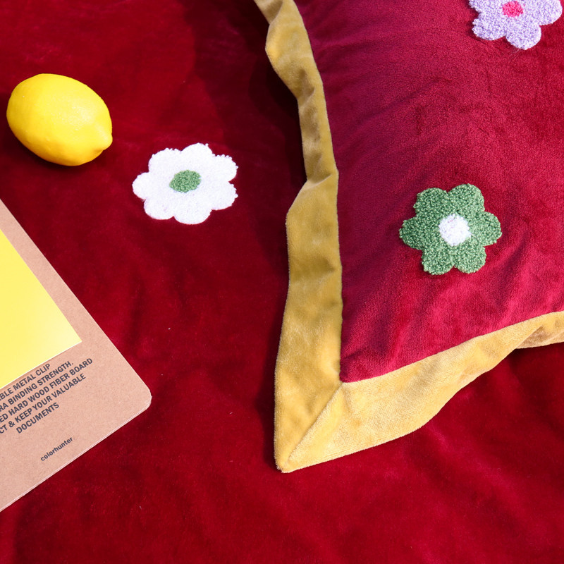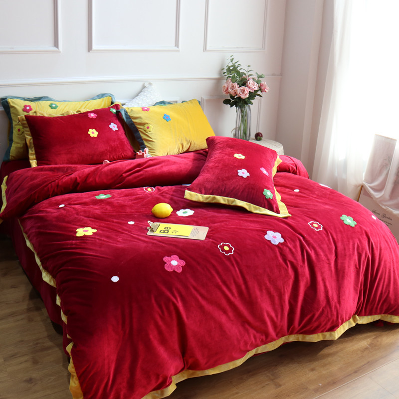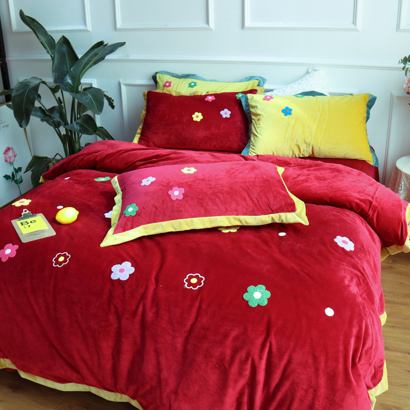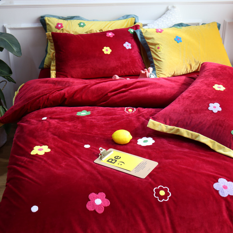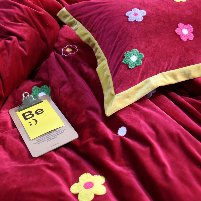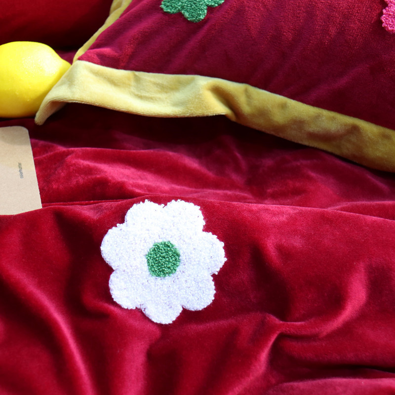 润缦 2019 ins泫雅风宝宝绒四件套牛奶绒四件套 可爱花朵-酒红色