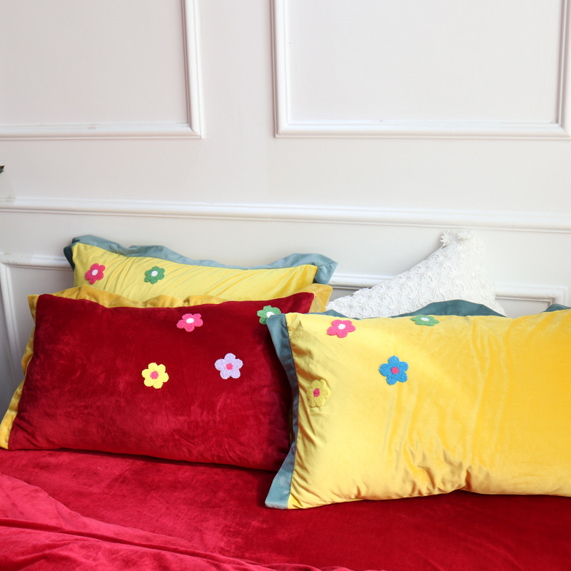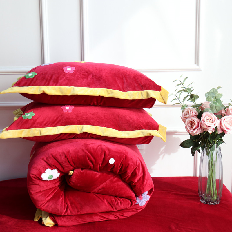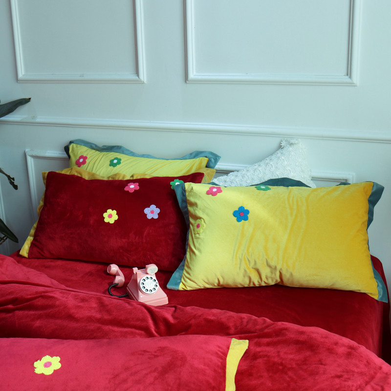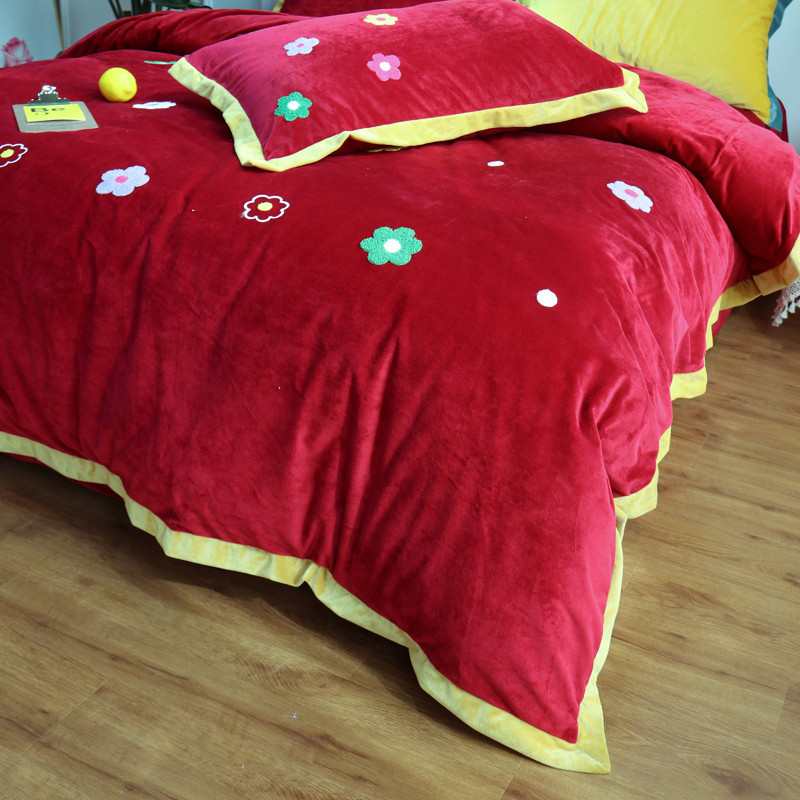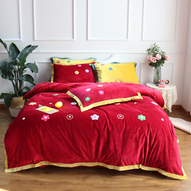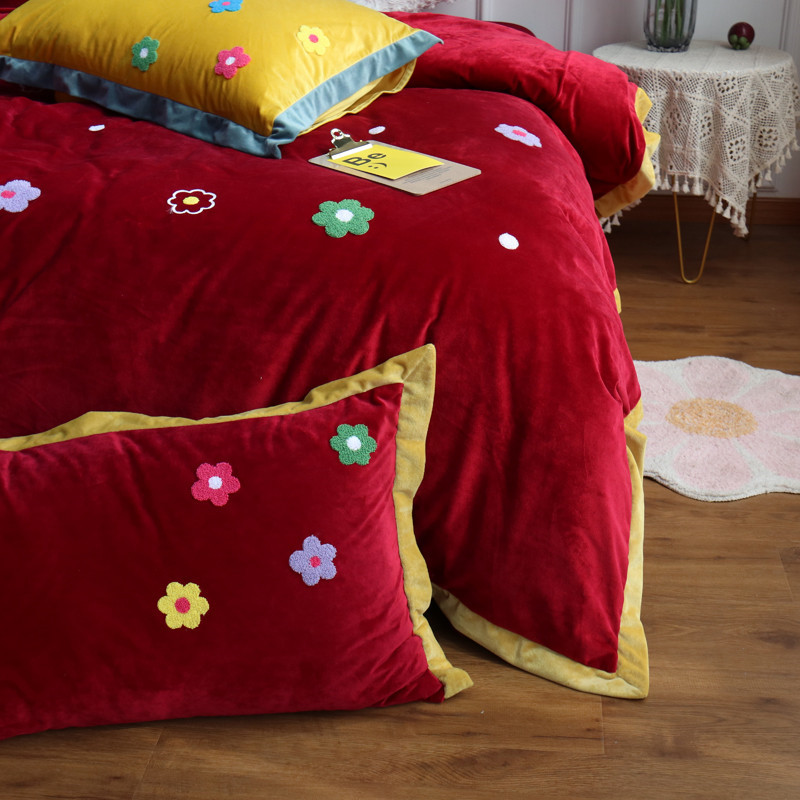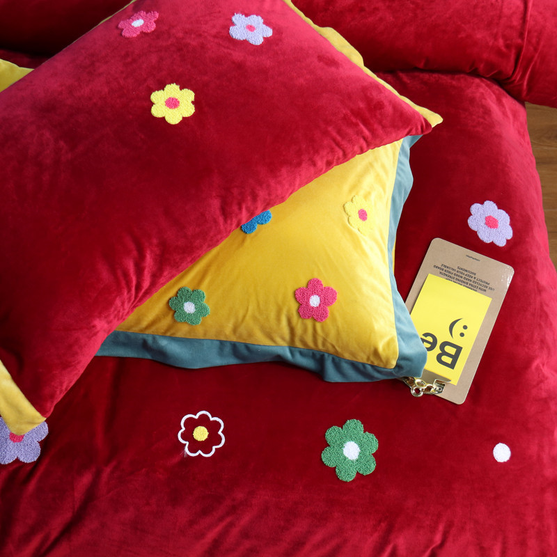 润缦 2019 ins泫雅风宝宝绒四件套牛奶绒四件套 可爱花朵-酒红色
