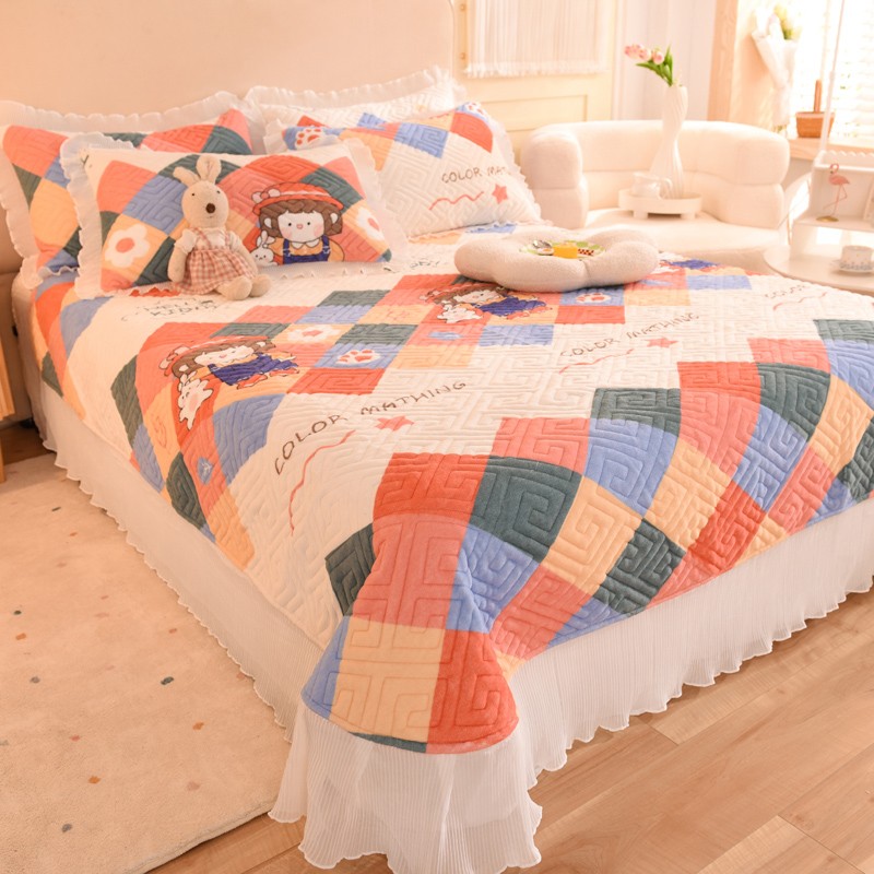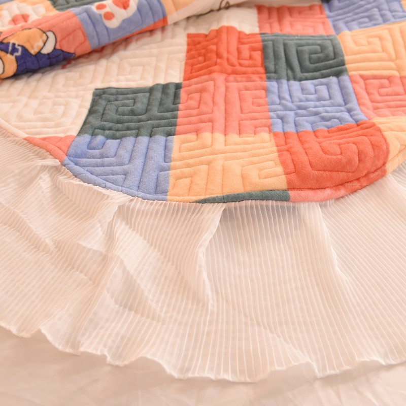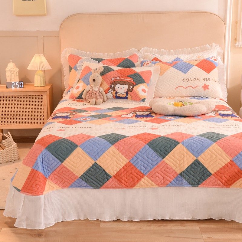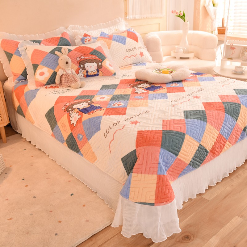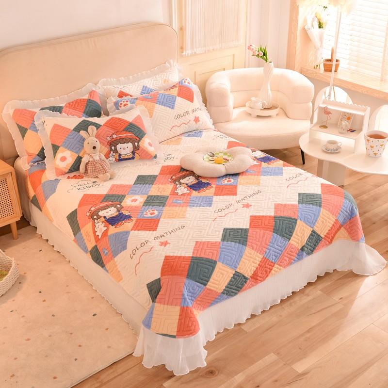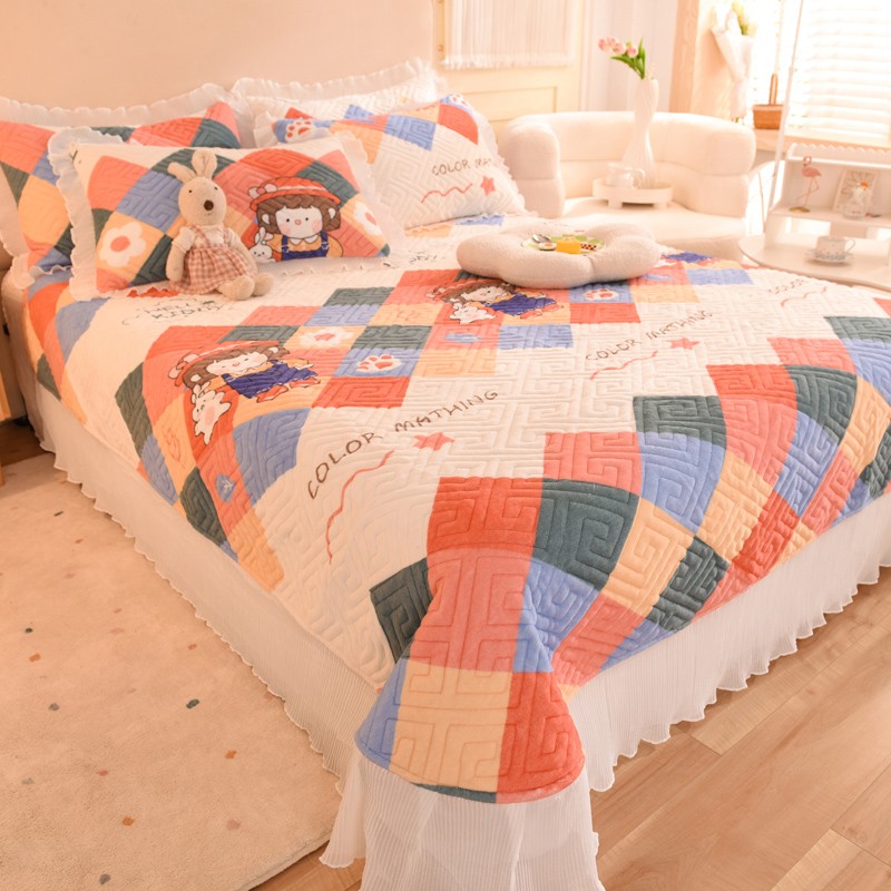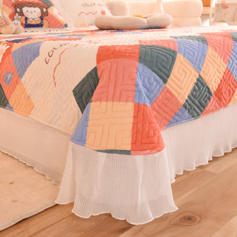 商品名称:2025新款牛奶绒印花夹棉花边 单品床盖 校园女孩