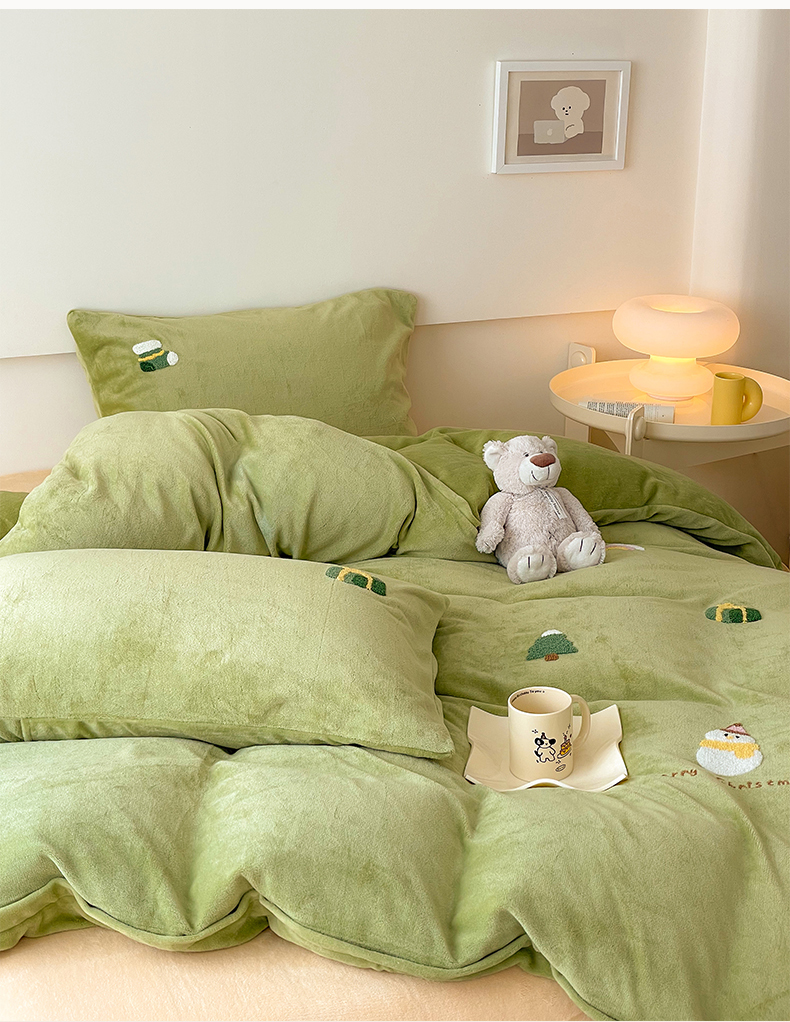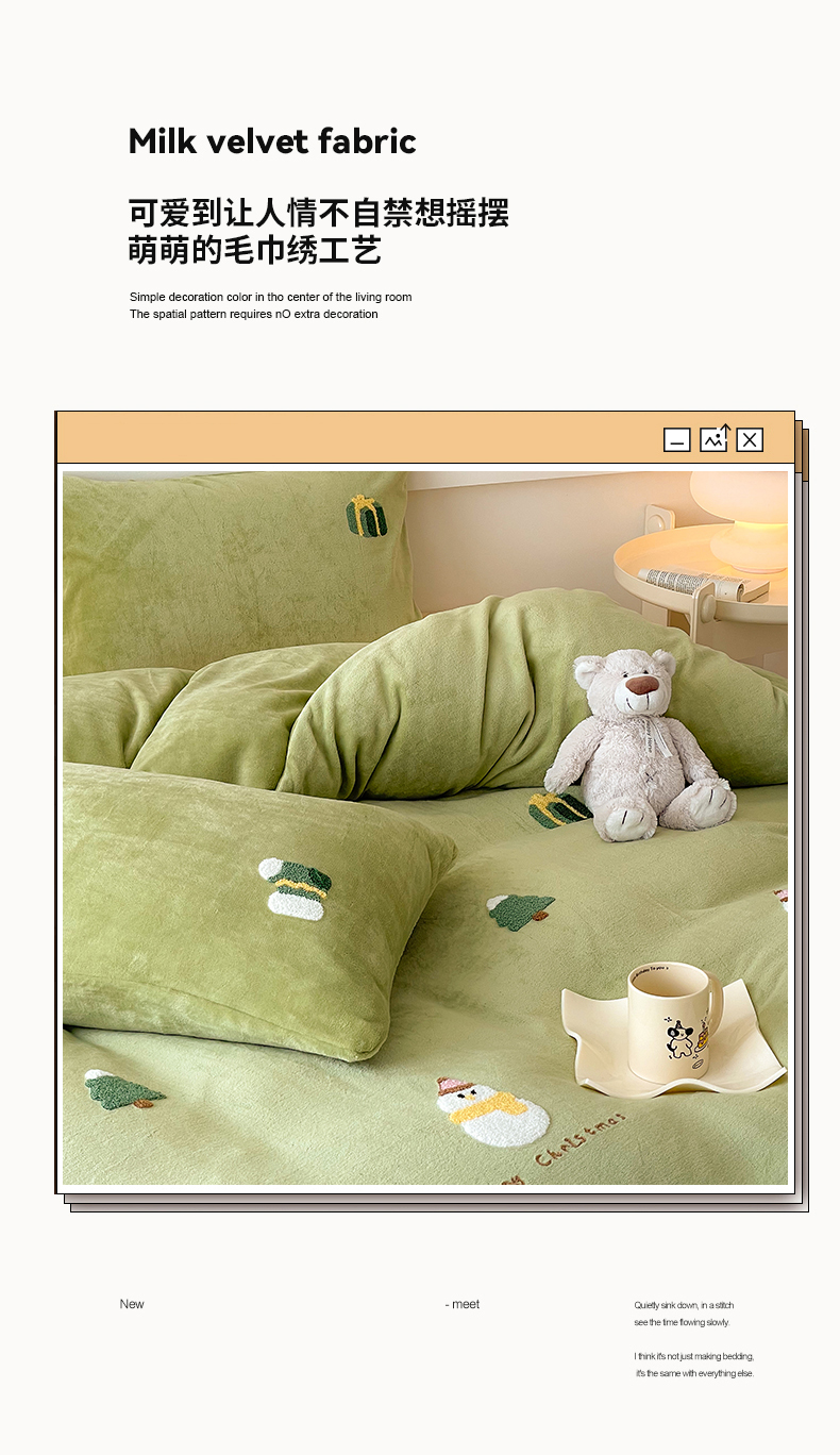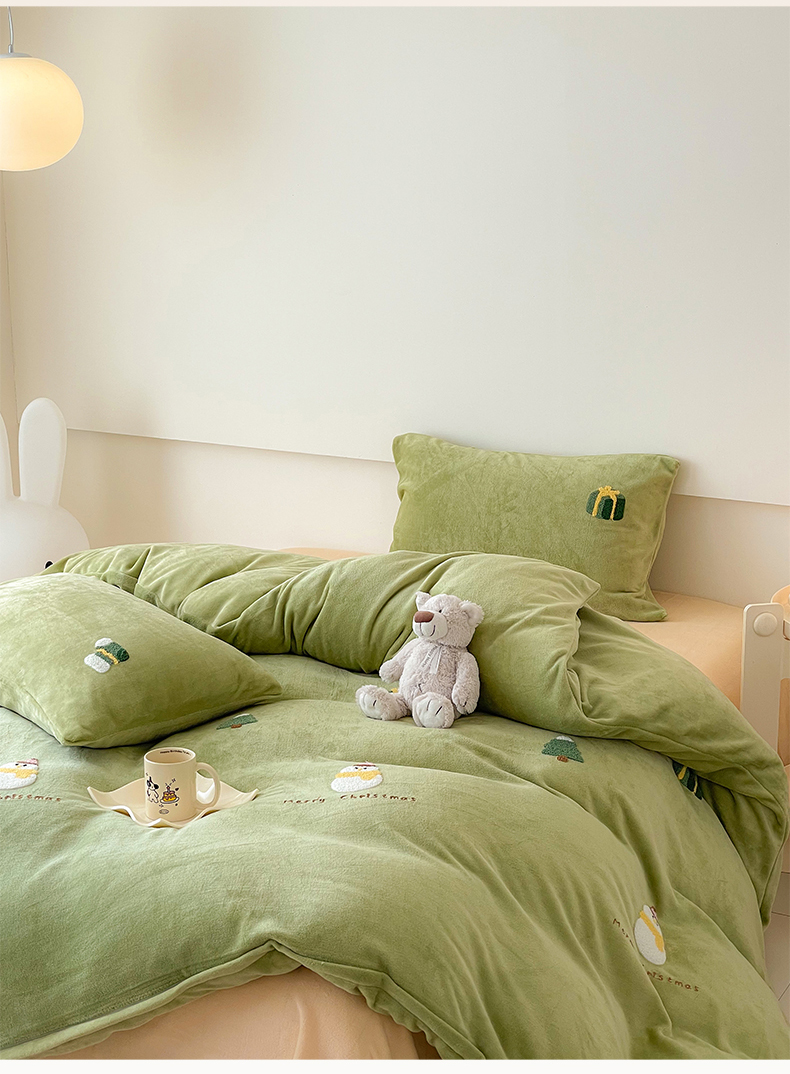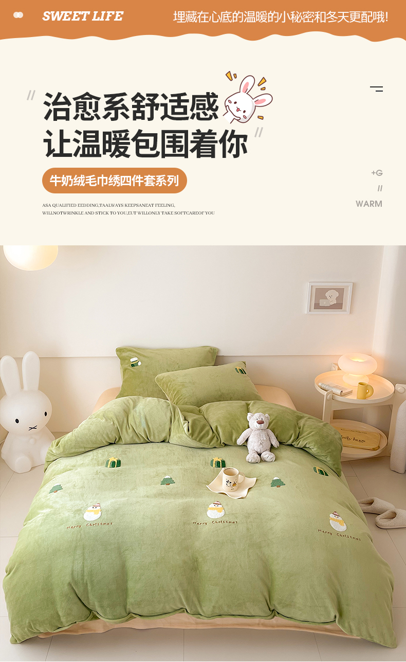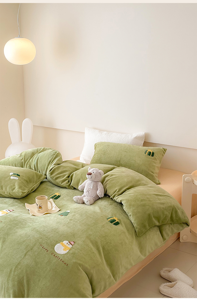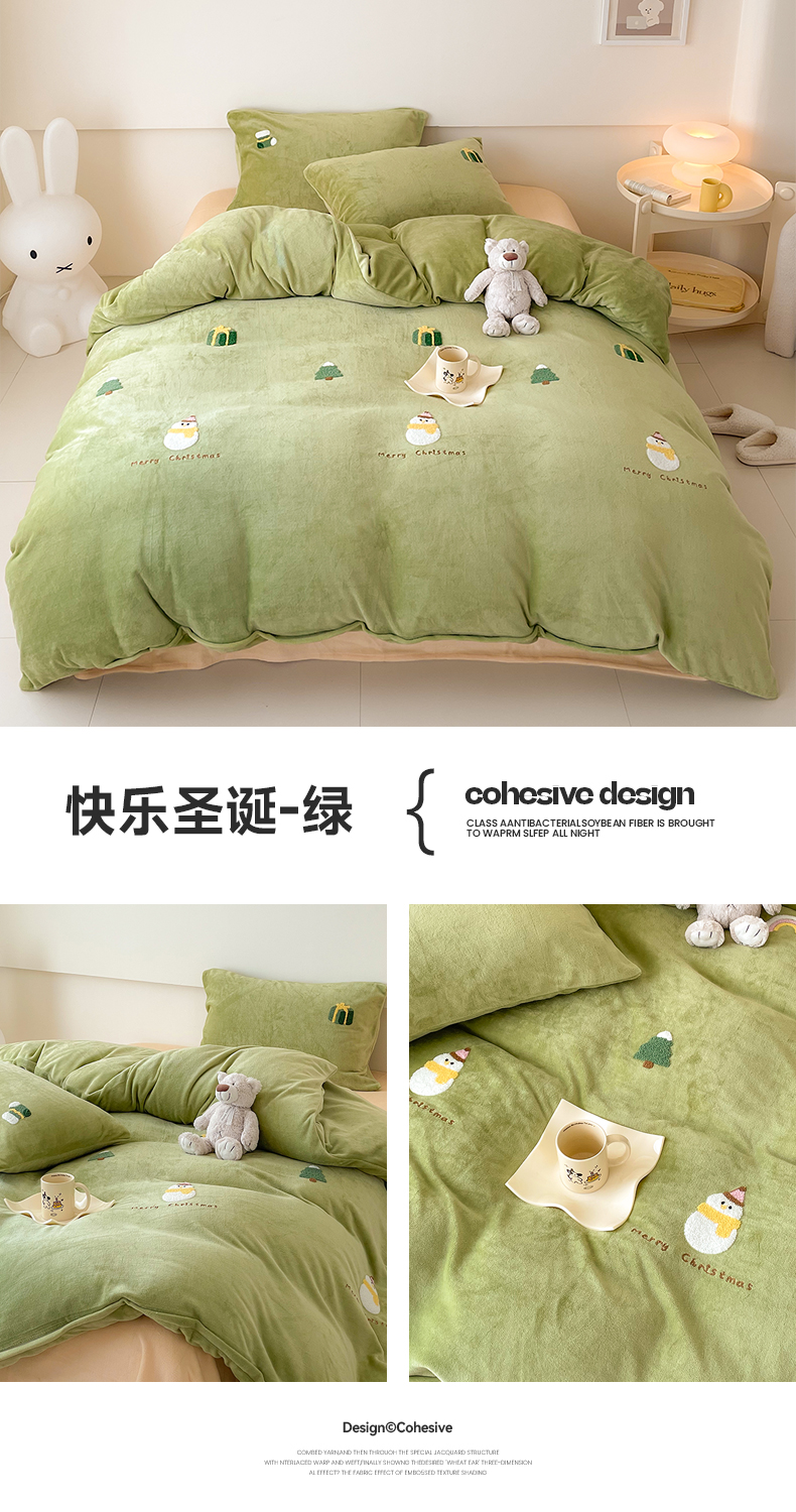 商品名称:沐棉 2023新款高克重牛奶绒毛巾绣四件套 快乐圣诞-绿
