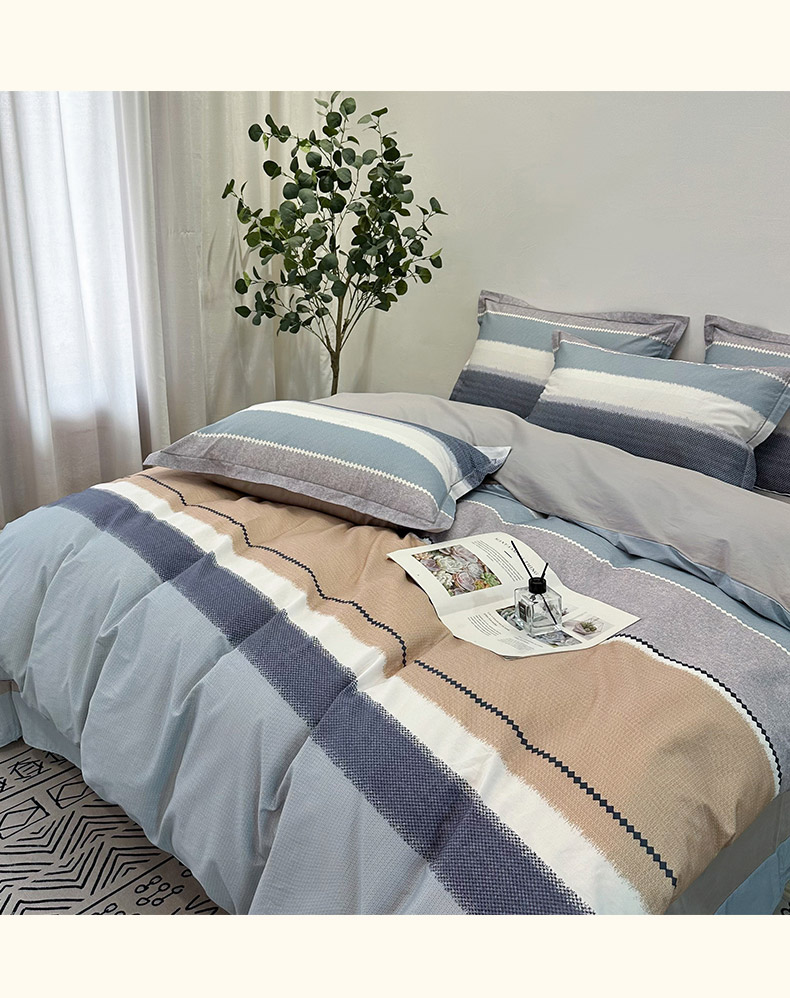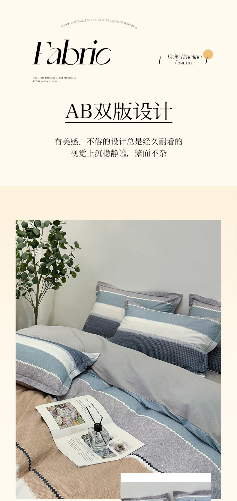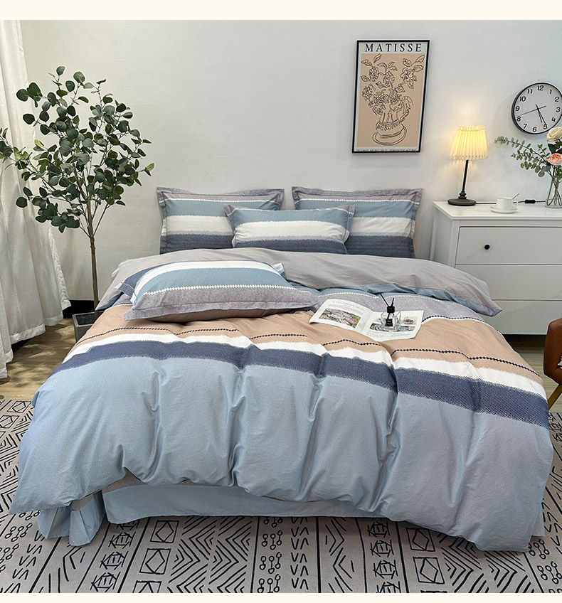 (总)橙艺家居 2022新款全棉色织水洗花边细条纹四件套套件,蜜桃粉,牛仔蓝,浅卡其
