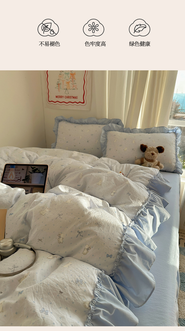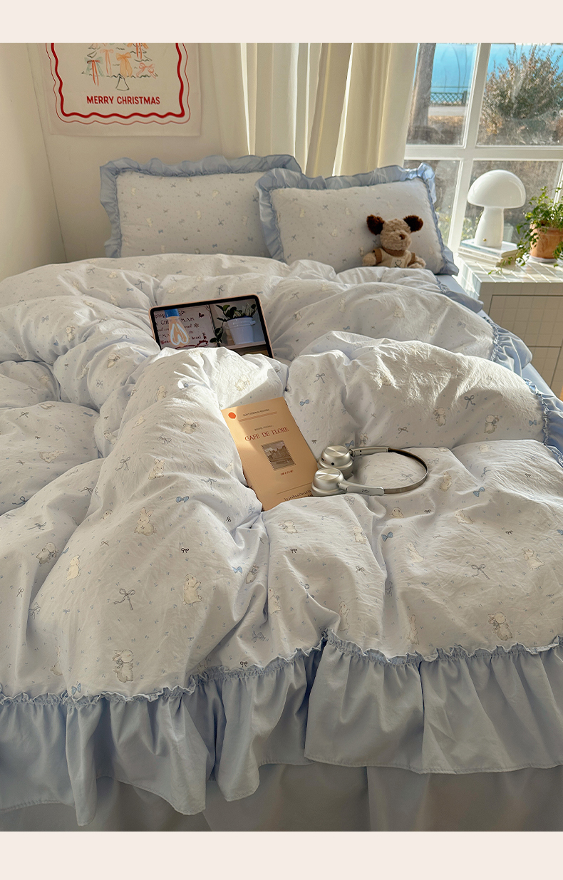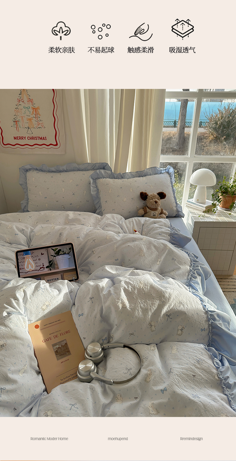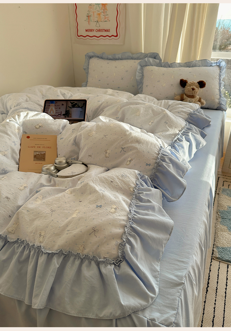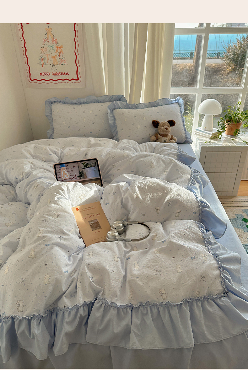 当前位置: 91家纺网 > 商品网购 > 床品套件 > 四件套 > 其它四件套 > 韩都家居 2026新款韩系大花边系列古棉四件套 蓝海