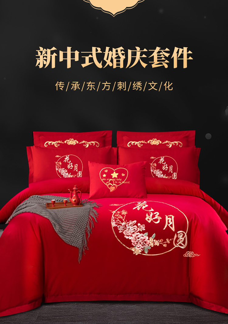 慕她婚庆四件套大红色结婚加厚磨毛刺绣花多件套直播 花好月圆