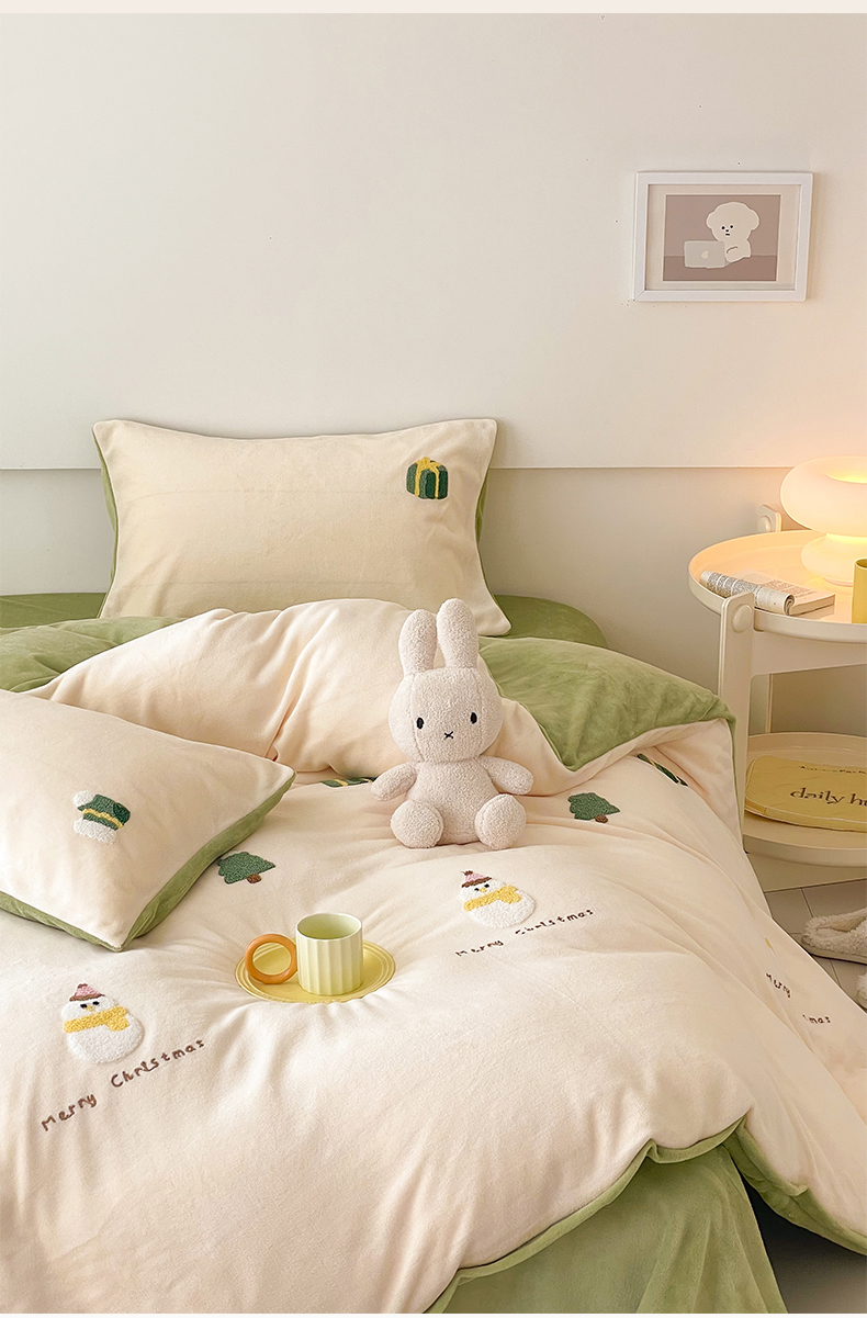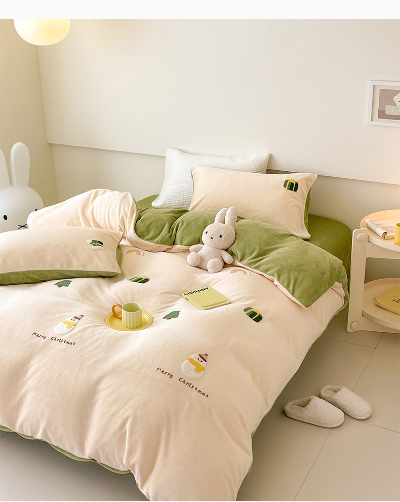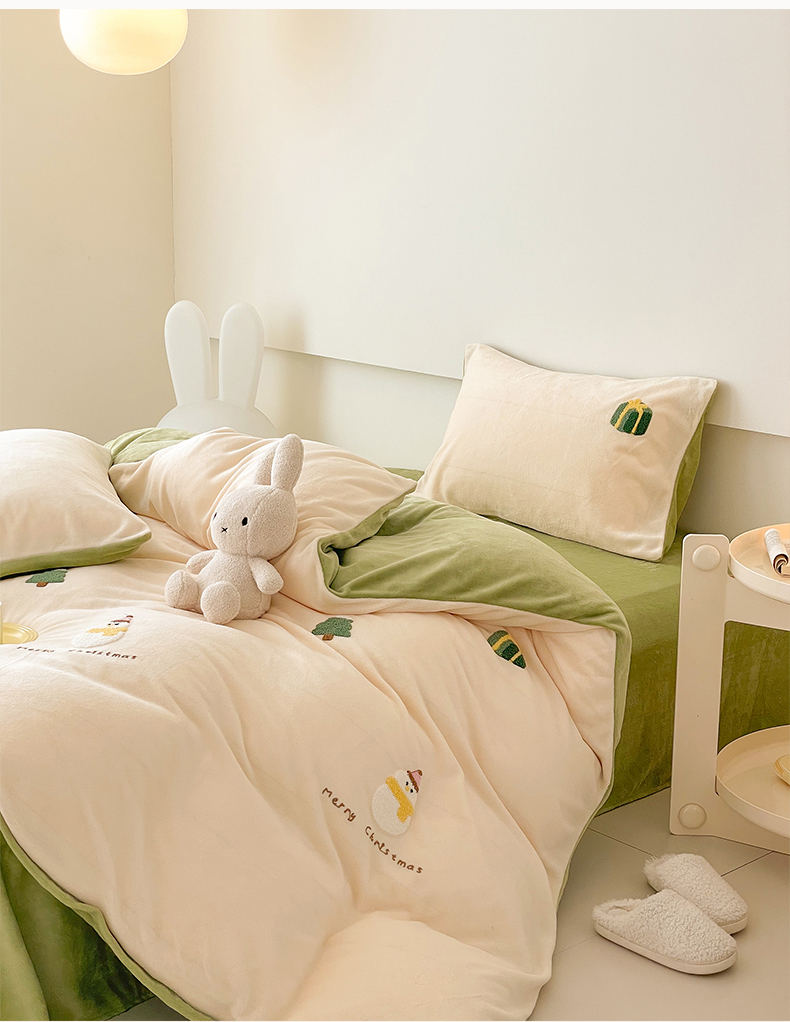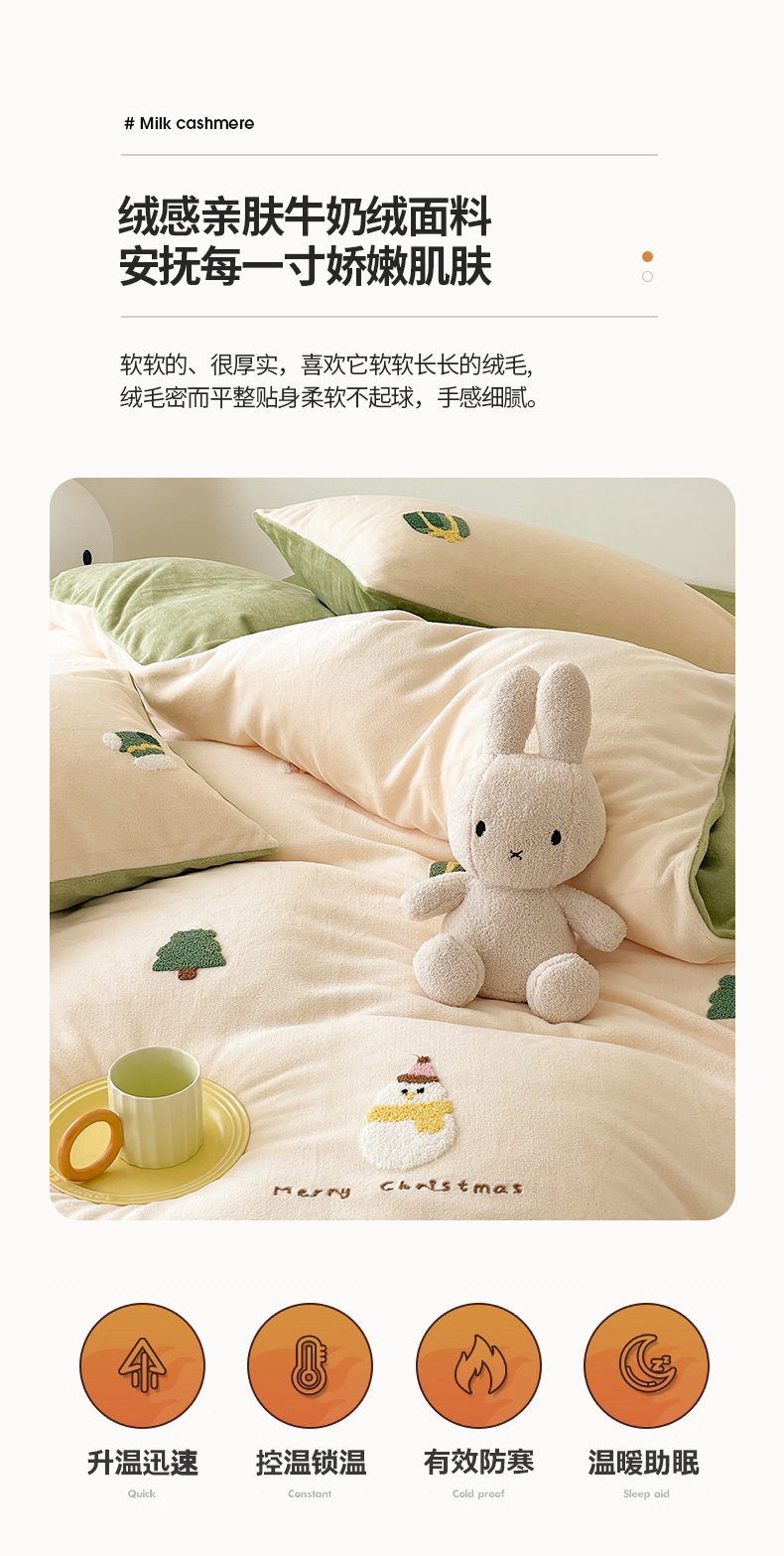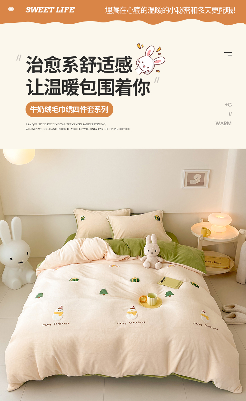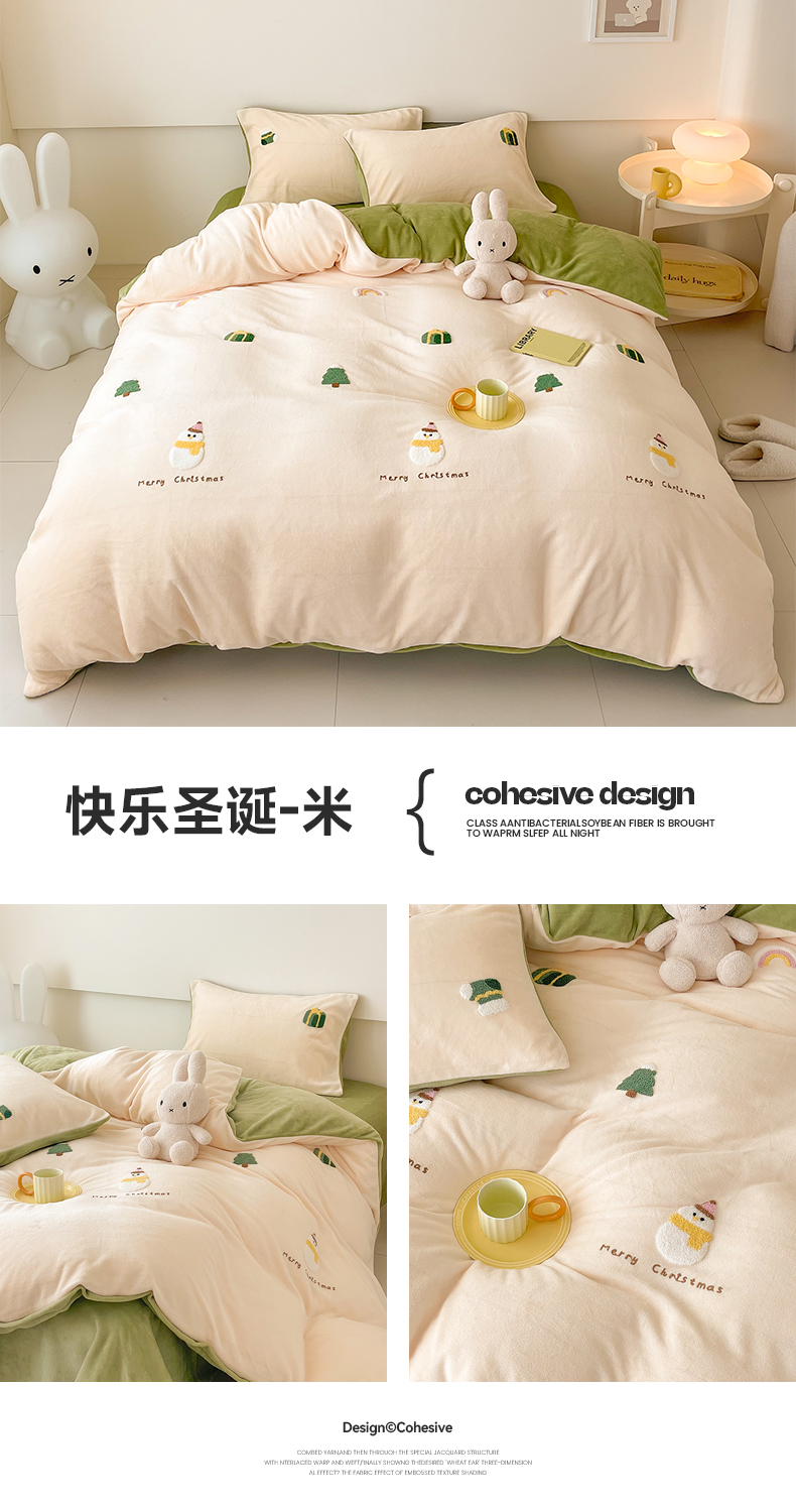 商品名称:沐棉 2023新款高克重牛奶绒毛巾绣四件套 快乐圣诞-米