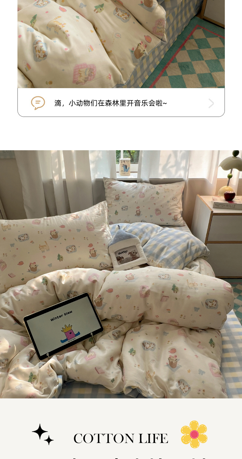 (总)六巷胡同 2025新款 INS减龄可爱风卡通全棉四件套第五系(森林音乐会系列),波点嘟嘟猫,点点面包犬,调皮蔷薇狗,哈喽泡芙猫,蓝格插画犬,森林音乐会