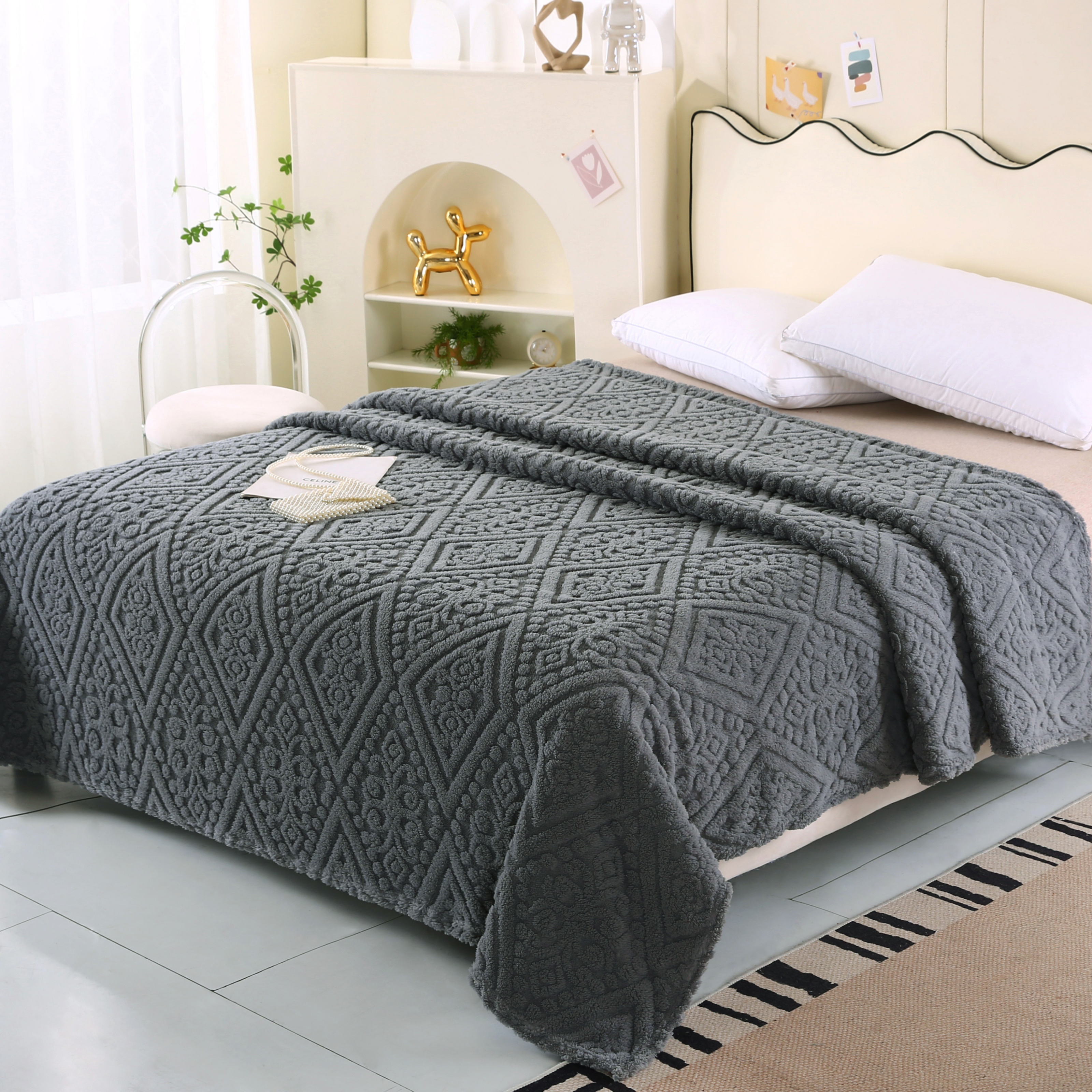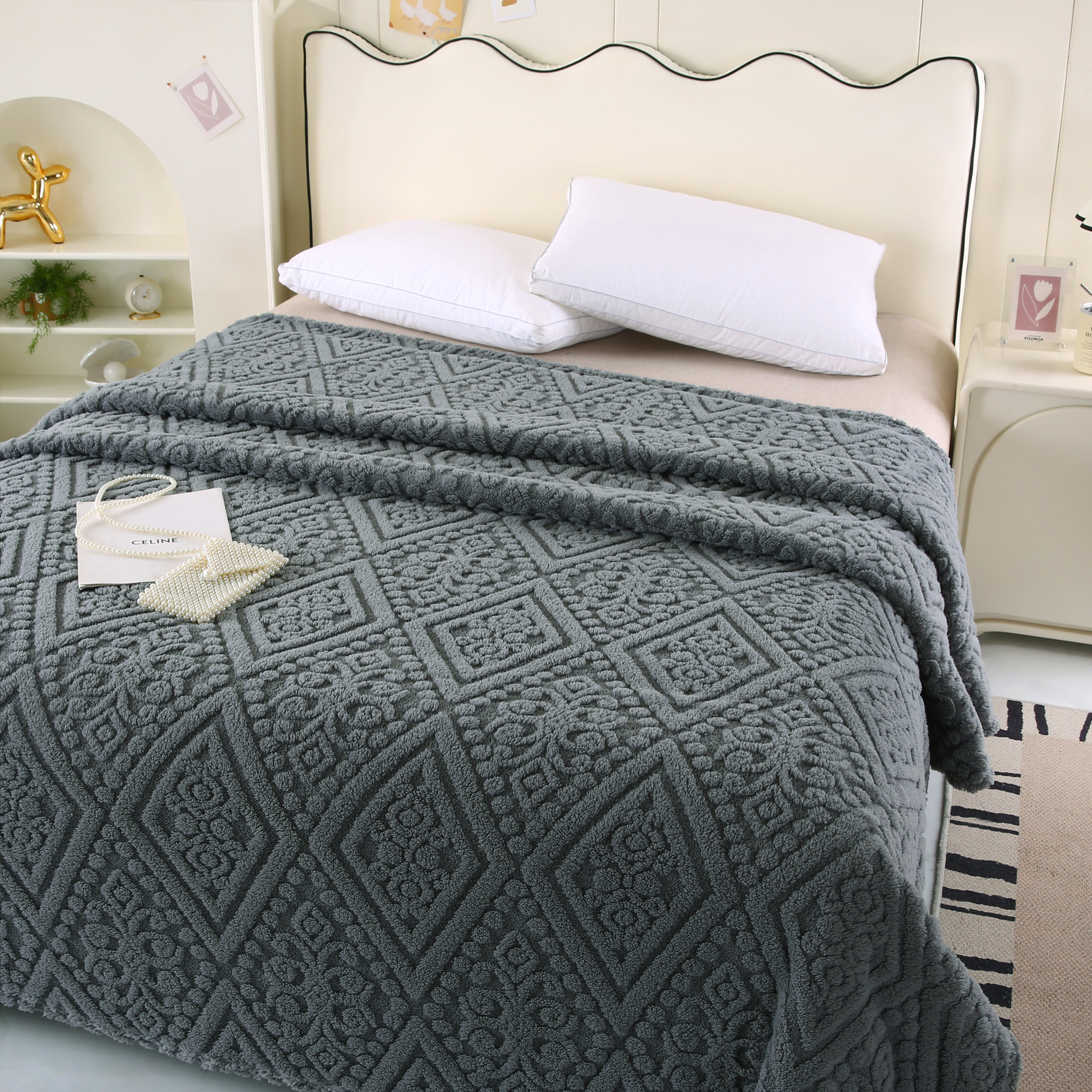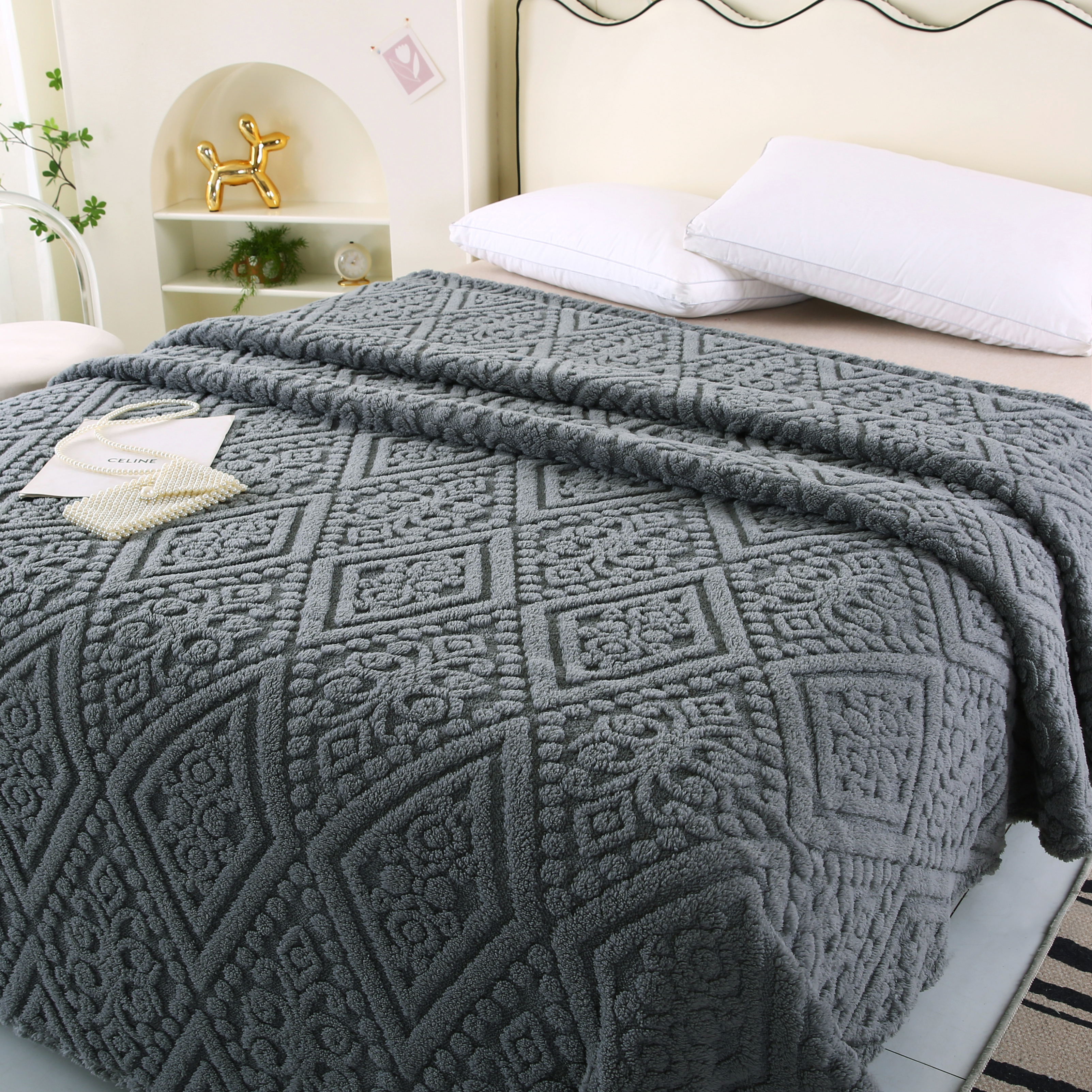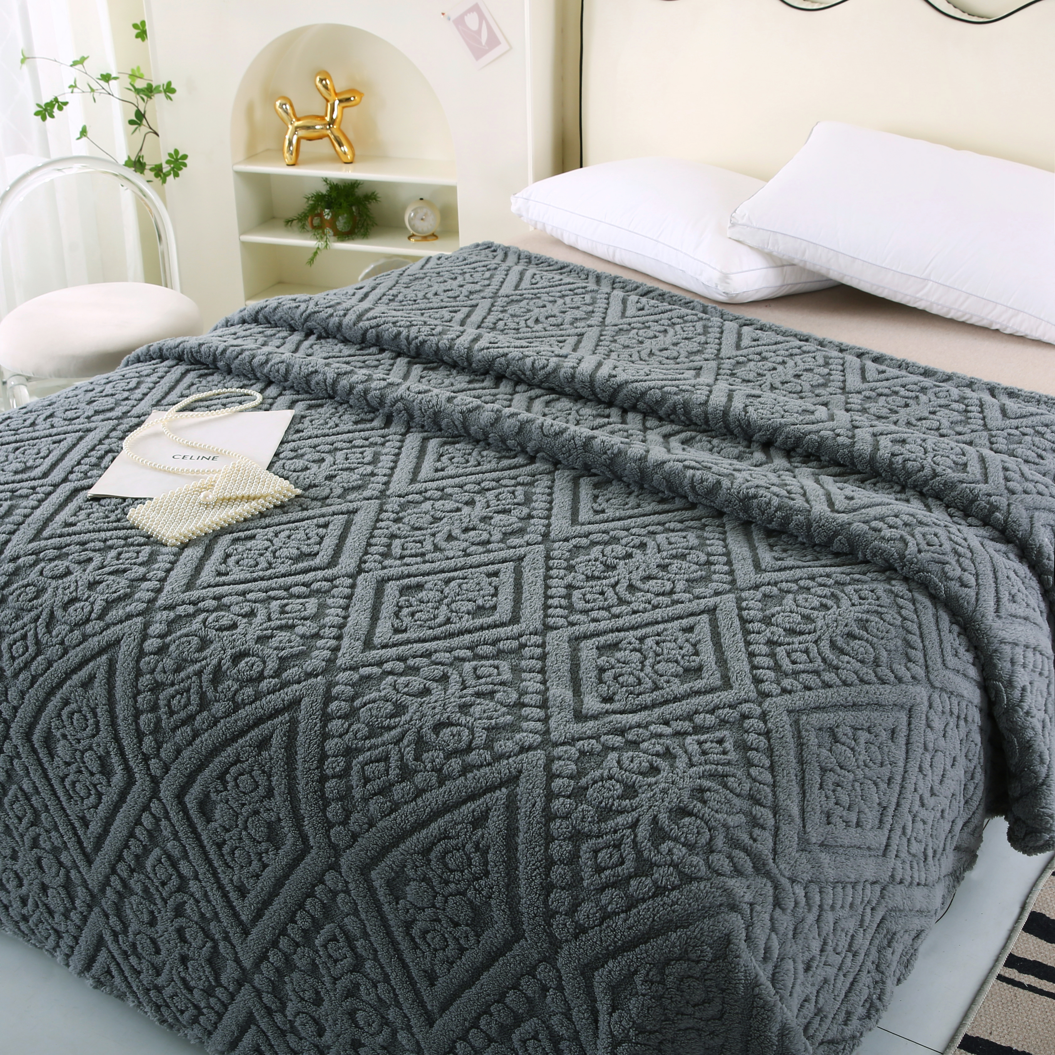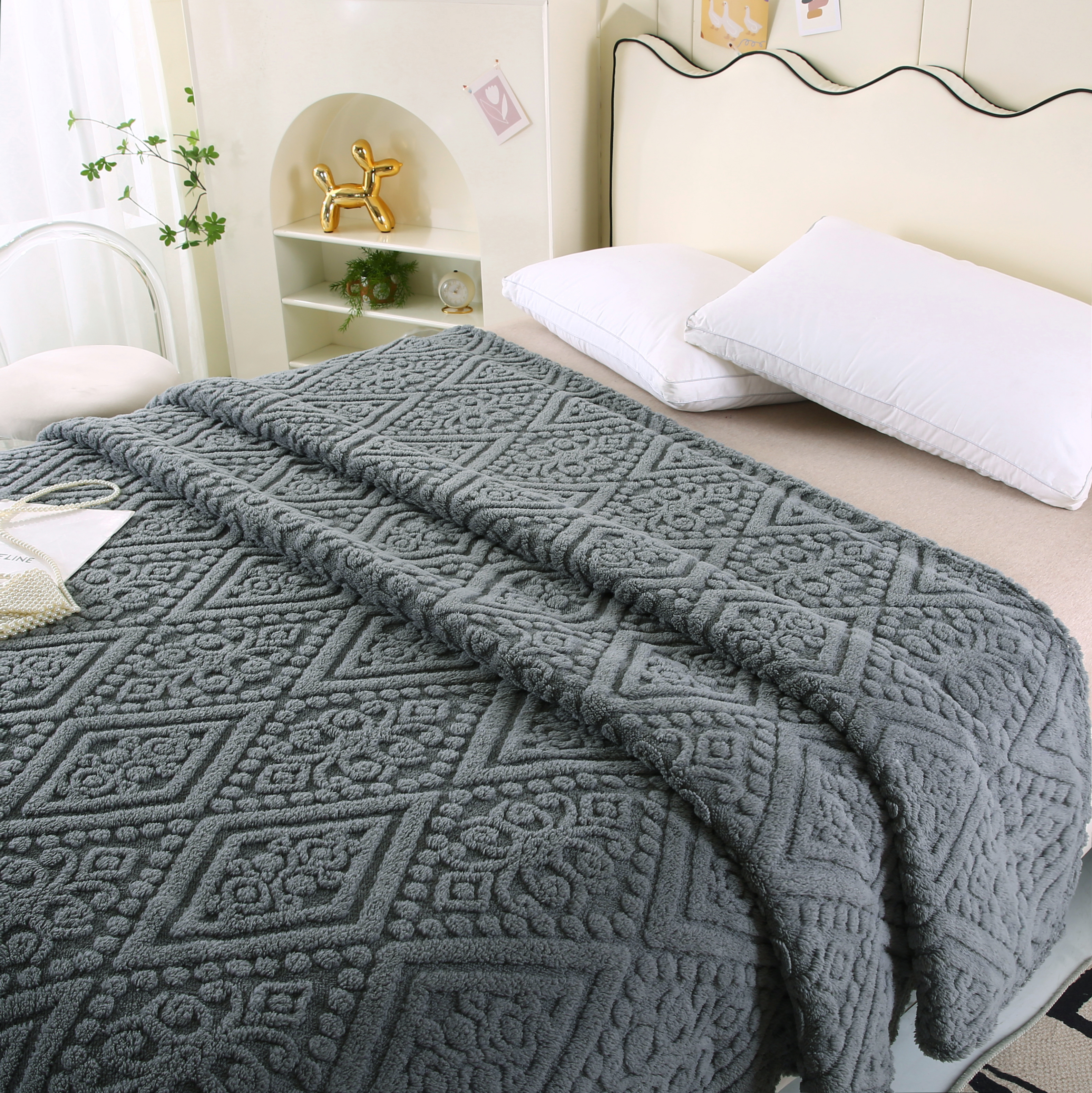 (总)巴木赫 2024新款提花朵朵绒双层羊羔绒毯,茶绿,粉色,咖啡,孔雀蓝,浅灰,浅驼