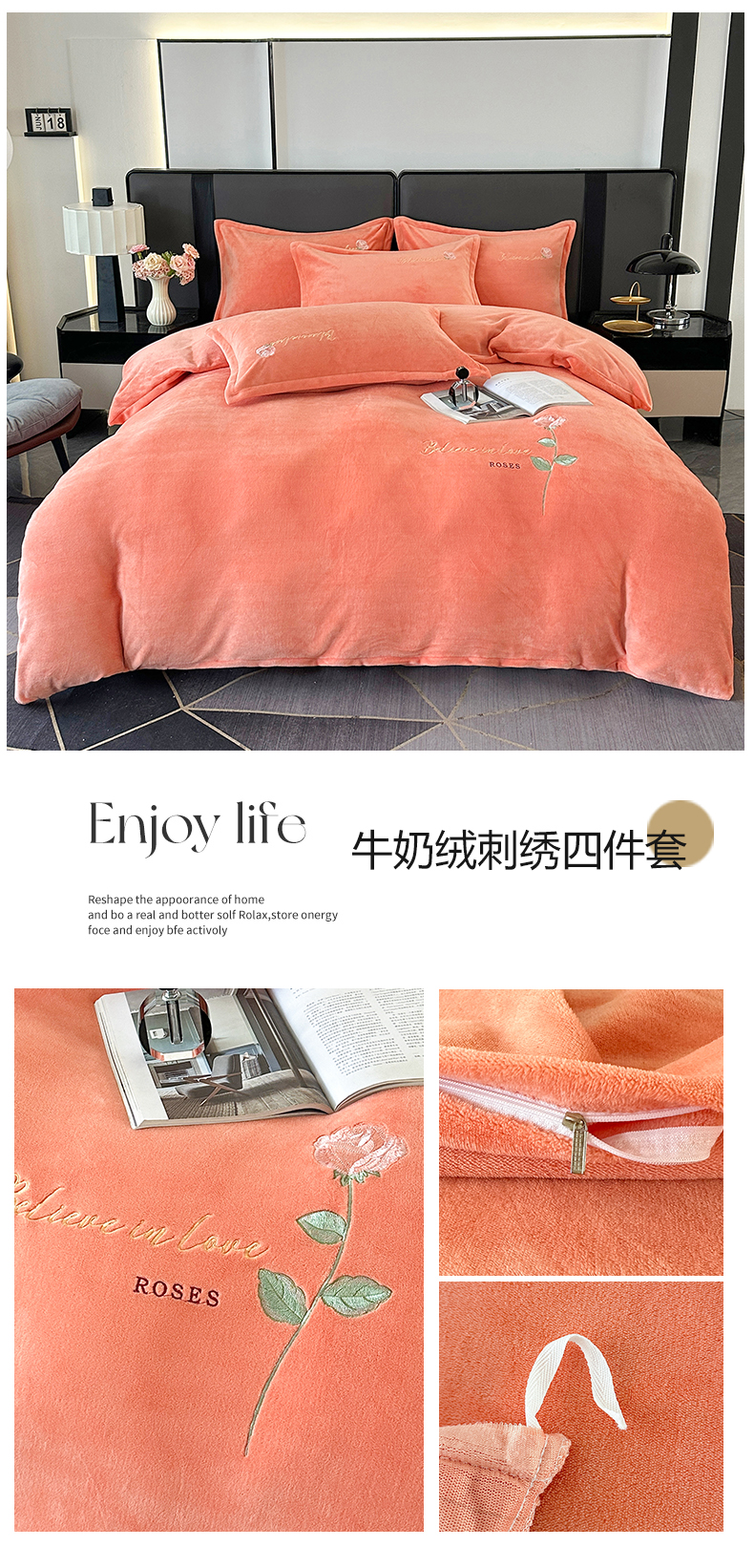 商品名称:富缦庭 2025新款牛奶绒绣花四件套 红粉佳人-橙色