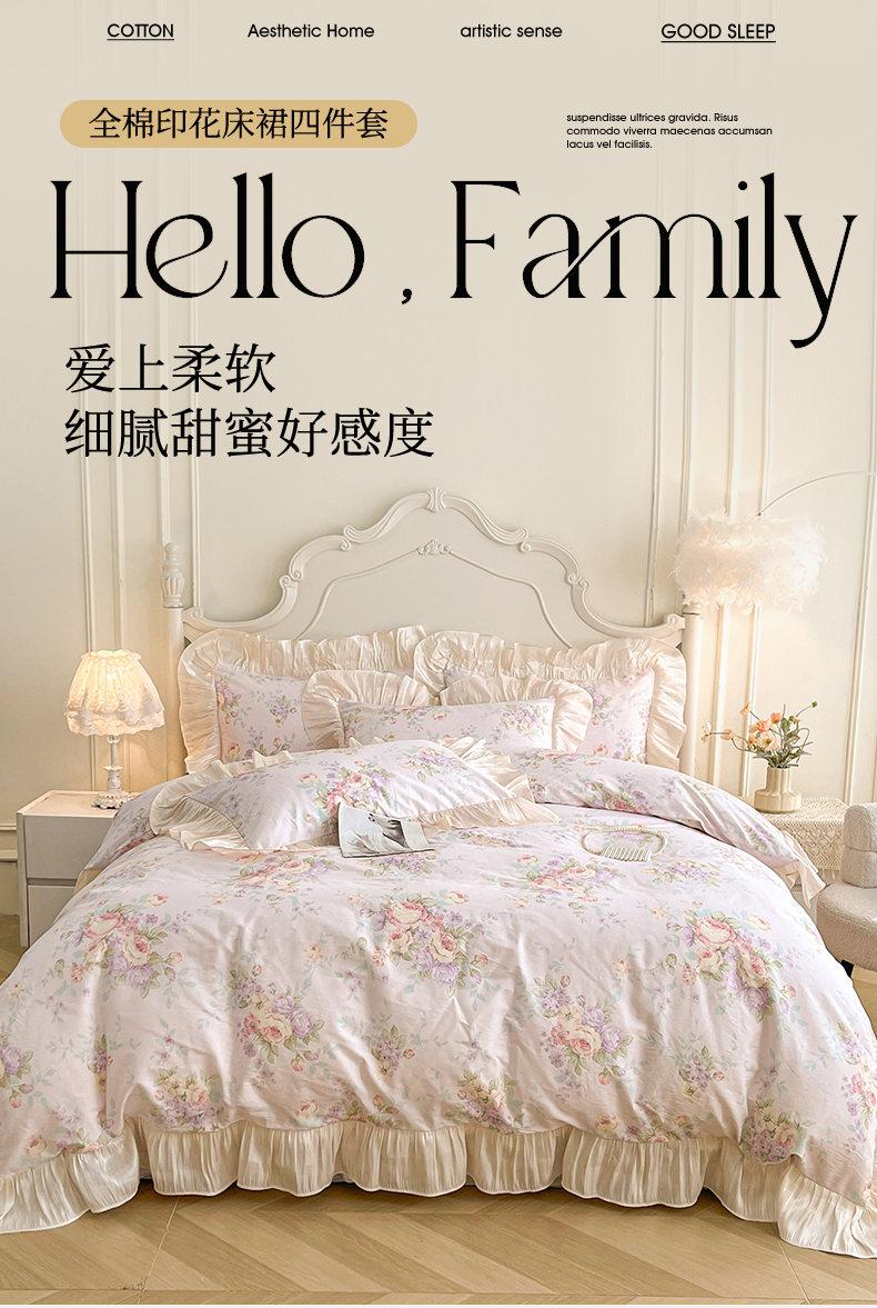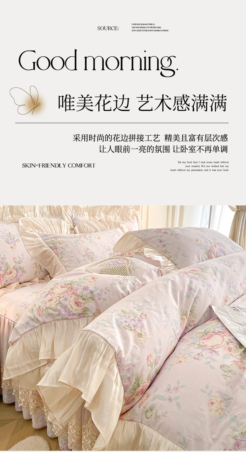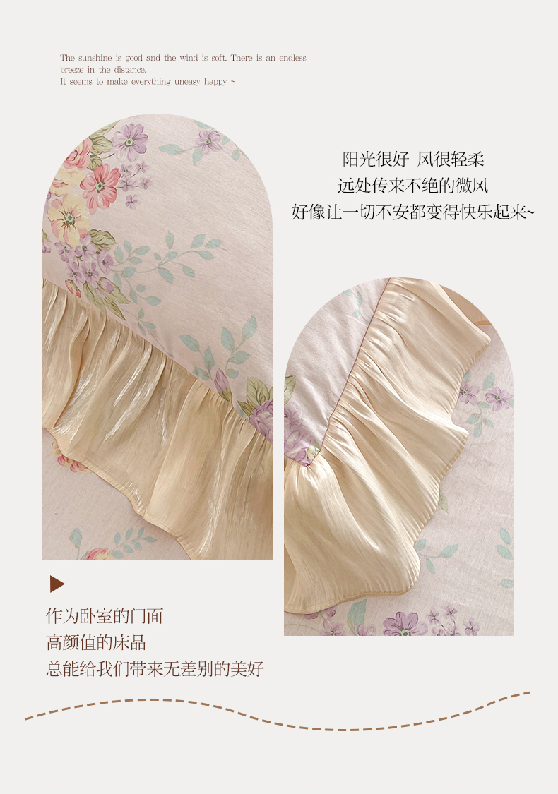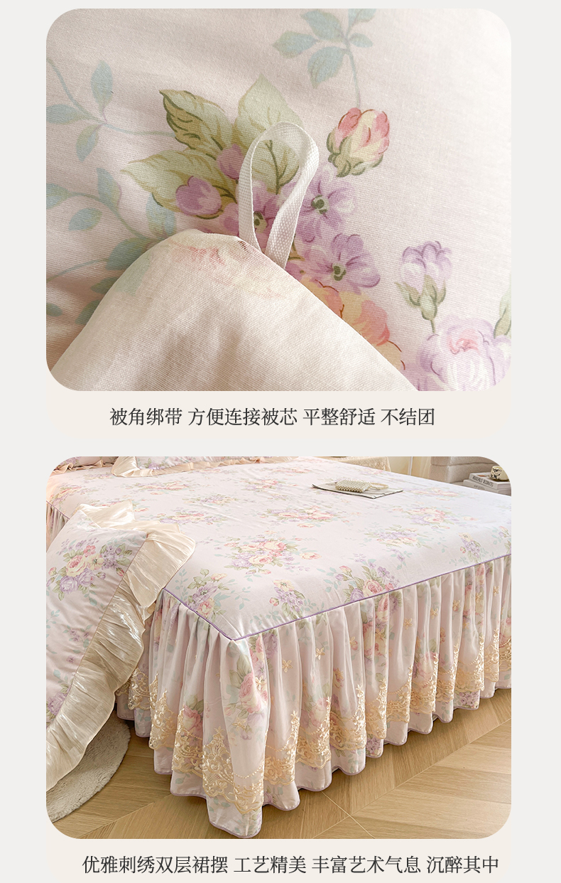 当前位置: 91家纺网 > 商品网购 > 床品套件 > 四件套 > 全棉普通四件套 > 宜凡家纺 2026新款全棉印花床裙款四件套 春日微光