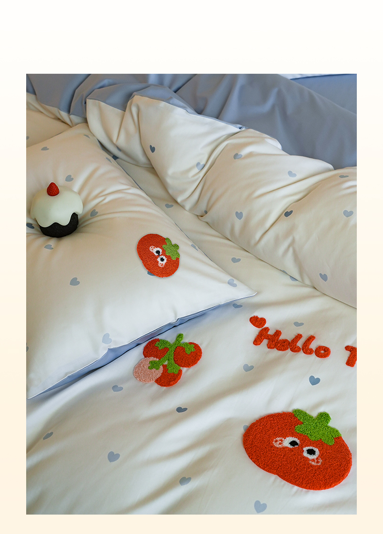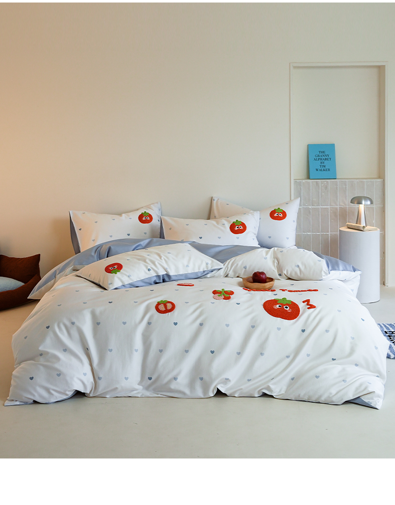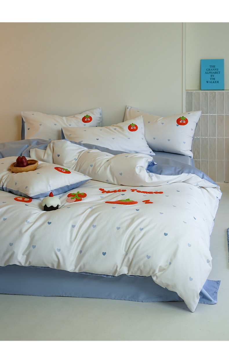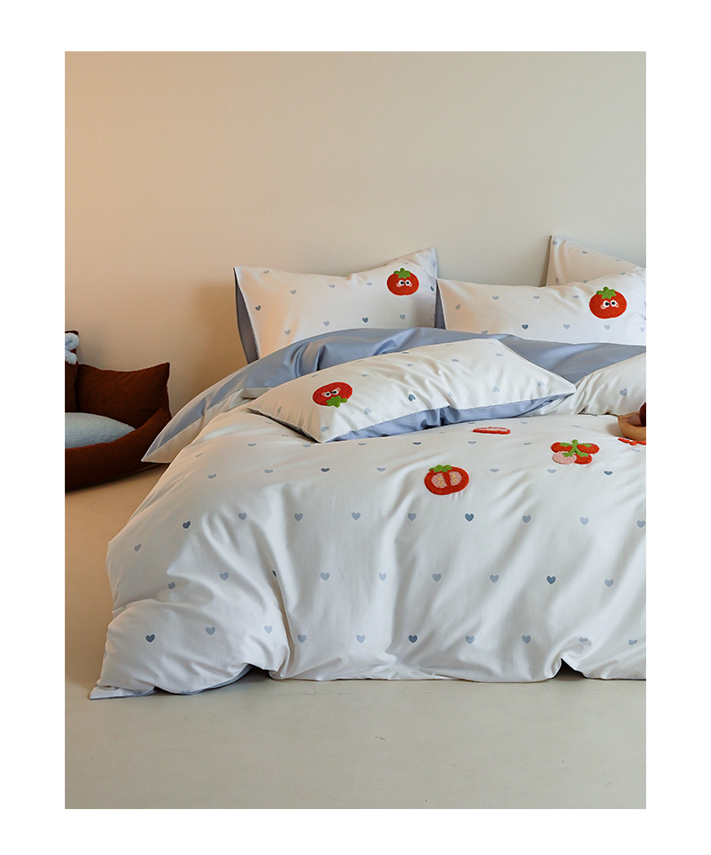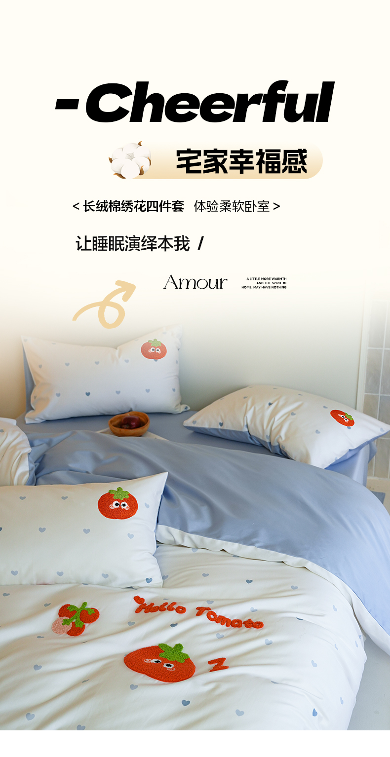 (总)雅居纺家纺 2026新款50长绒棉满版绣花四件套,爱心柿柿如意,爱心西红柿,蓝色猫咪,满天星