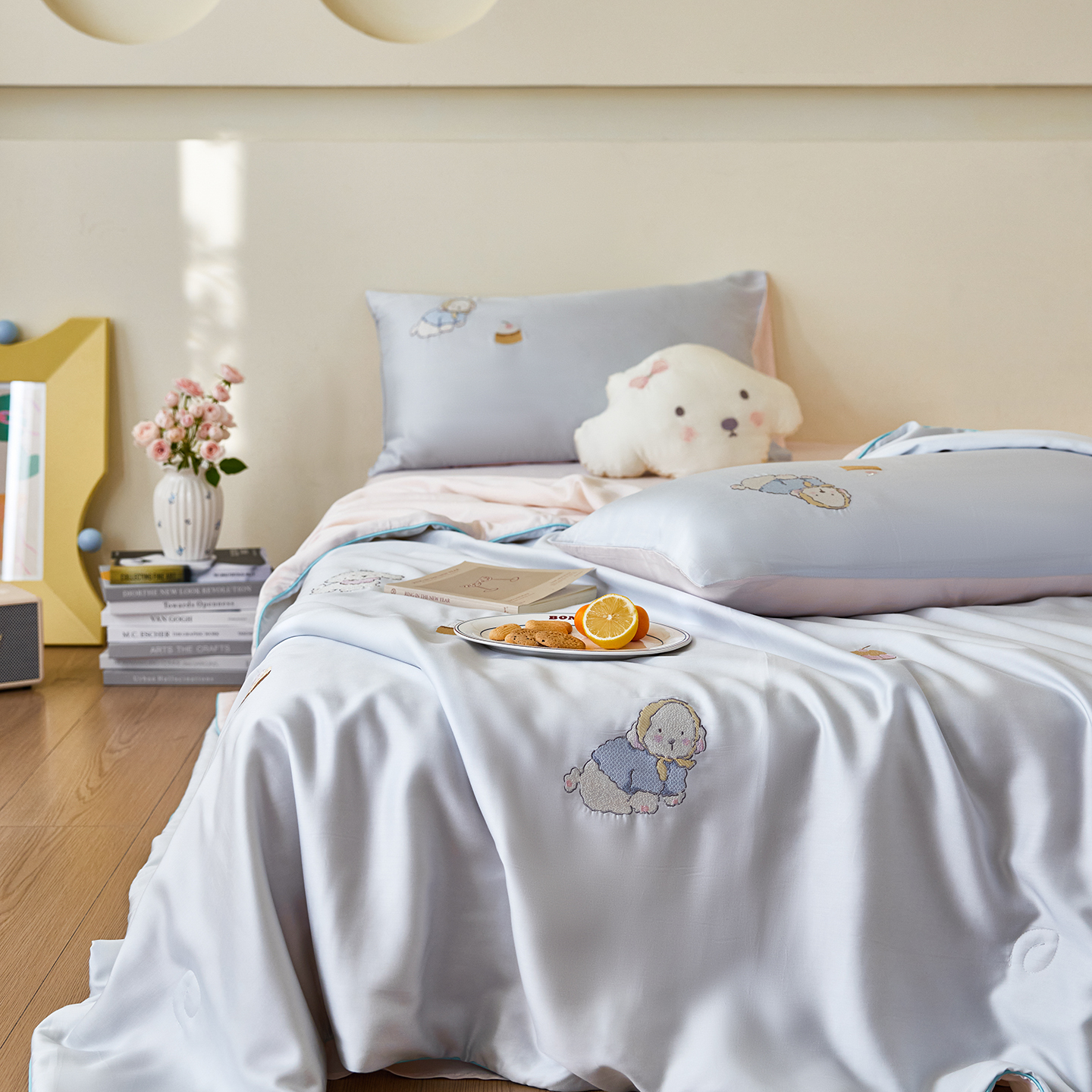 (总)风向标家纺 2026新款兰精天丝绣花四件套-萌宠系列,粉雾小斑,花径猫踪,蓝心喵语,奶蓝汪团,南瓜夏语,清蓝奶芙,云粉小卧