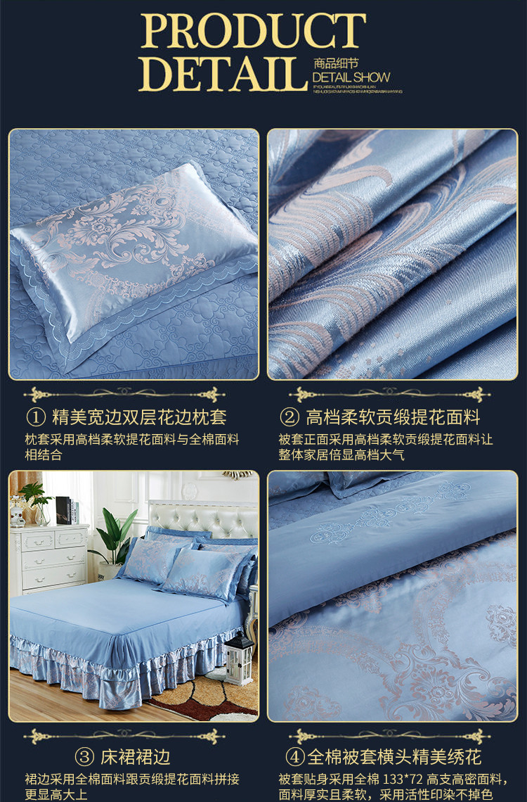 商品名称:福丽莱家纺 贡缎提花床裙四件套(单层)典范欧风-蓝灰