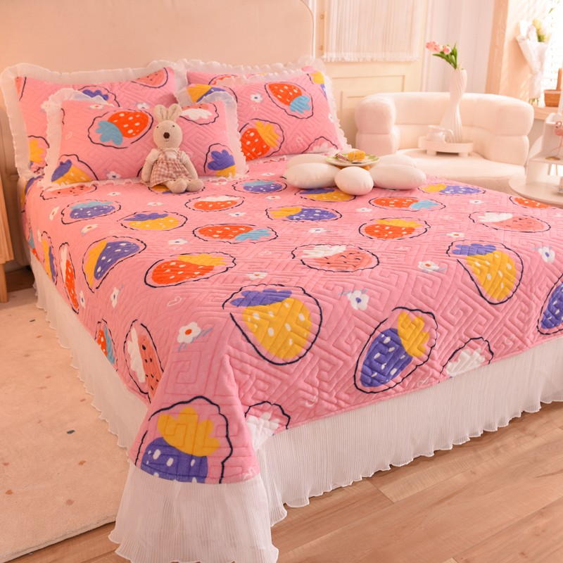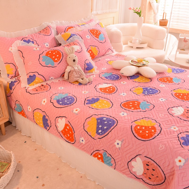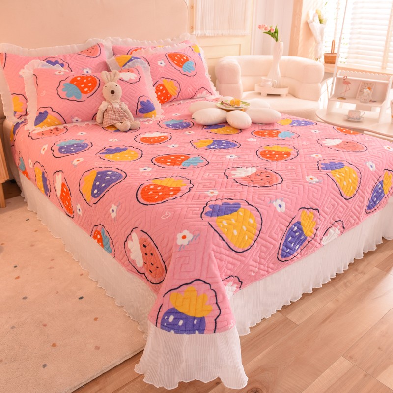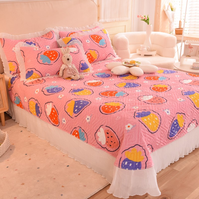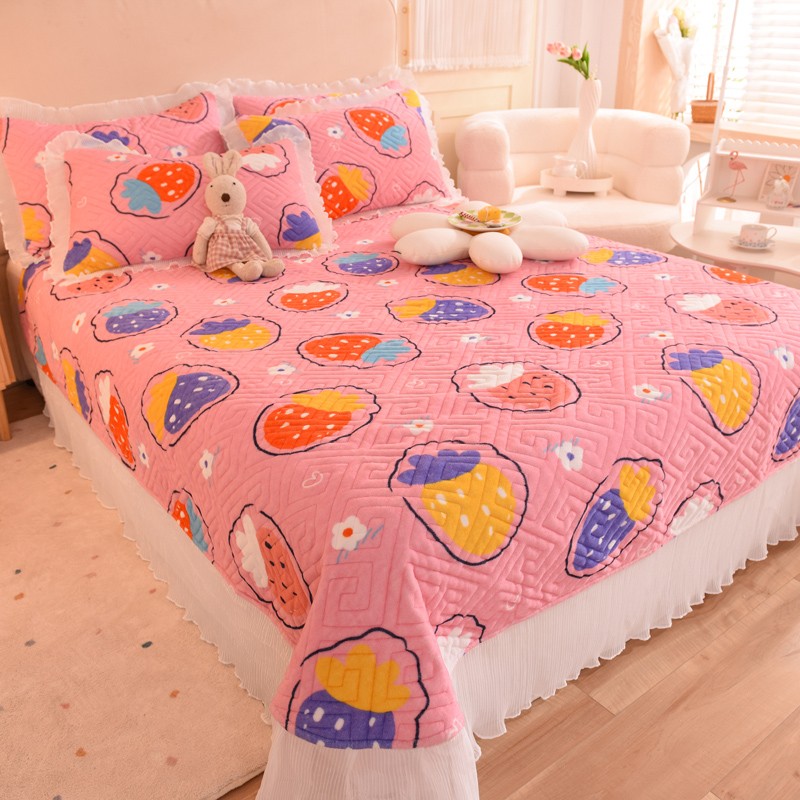 2025新款牛奶绒印花夹棉花边 单品床盖 粉红草莓