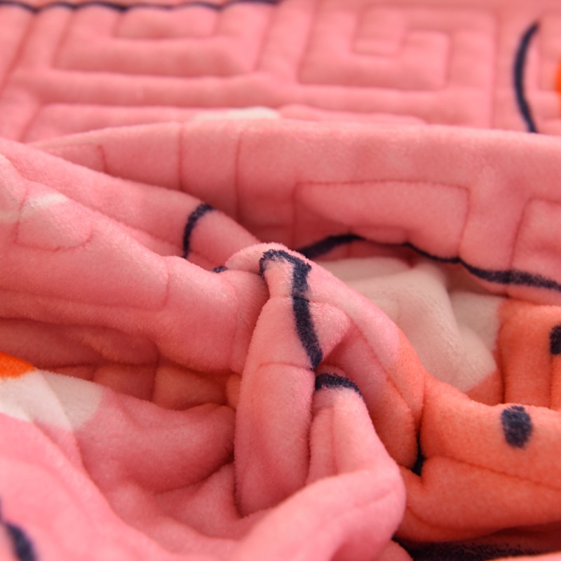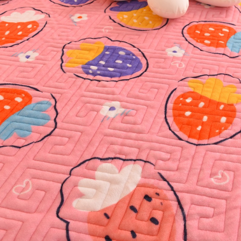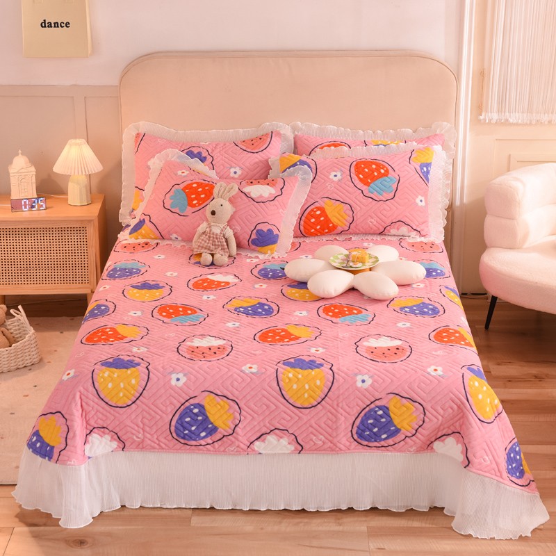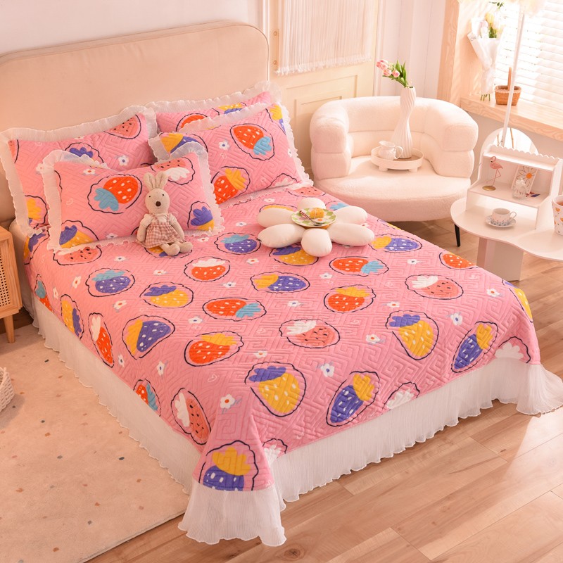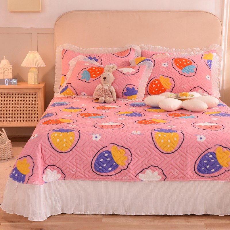 2025新款牛奶绒印花夹棉花边 单品床盖 粉红草莓