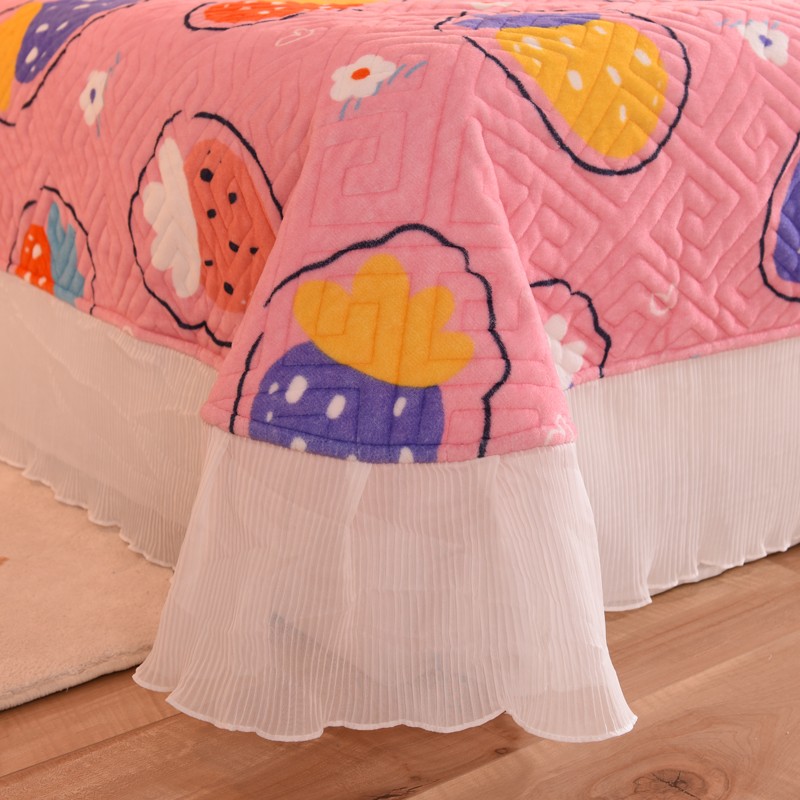 商品名称:2025新款牛奶绒印花夹棉花边 单品床盖 粉红草莓