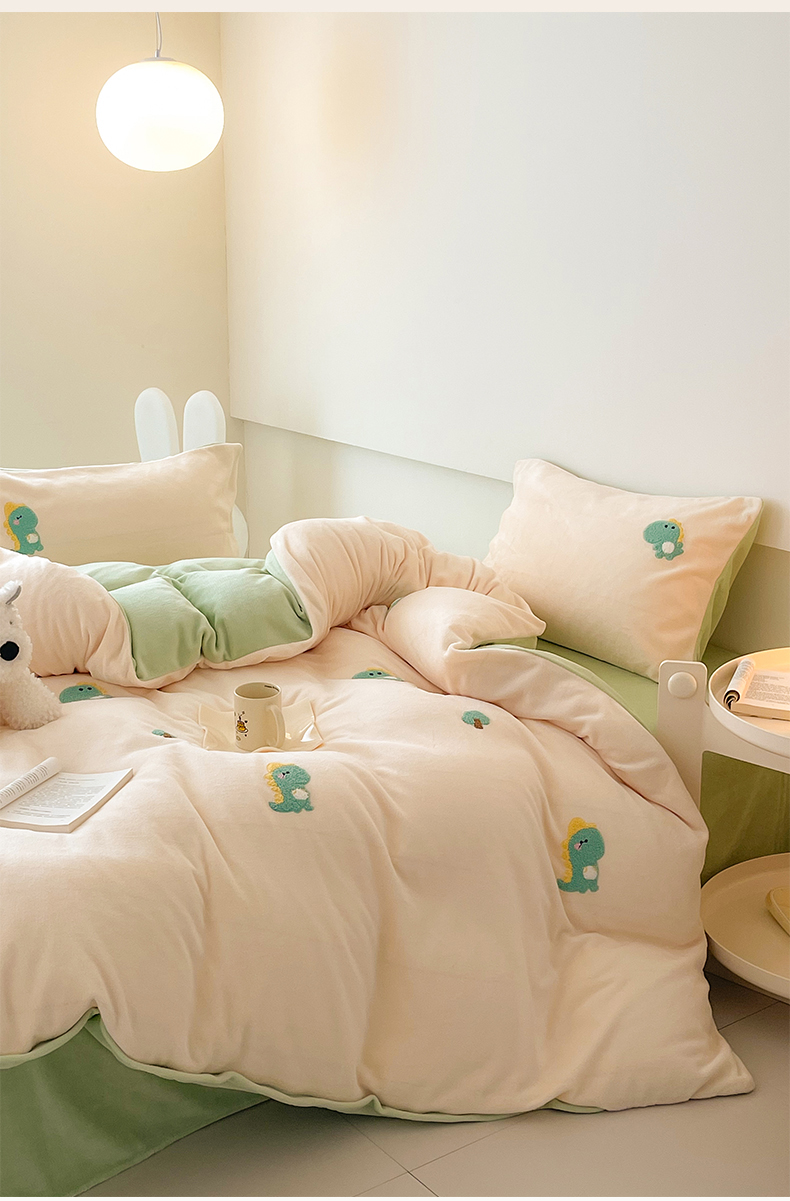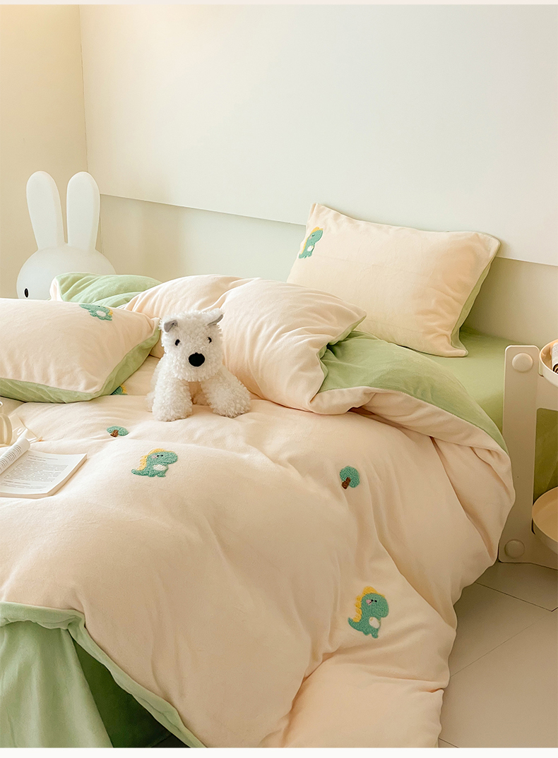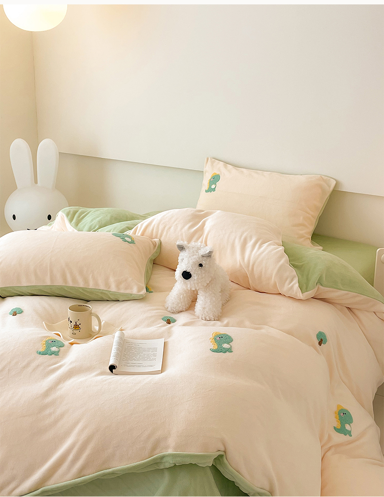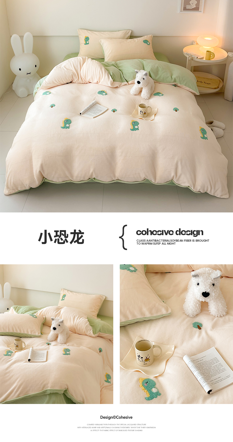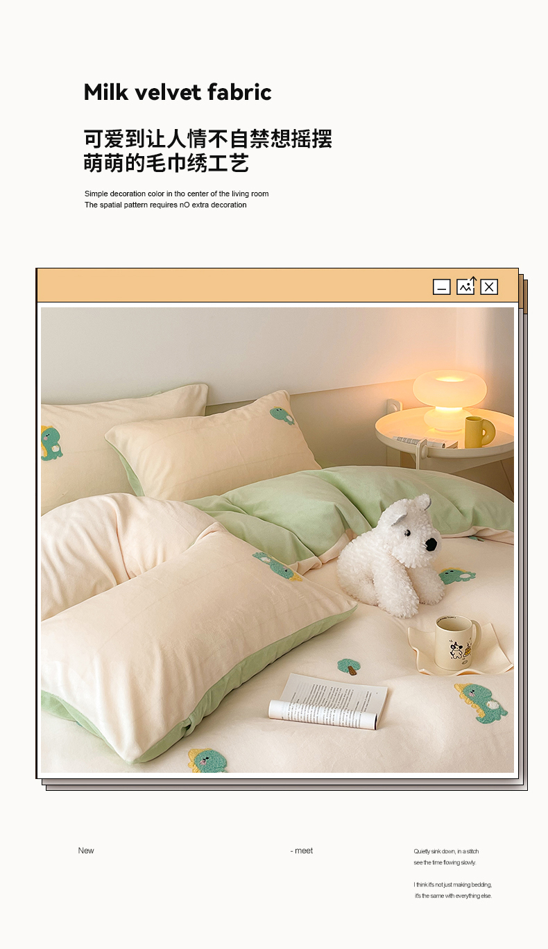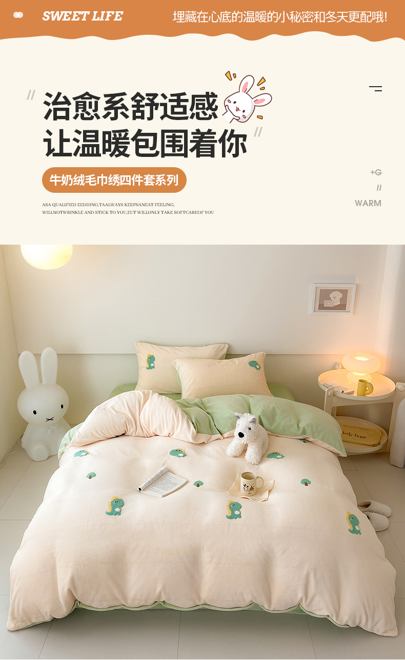 商品名称:沐棉 2023新款高克重牛奶绒毛巾绣四件套 小恐龙