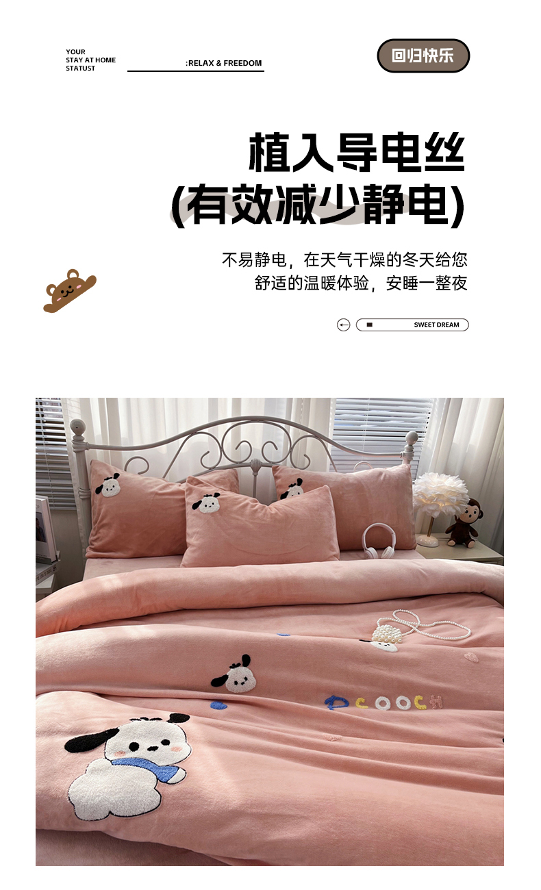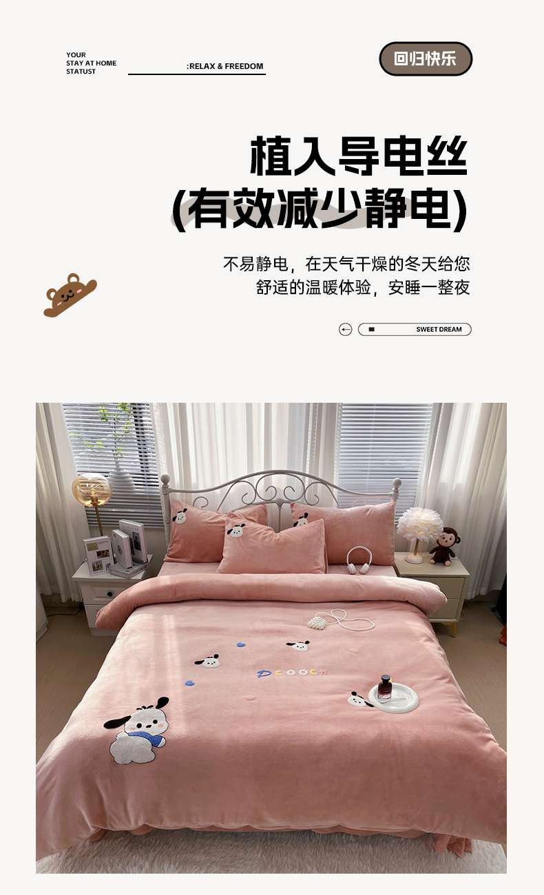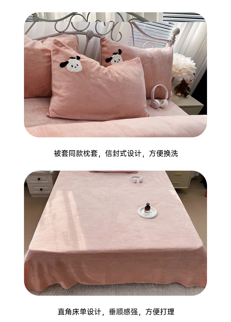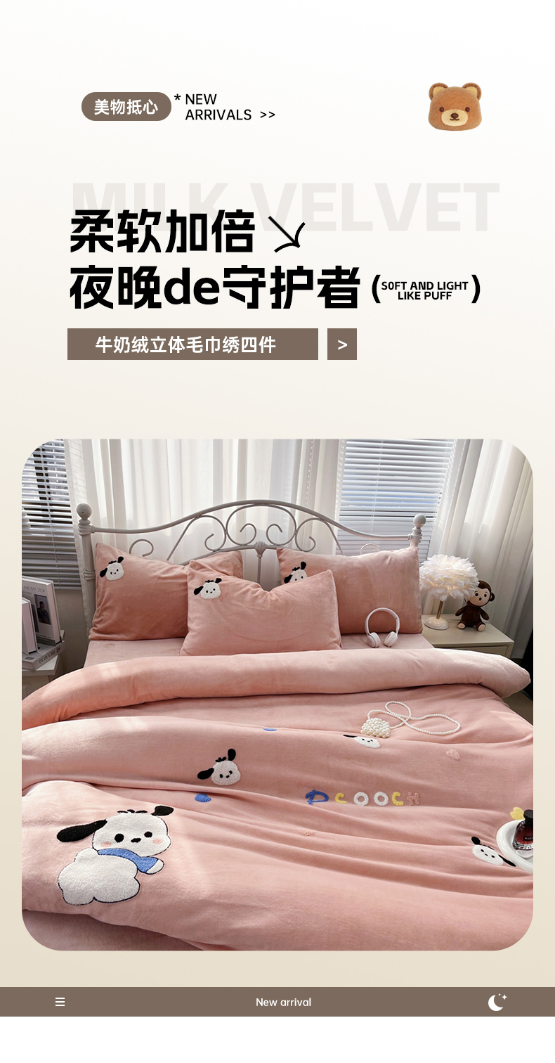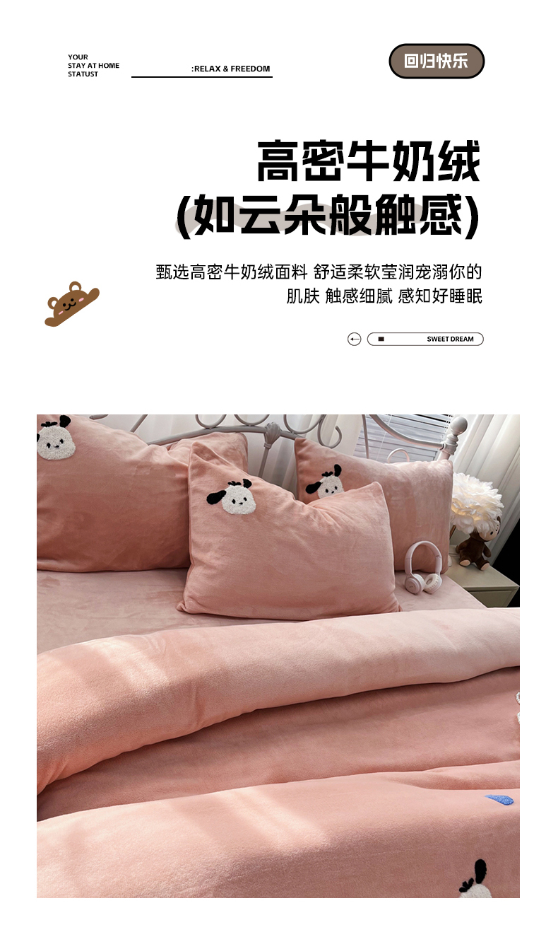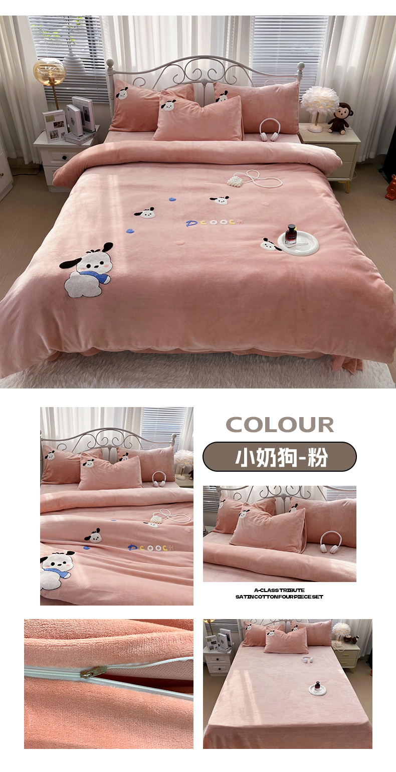 商品名称:逸林家纺《原希尔顿逸林》 2024新款牛奶绒毛巾绣四件套加厚立体卡通牛奶绒四件套 小奶狗-粉