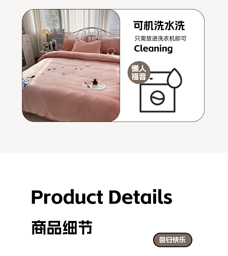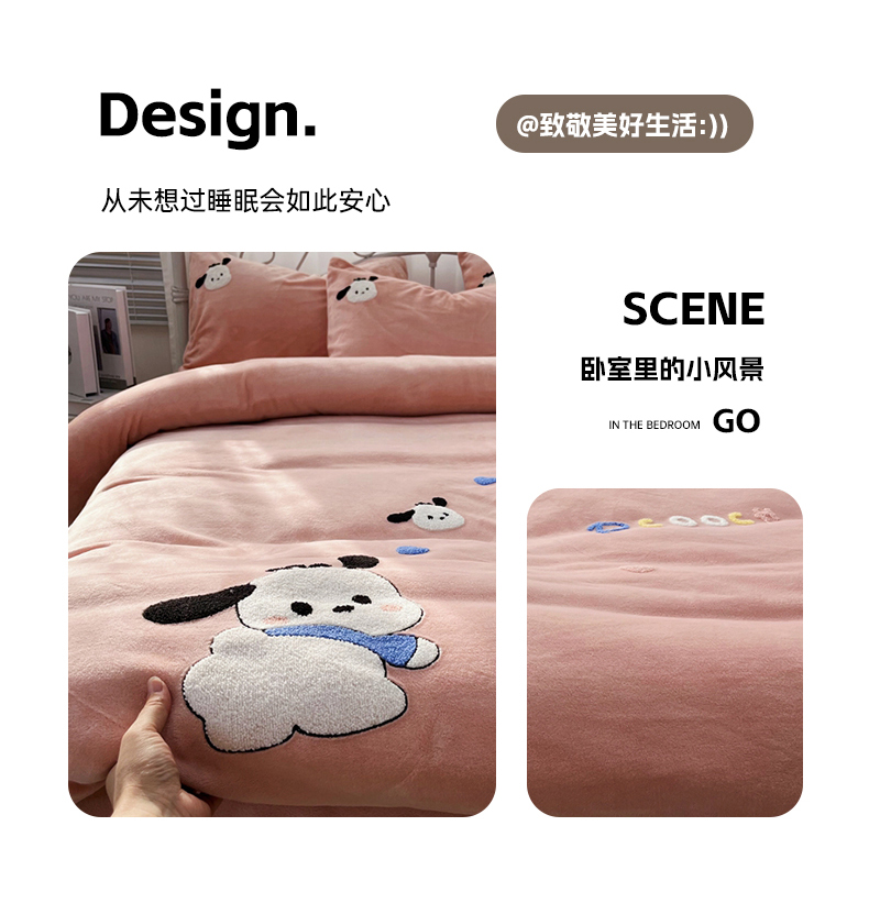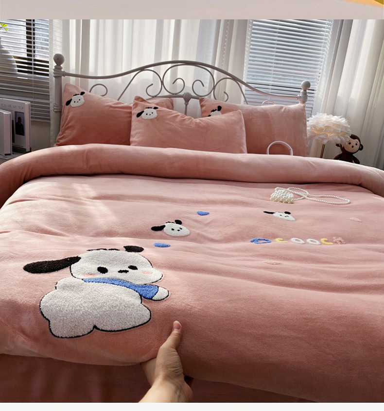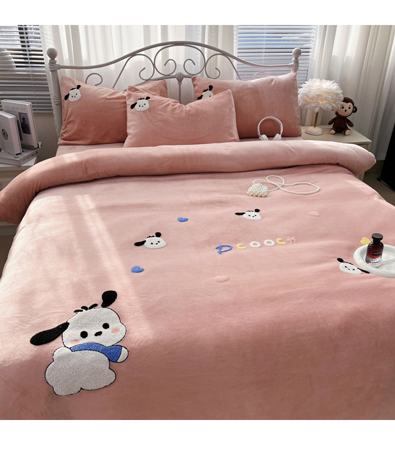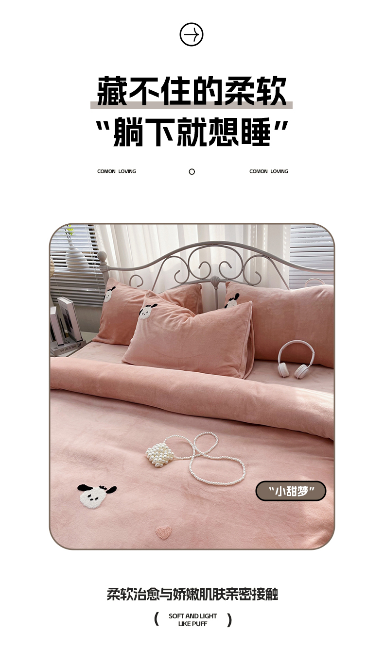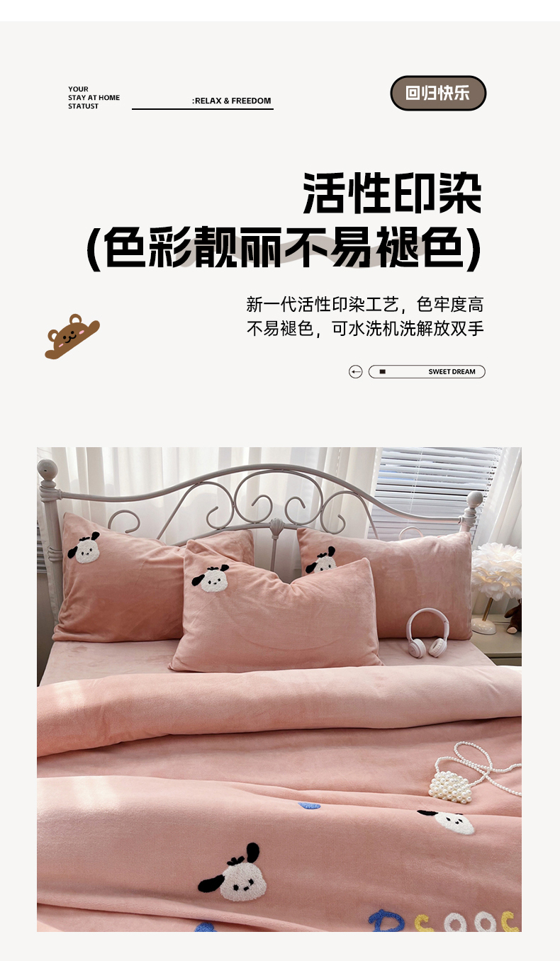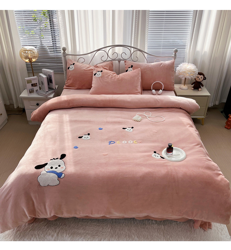 商品名称:逸林家纺《原希尔顿逸林》 2024新款牛奶绒毛巾绣四件套加厚立体卡通牛奶绒四件套 小奶狗-粉