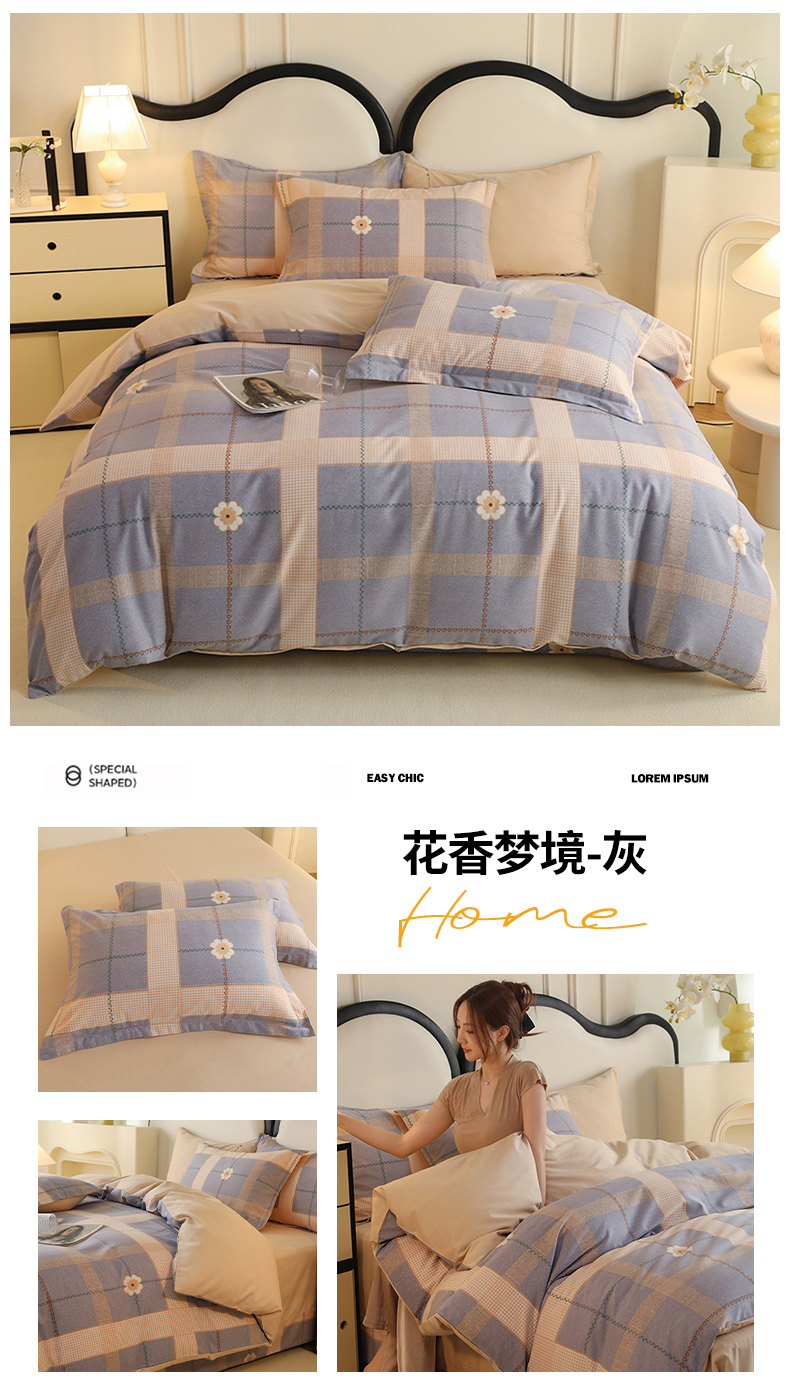 当前位置: 91家纺网 > 商品网购 > 床品套件 > 四件套 > 全棉普通四件套 > 巧玲珑2025新款AB版铂金生态四件套AB花香梦境-灰