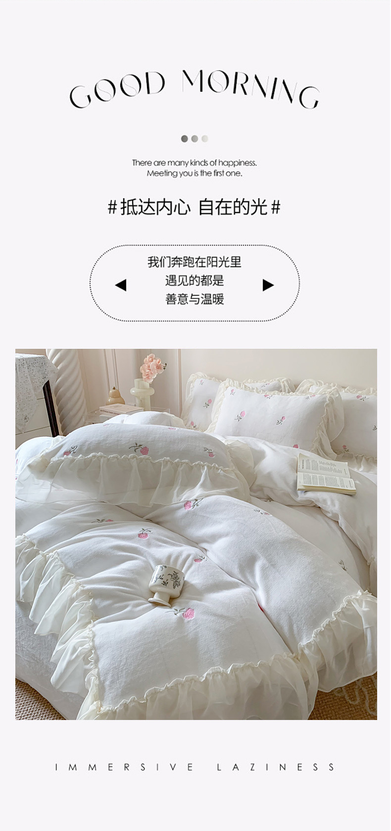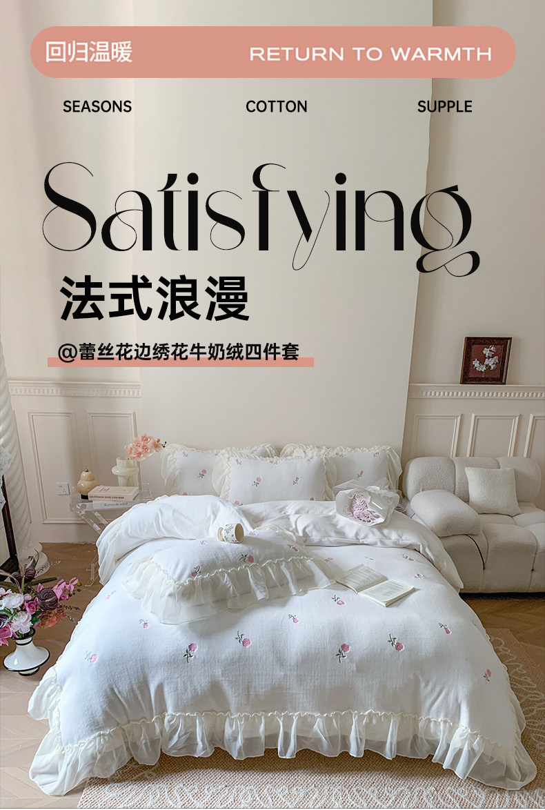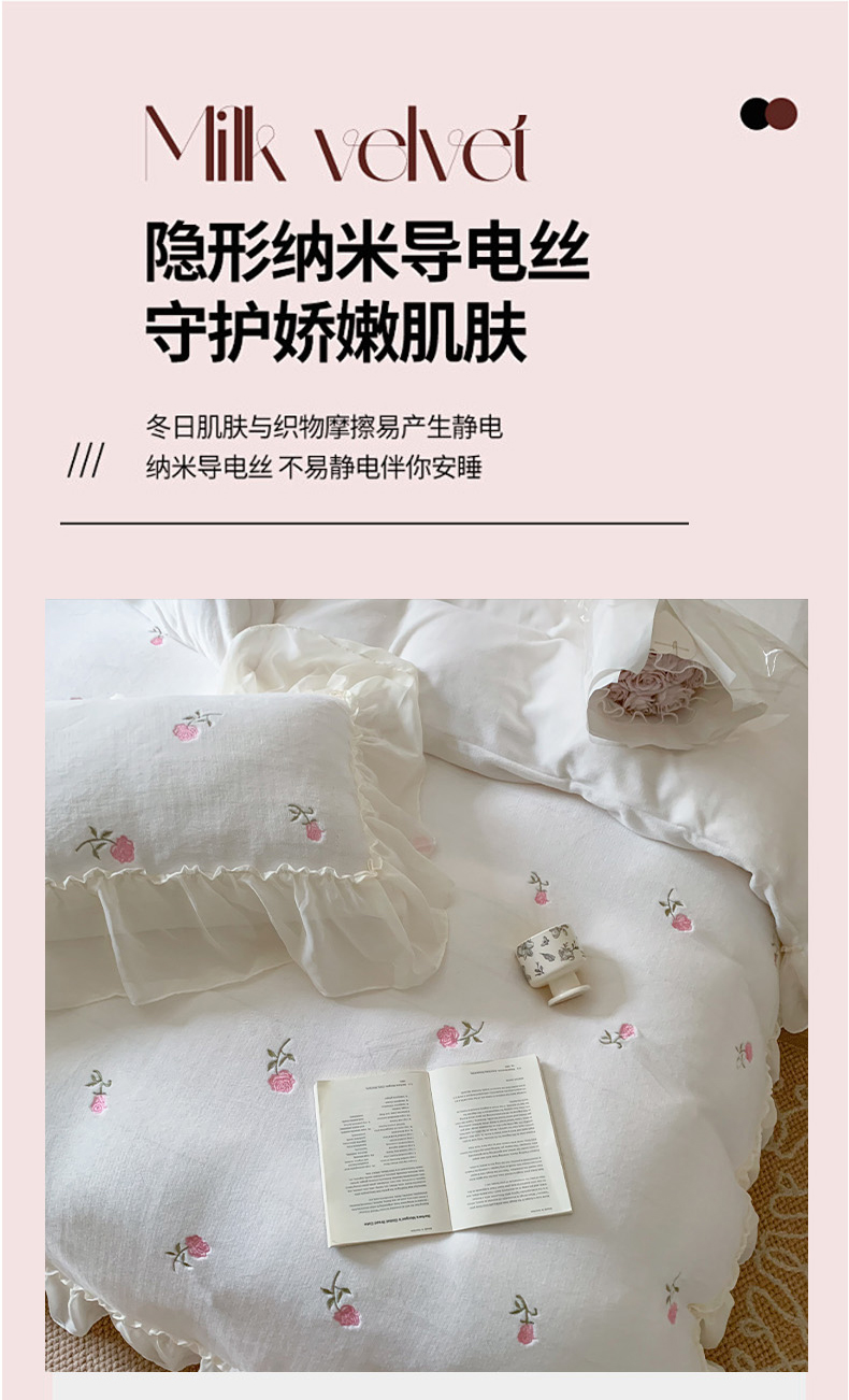 当前位置: 91家纺网 > 商品网购 > 床品套件 > 四件套 > 牛奶绒四件套 > 你好美丽 2025新款200克A类牛奶绒蕾丝花边工艺款四件套 安娜白粉