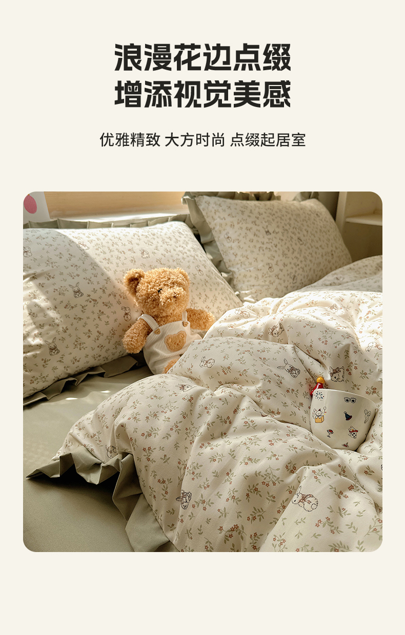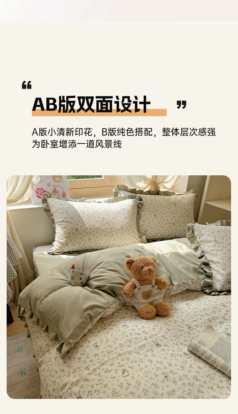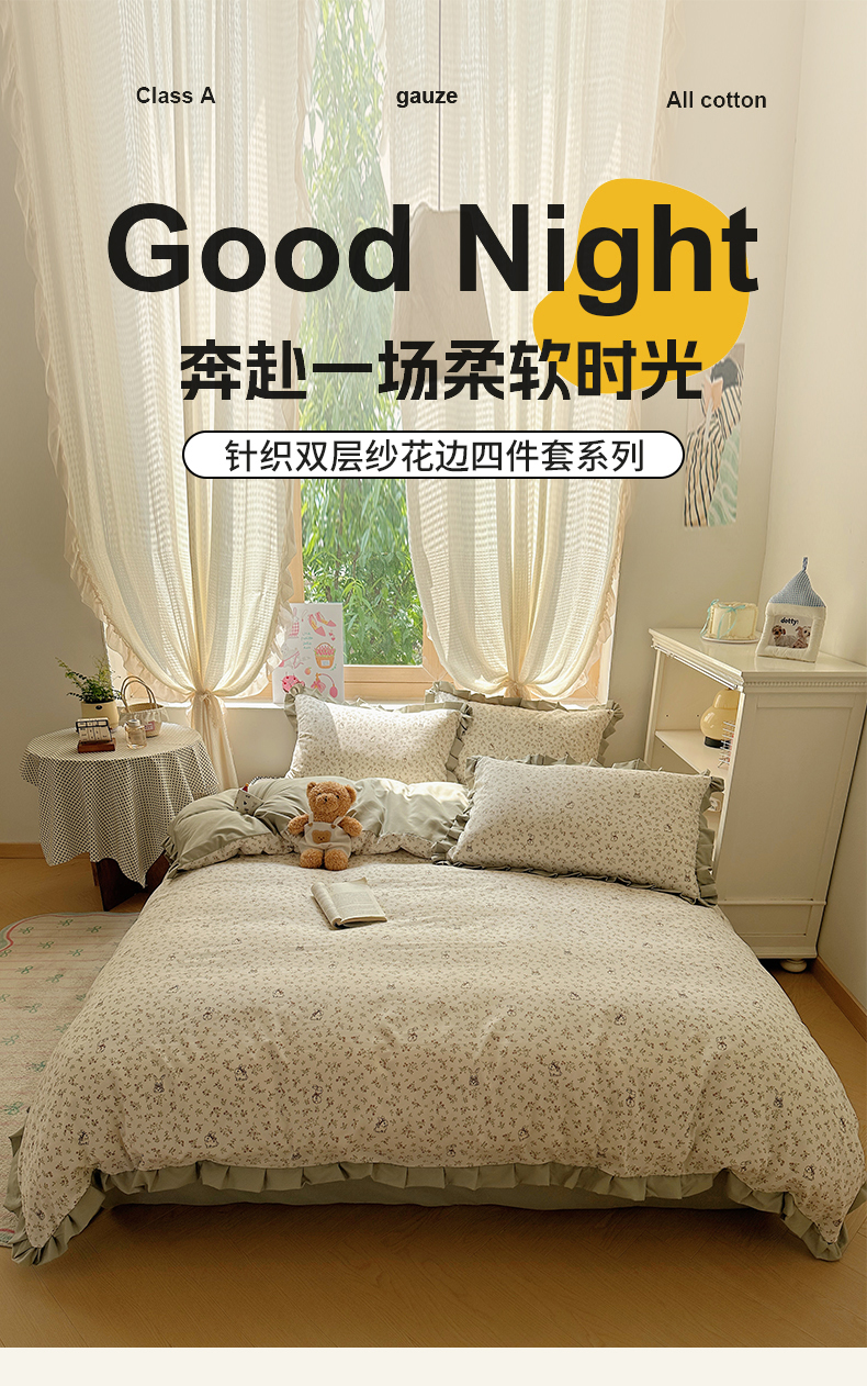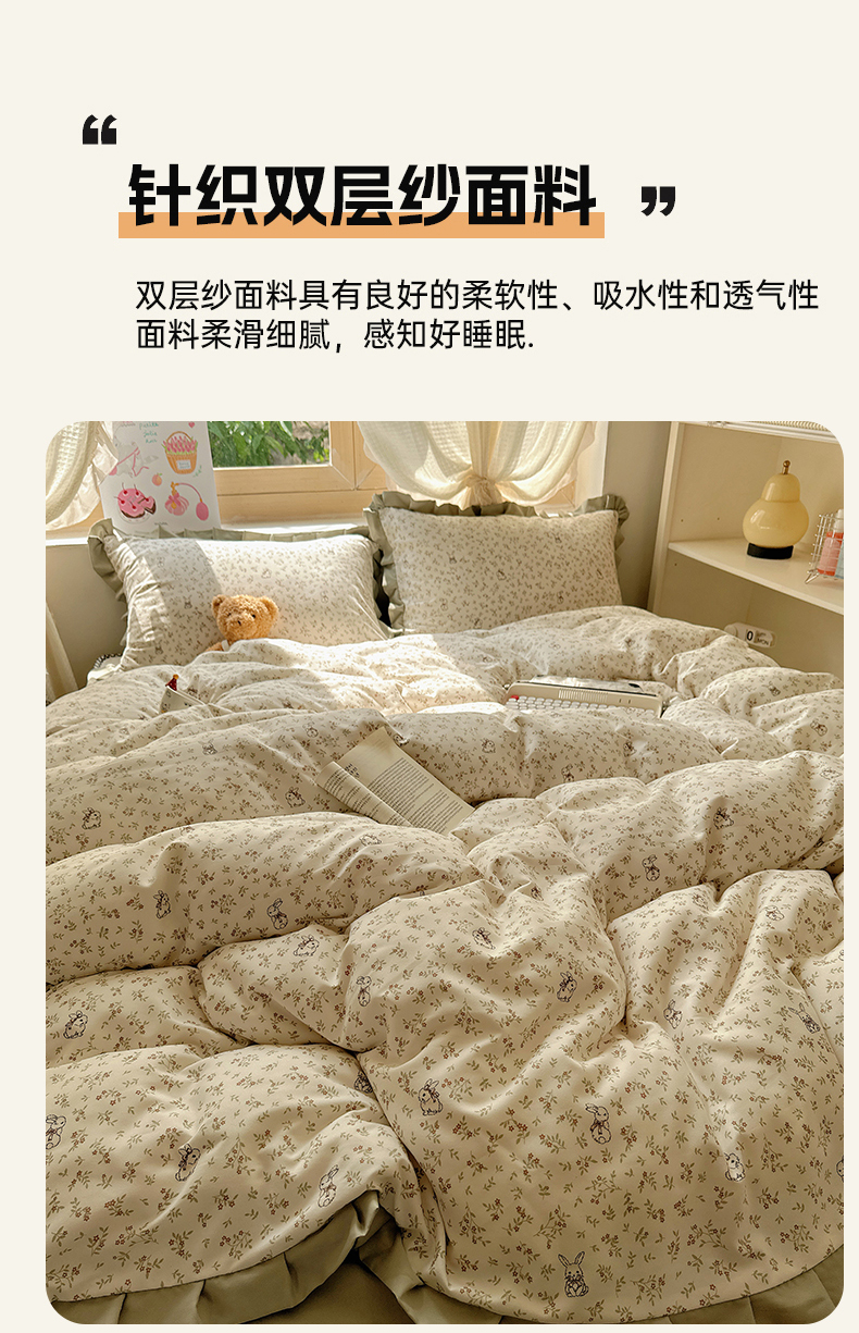 当前位置: 91家纺网 > 商品网购 > 床品套件 > 四件套 > 双层纱四件套 > 韩巢家纺 2025新款针织双层纱花边款被套直播热销款四件套学生宿舍床单三件套-(提供卖家秀) 花田薇