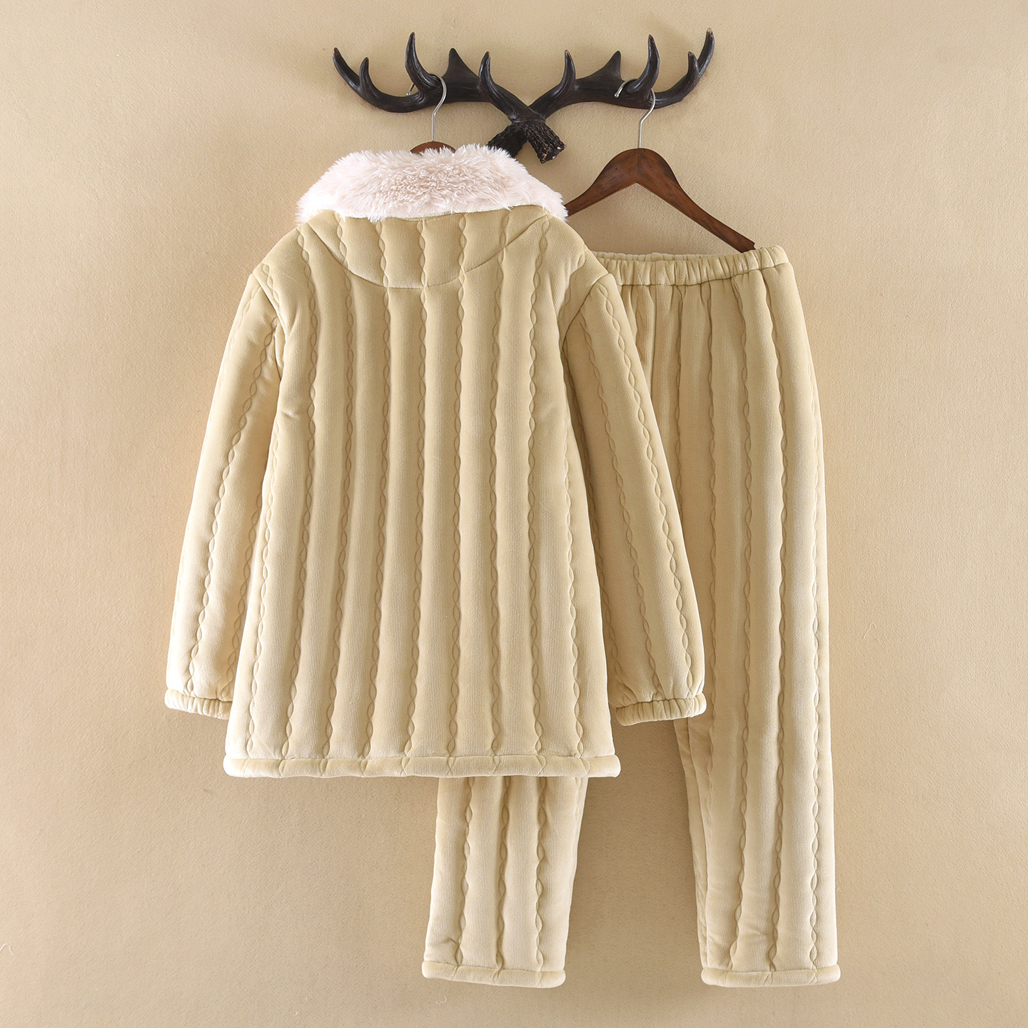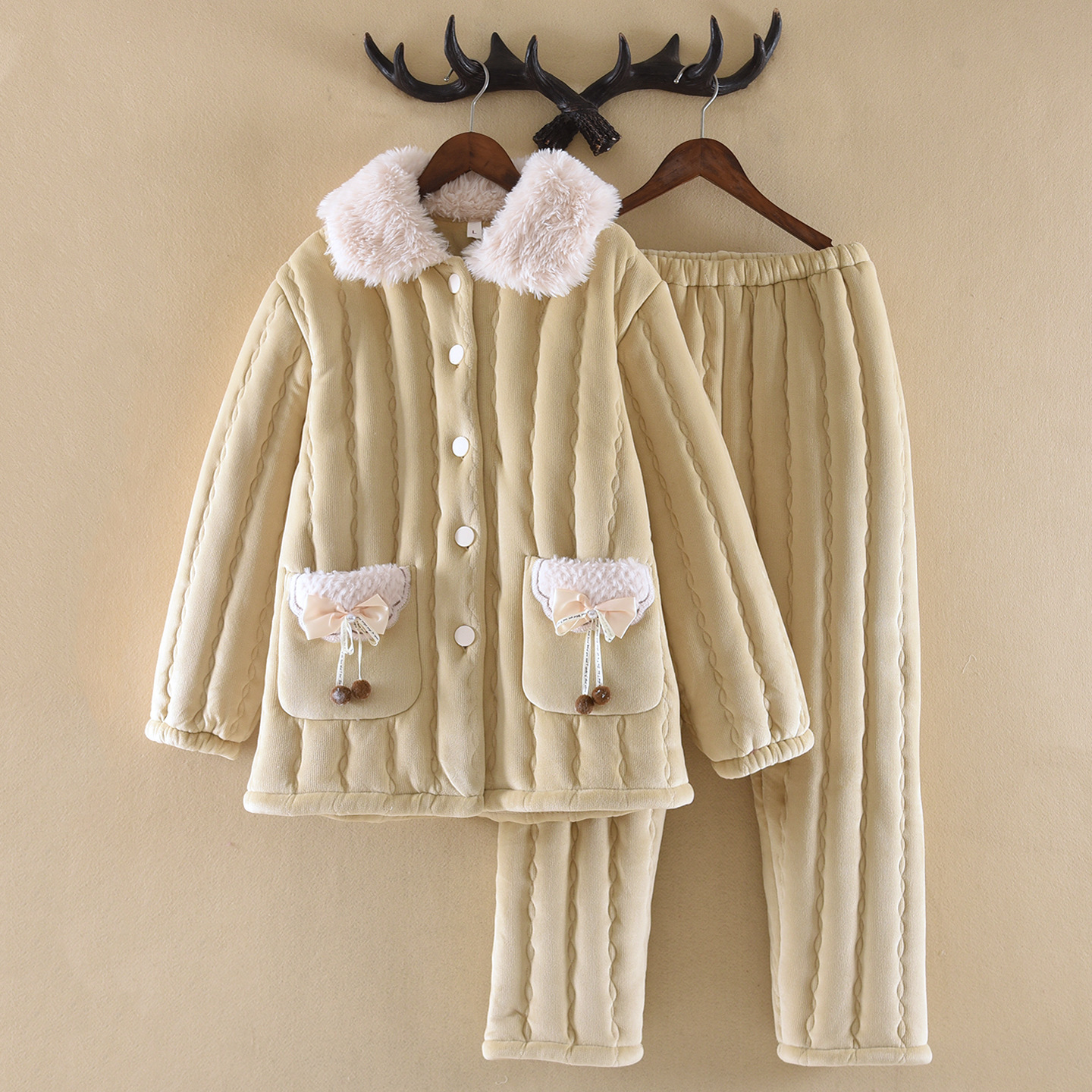 (总)洛兰沙家居馆 2024秋冬新款清新睡衣女三层夹棉玉兔绒加厚保暖两件套女士可外穿加绒家居服,粉色,黄色