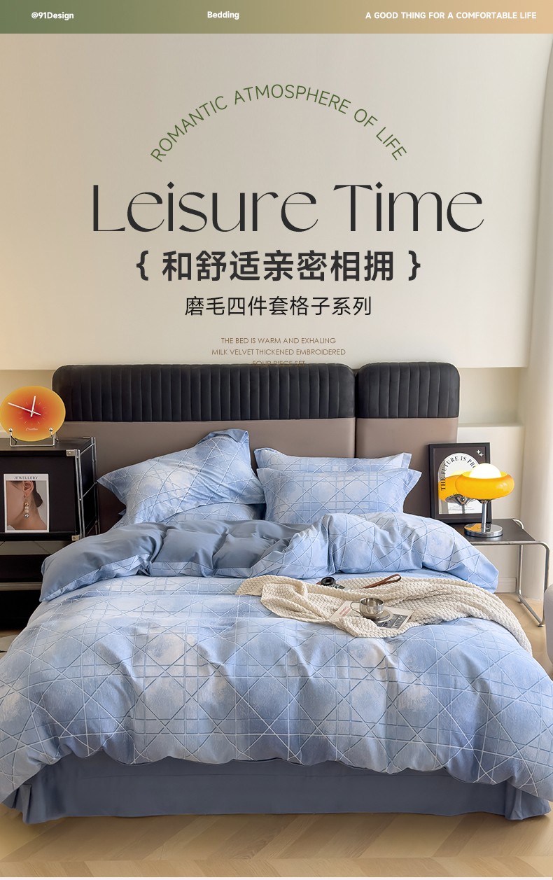 商品名称:佰亿莱 2024直播爆款简约风全棉磨毛四件套格子系列 简约-蓝