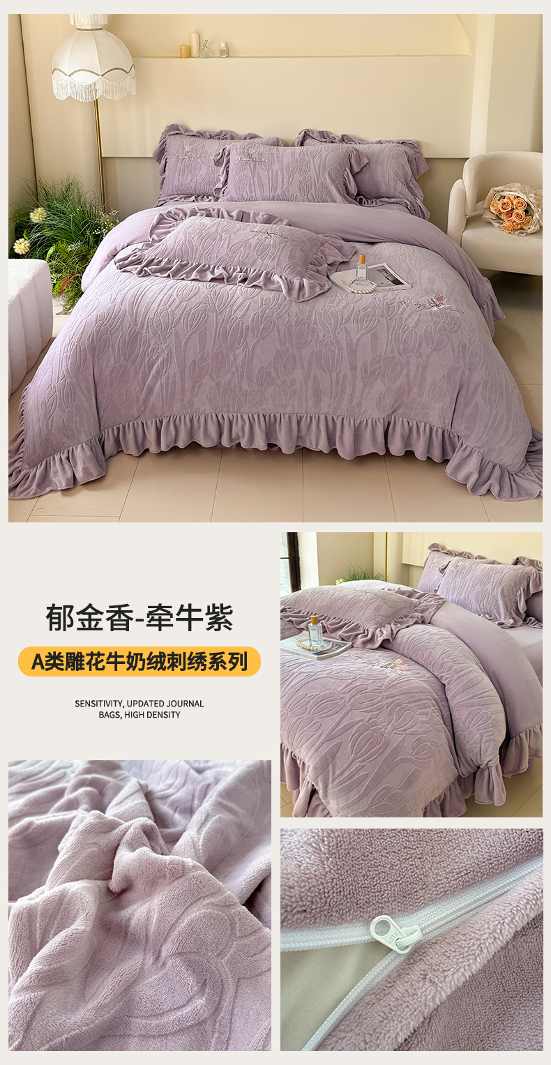 商品名称:娇逸家居 2024新款韩版A类雕花牛奶绒荷叶边刺绣款-郁金香 郁金香-牵牛紫