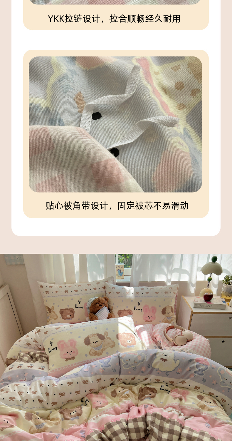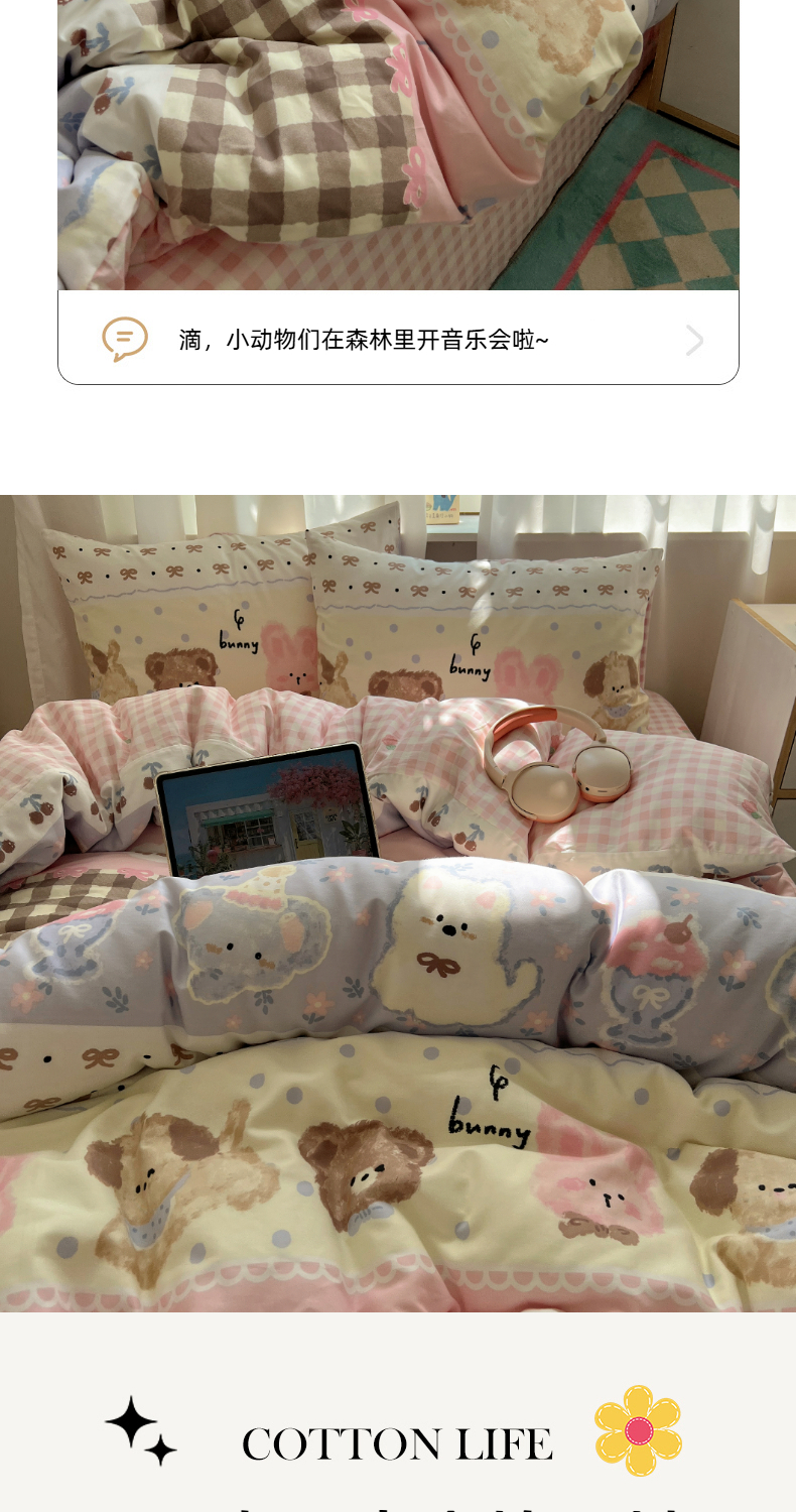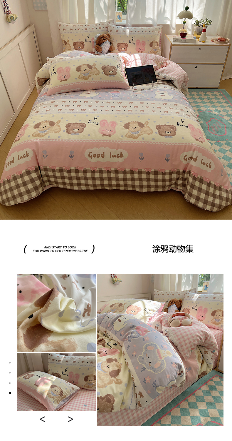 商品名称:六巷胡同 2025新款INS卡通减龄可爱风全棉四件套(开学季系列) 涂鸦动物集
