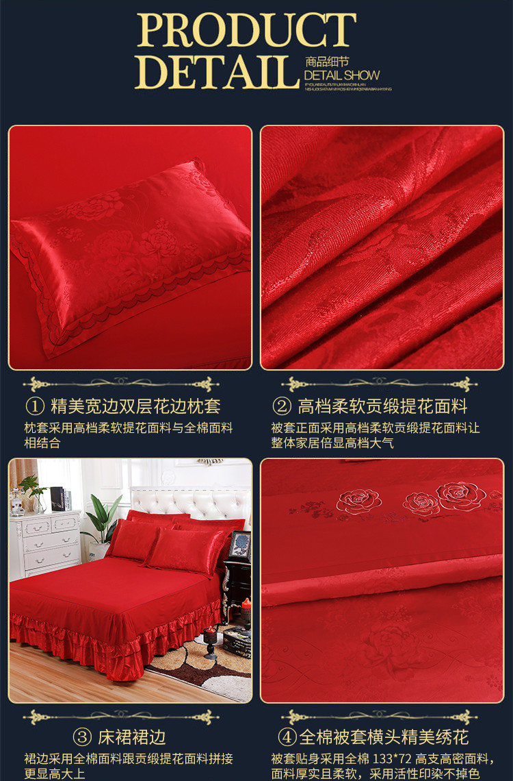 商品名称:福丽莱家纺 贡缎提花床裙四件套(单层)暖心芳妍-大红