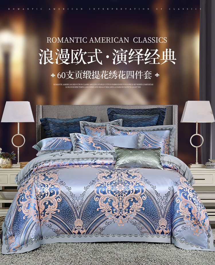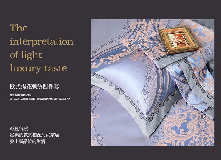 (总)柔觉家纺 天丝刺绣贡缎提花全棉四件套,艾利斯-兰金,宝琪-藕荷玉,罗娜恋歌-粉,奥威丽雅-蓝,奥薇丽雅(豆沙),龙凤交鸣(大红),罗娜恋歌-红玉,情恋花语(大红),罗兰庄园-靛蓝,莫奈情怀-蓝金,叶语浪漫-浅紫,约瑟情调-灰金,约瑟情调-魅紫,雅普诺-卡兰,小憩-雪青,科西利亚-金色,雅普诺-红灰,水汐-绸缎兰