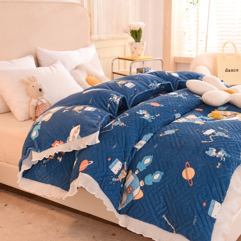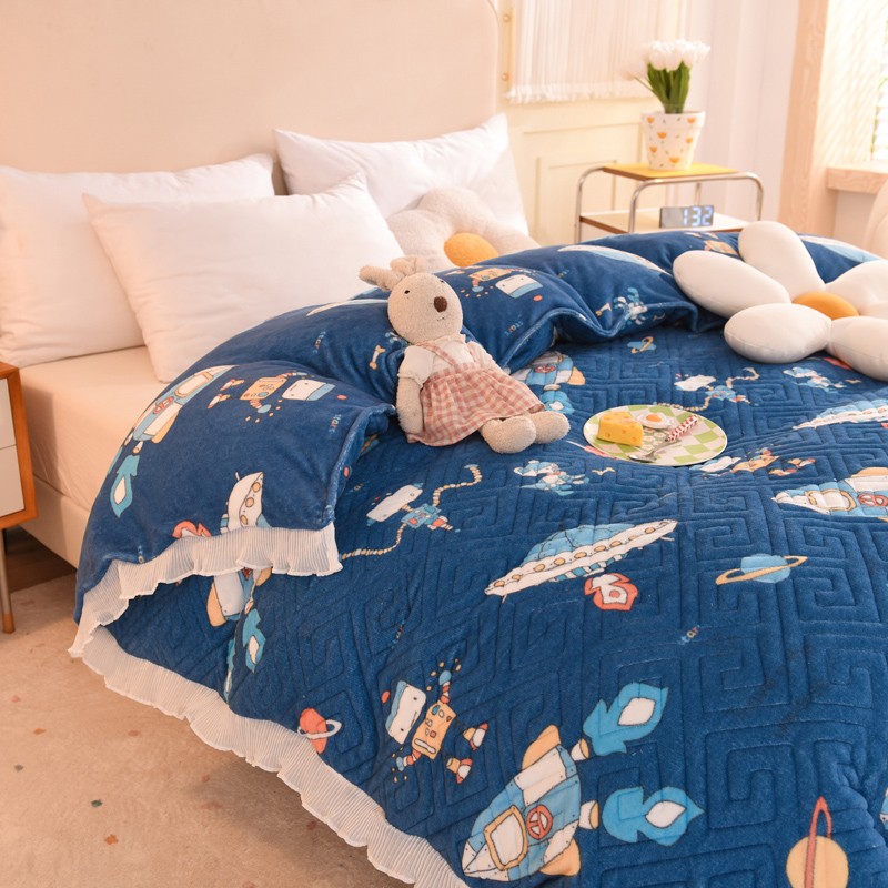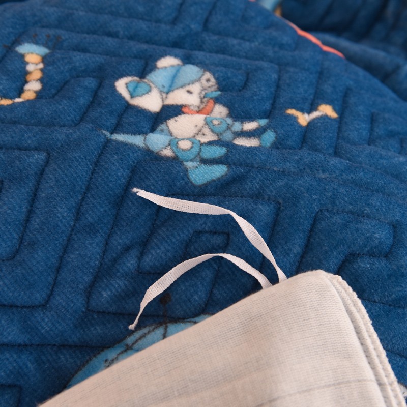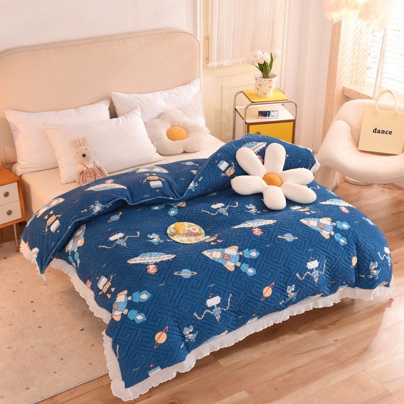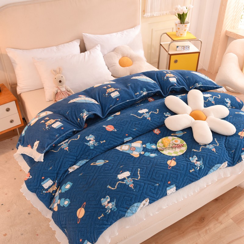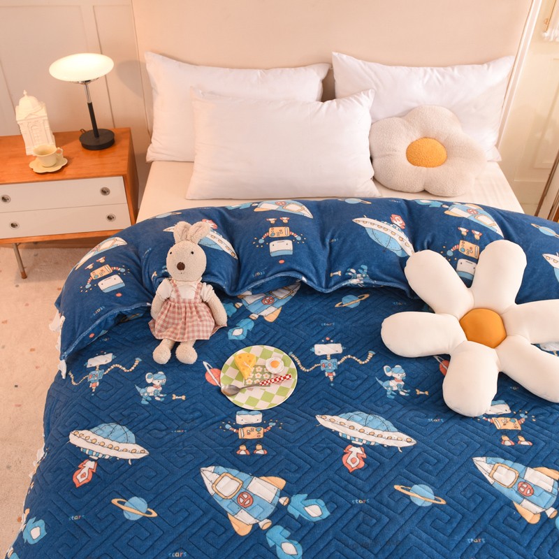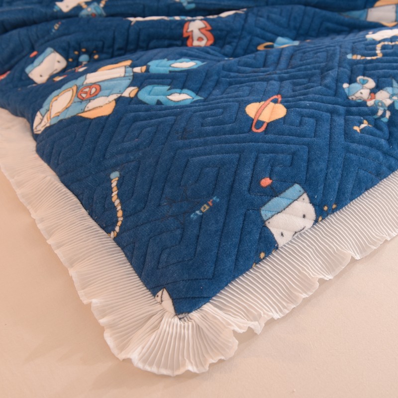2025新款牛奶绒印花夹棉花边 单品被套 太空机器人北卡蓝