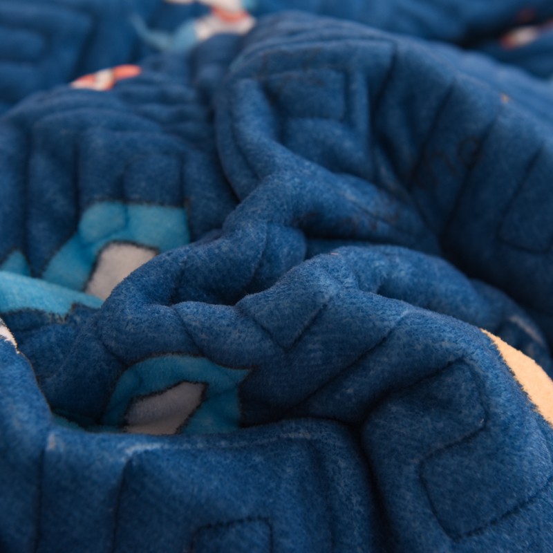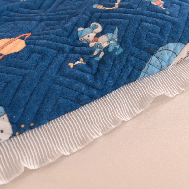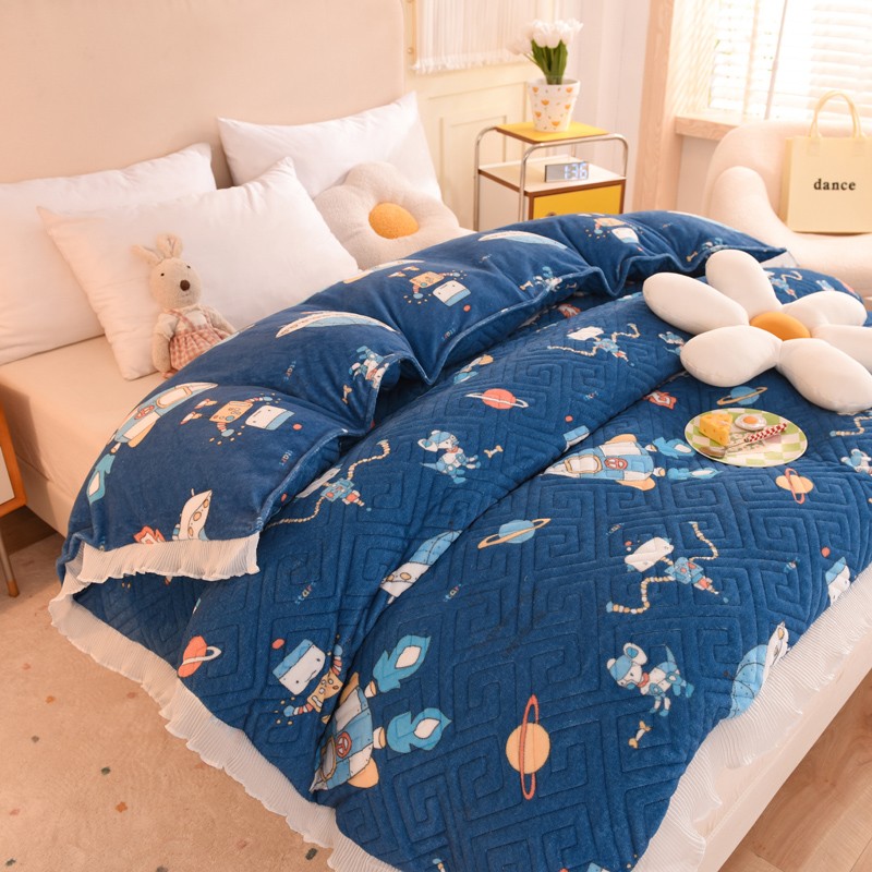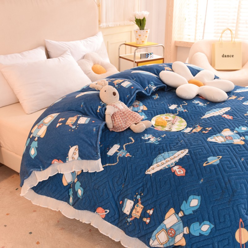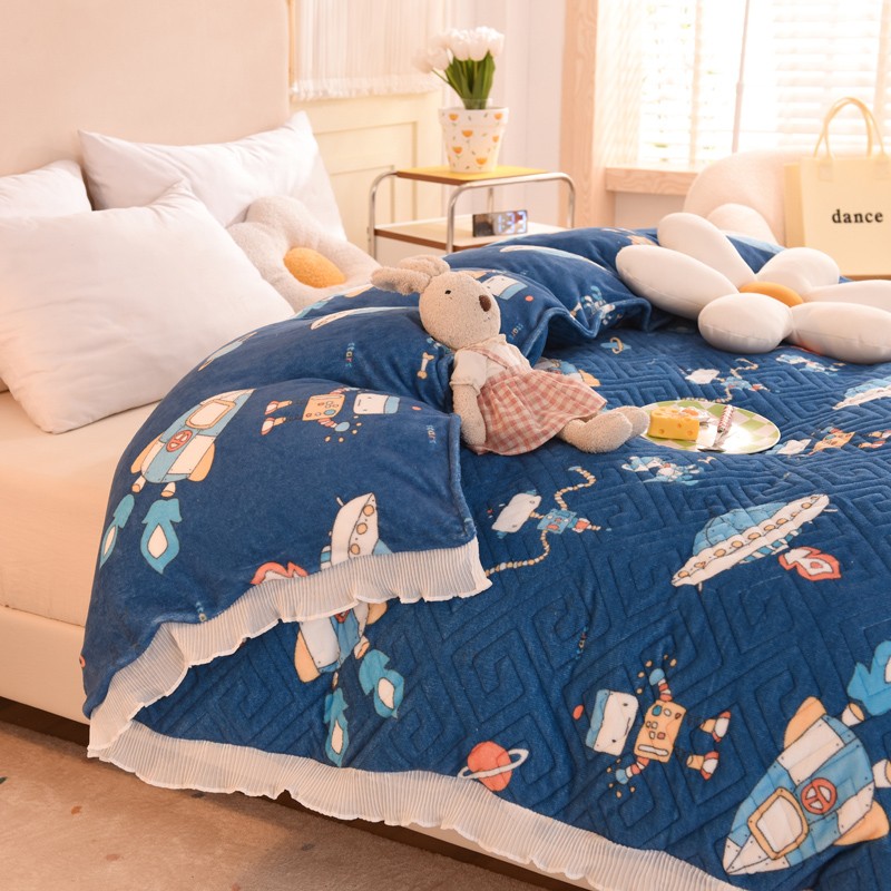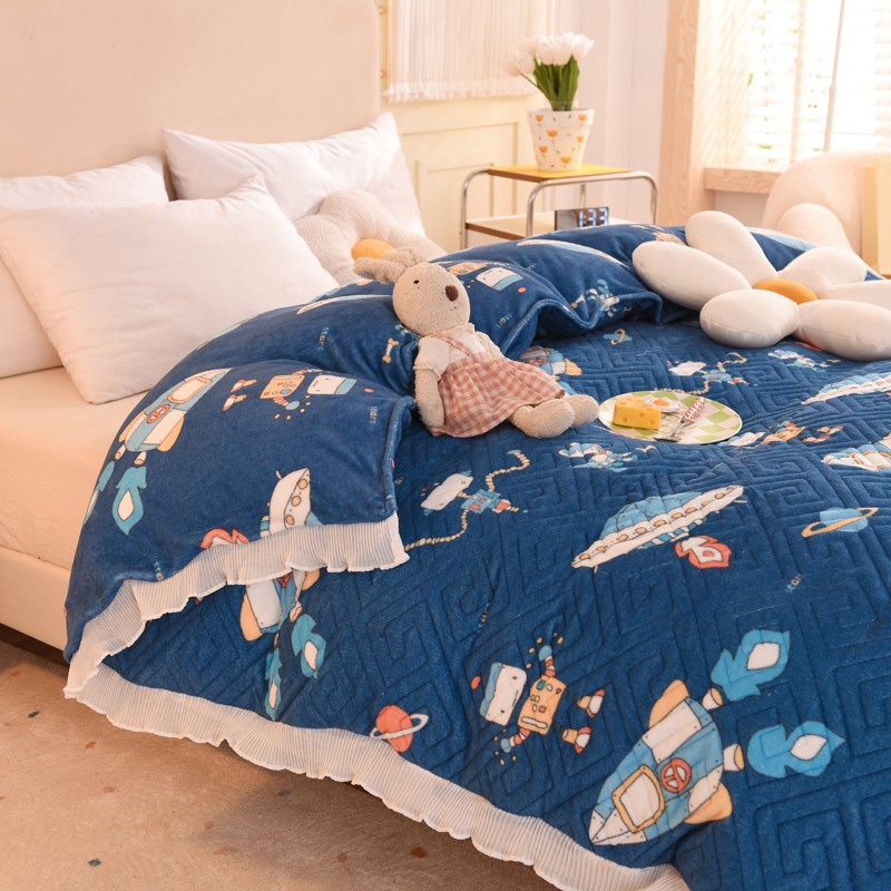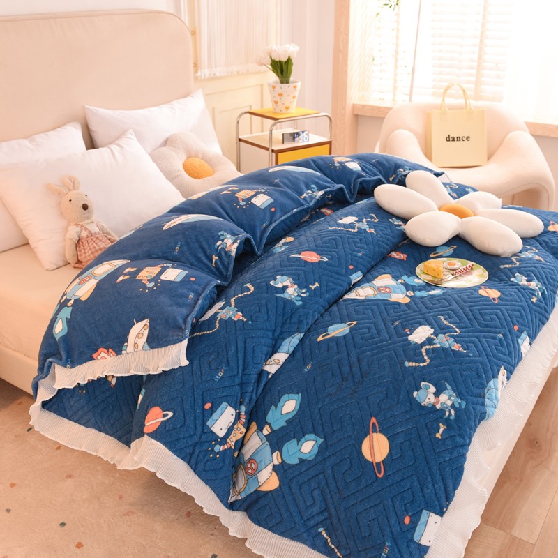 2025新款牛奶绒印花夹棉花边 单品被套 太空机器人北卡蓝
