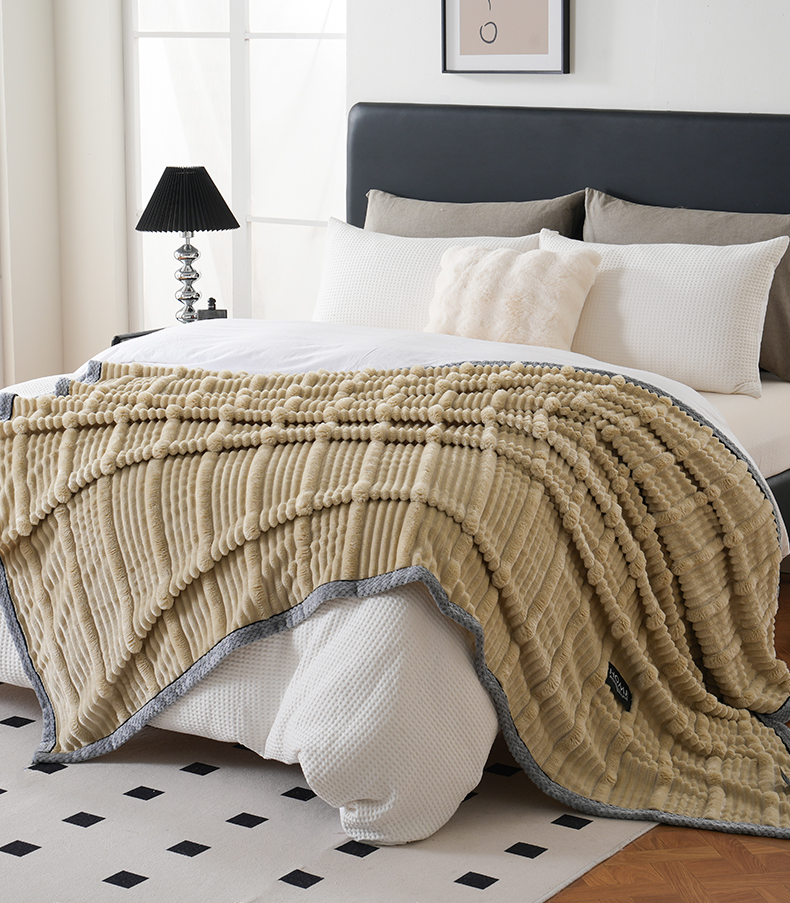 巴木赫 2024新款子母抽条兔毛绒绒毯毯子 浅驼