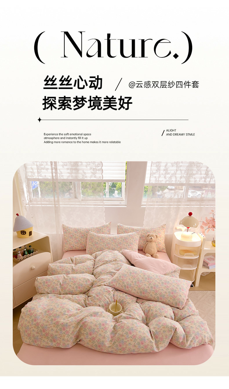 当前位置: 91家纺网 > 商品网购 > 床品套件 > 四件套 > 双层纱四件套 > 优品阁 2025新款云感皱皱纱四件套 蔷薇花园