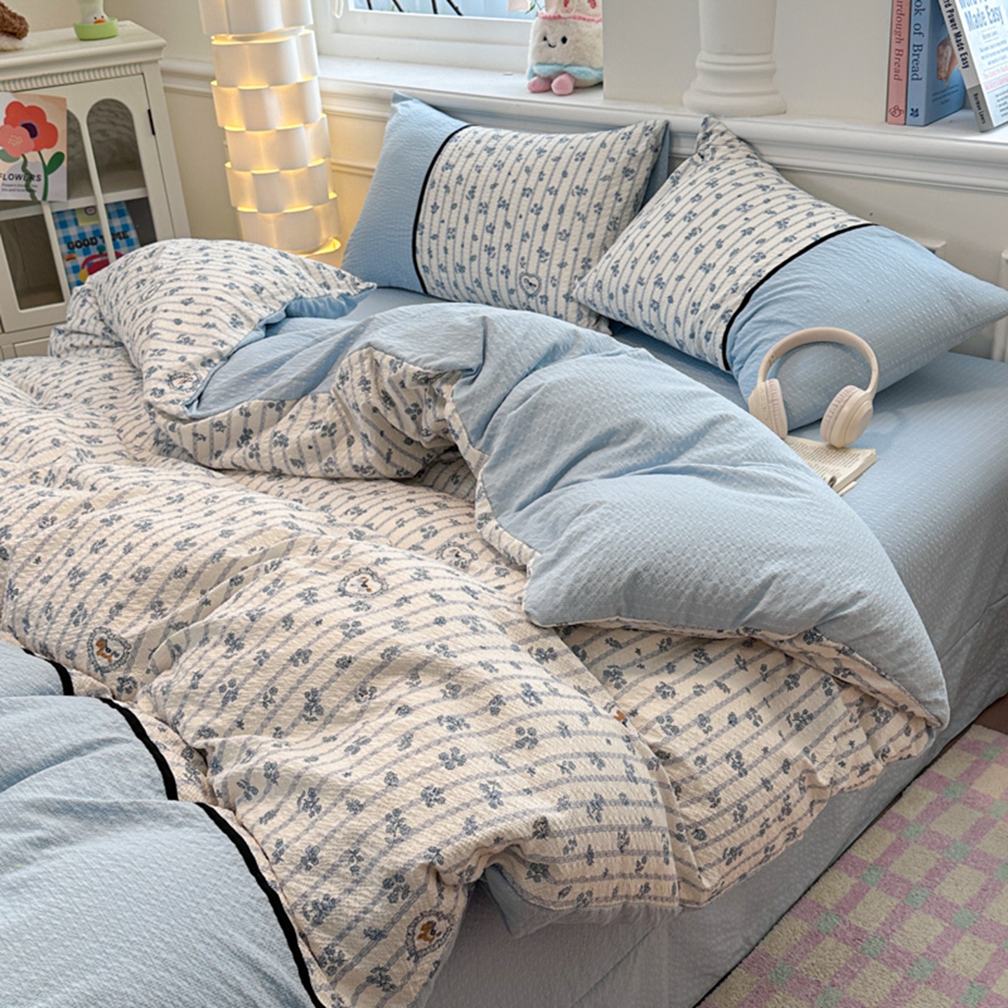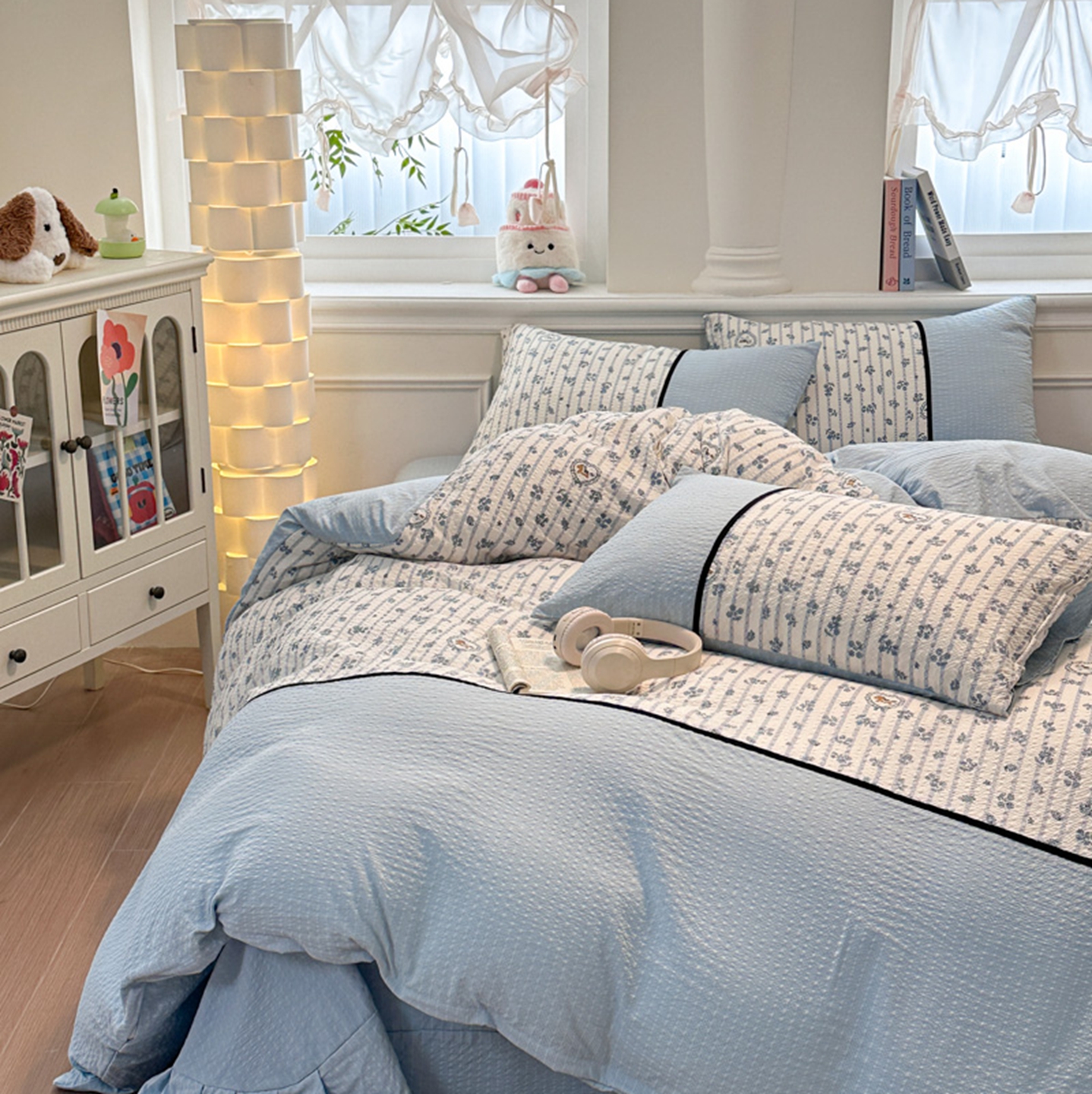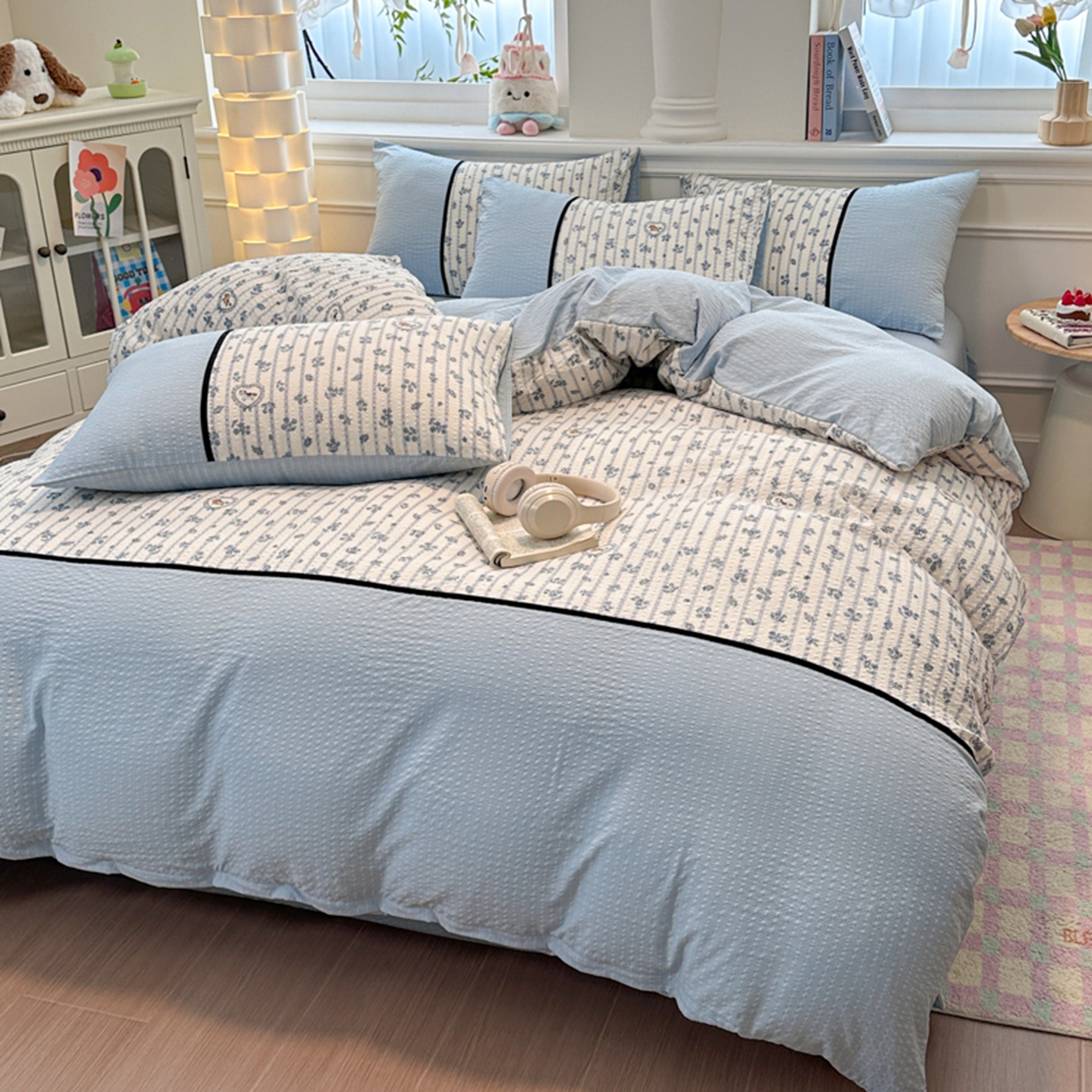 诺梵家纺 2026春夏新品高克重拼接泡芙纱泡泡皱皱纱四件套 蓝雾花
